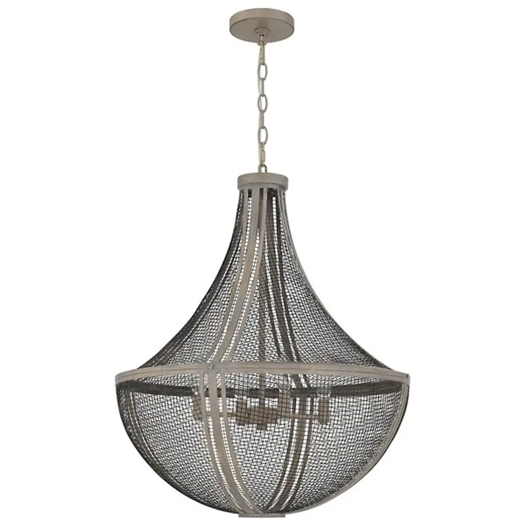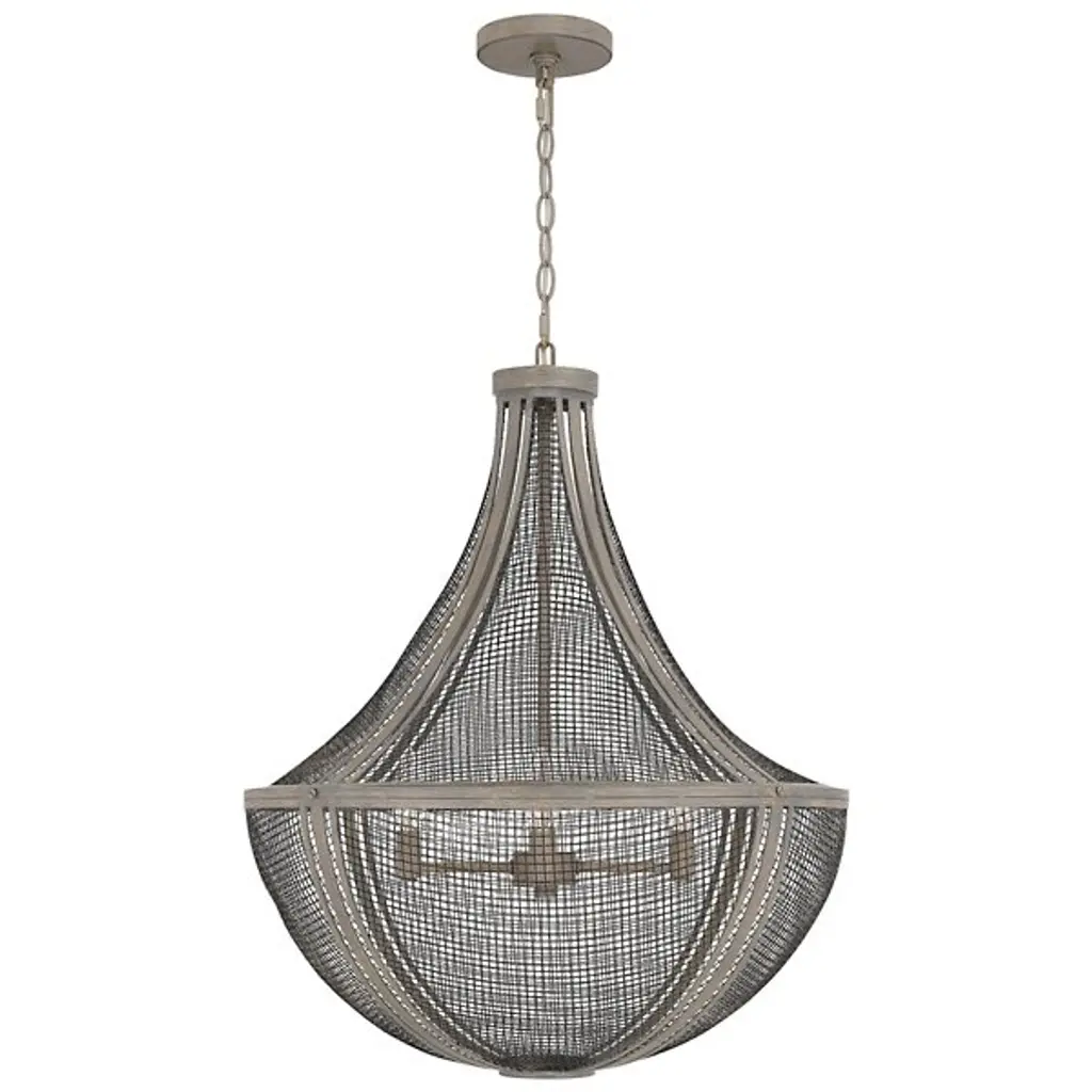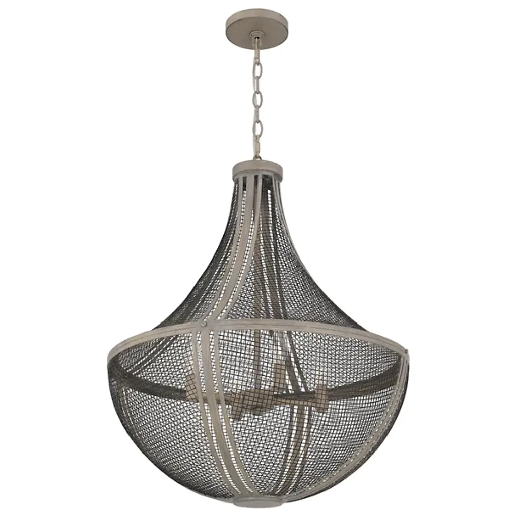 Enchanting its surroundings with an open global design, Quoizel's Hallie Pendant features a metal mesh shade and a captivating distressed grey wood finish. The fusion of the grey wood-themed accent over its steel frame evokes modern farmhouse charm, making a bold visual impact in foyers, hallways, living rooms, or home offices. Suspended from a circular canopy by a chain, its open design offers versatile functionality and style. Damp-listed for durability, this pendant intersects transitional aesthetics, infusing any interior setting with a refined yet rustic allure.