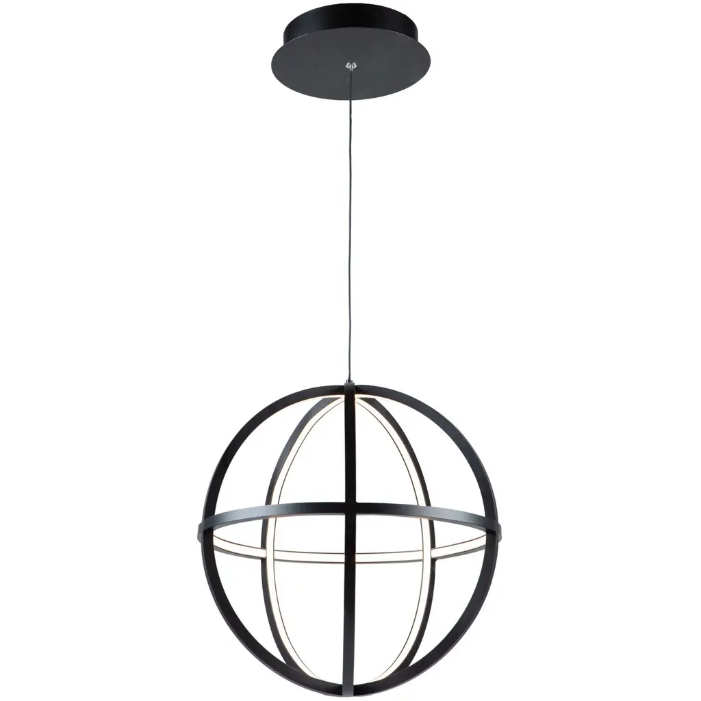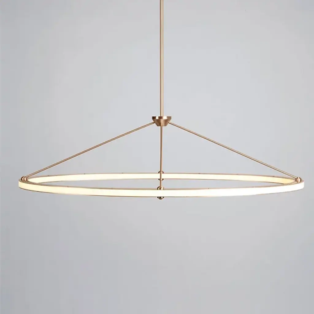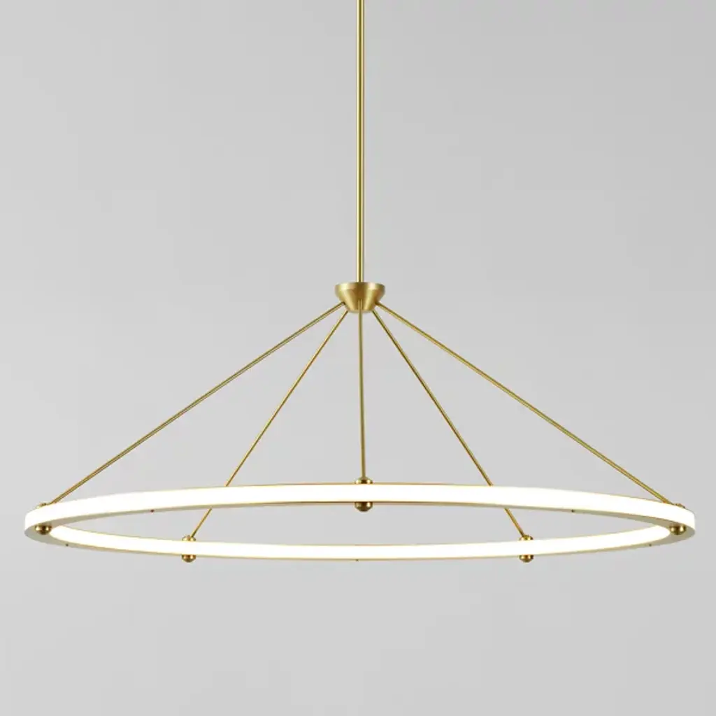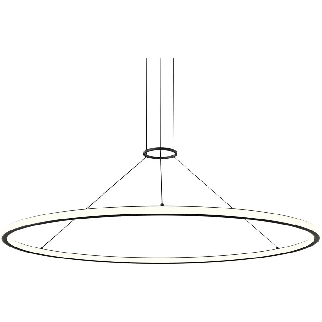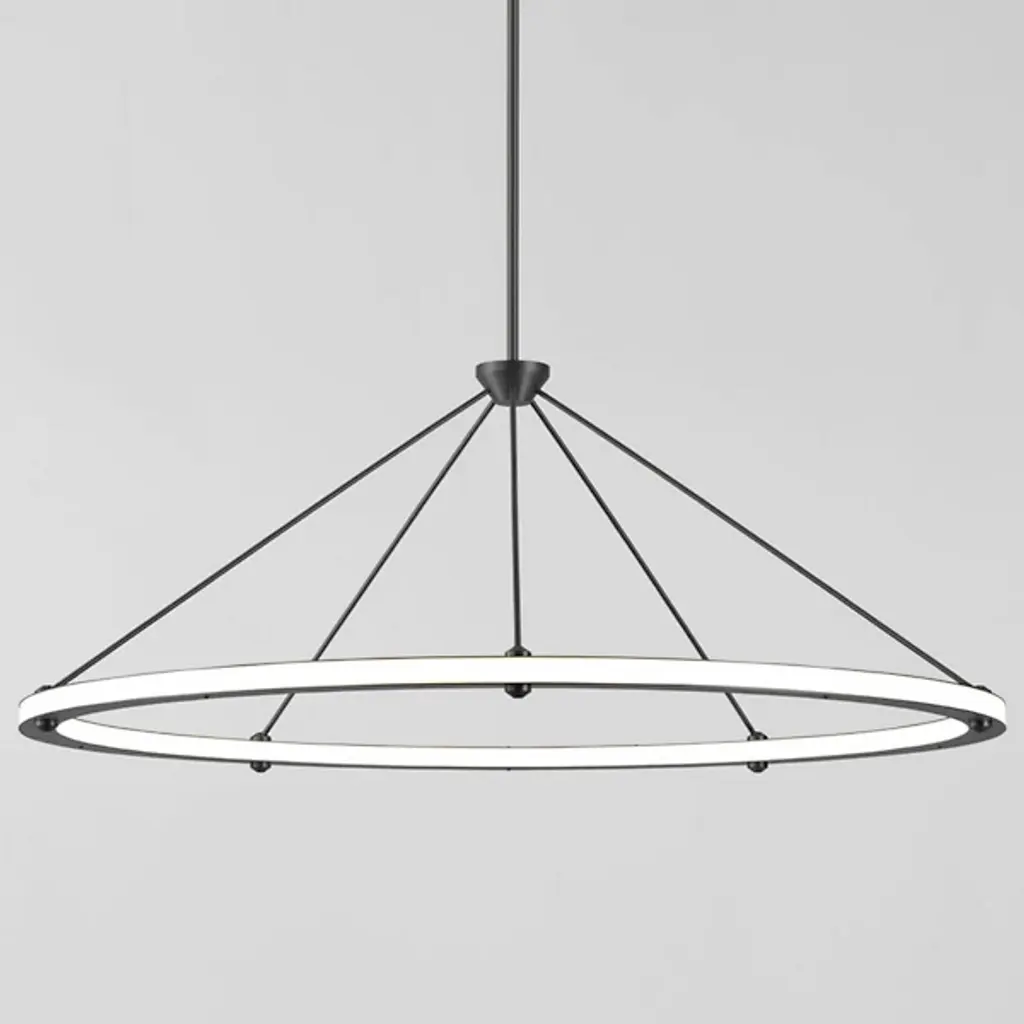 Add an open, elegant presence to high-ceiling spaces with the Halo Circle LED Pendant Light from Roll & Hill. Its steel structure, designed by Paul Loebach, is anchored by a round canopy and descends along a slender central stem to an inverted, conical hub, extending slender, angular struts to a layered ring structure below. An acrylic diffuser is compressed between two slender rings, reducing brightness from the sides to a pleasing, even glow that gleams off the metalwork.