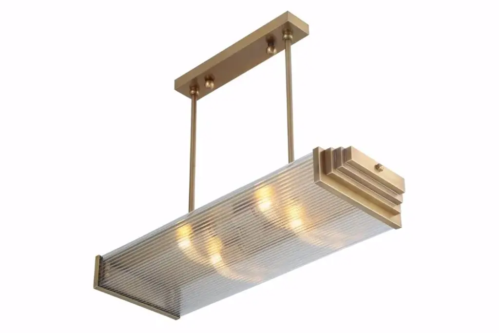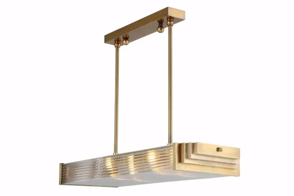Hamburg I is a suspension lamp made of brass available in different finishes.Finishes: Antique, Shiny brass, Matt brass, Shiny nickel, Matt nickelCapacity : 4x60 W E14The stair-shaped form decor on either or both ends of the lights is the distinguishing décor of this modern collection. Clear tubes diffuse the light making lovely light refractions on its surface. The collection is a perfect choice for interiors of average size with standard ceiling heights with a minimalist design approach where the angular form is the basis.
