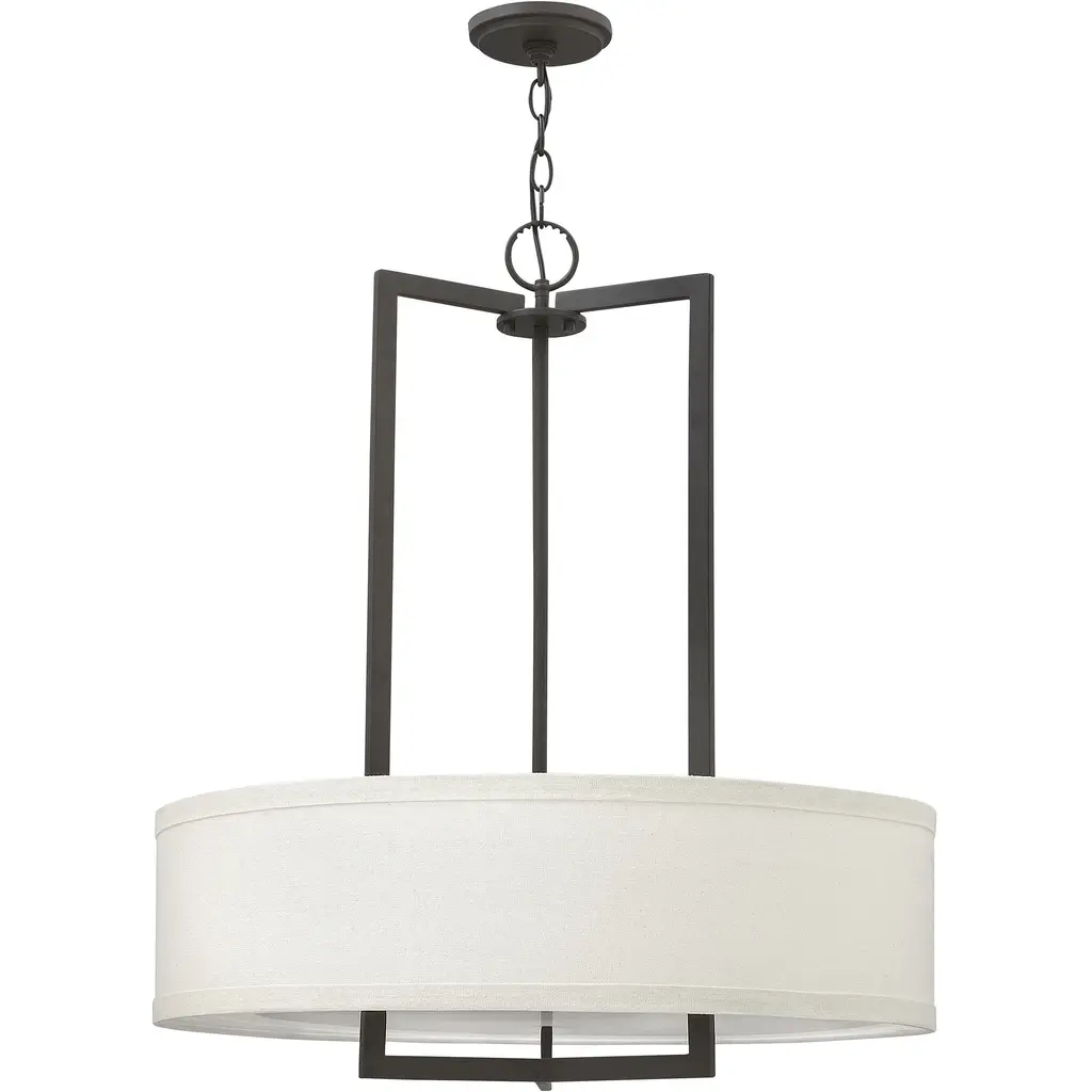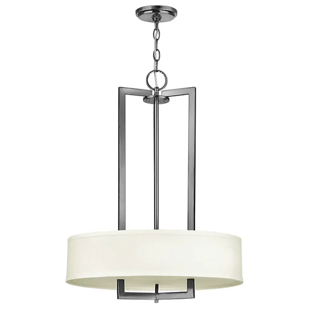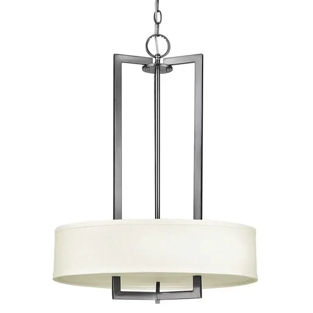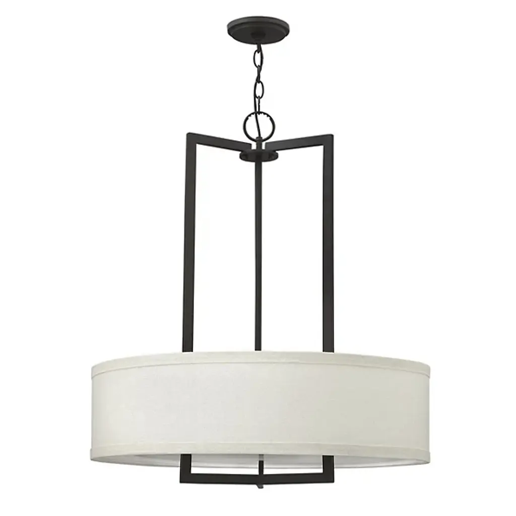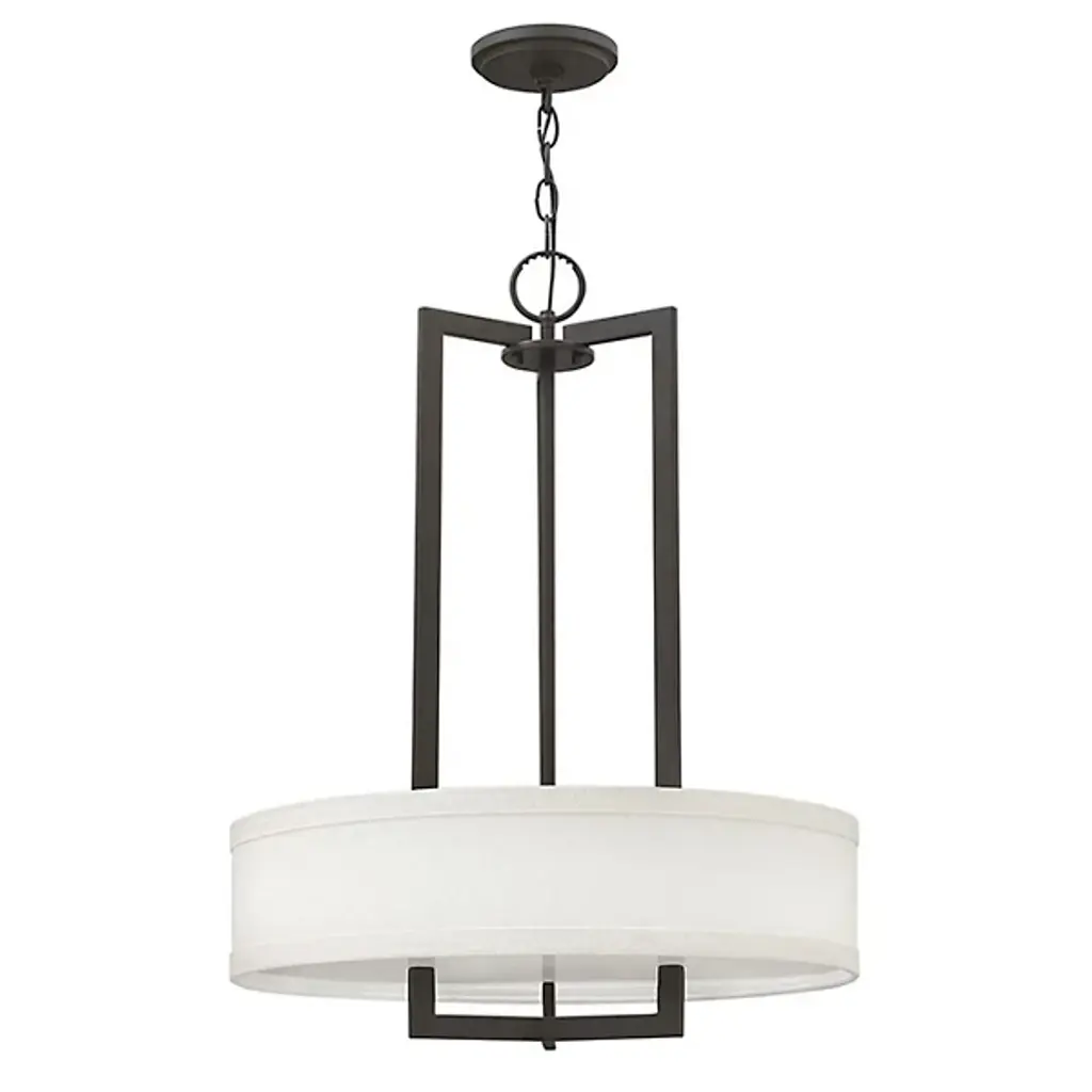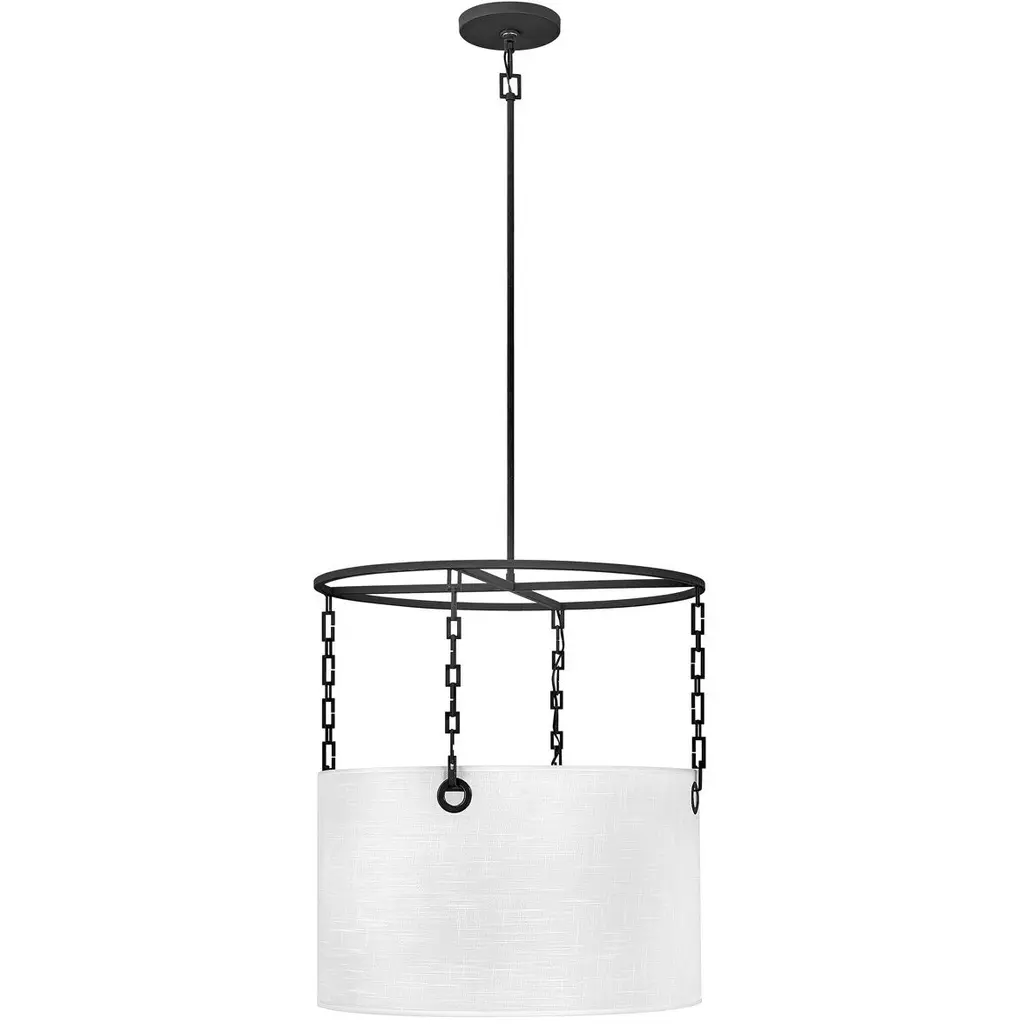 The strength and design simplicity of the metal frame is the focus of the Hinkley Lighting Hampton Drum Pendant. At the bottom of the frame, three lights are housed beneath a single drum-shaped hardback soft linen shade. Available in two finishes and three sizes to accommodate any entryway or dining room, large or small.
