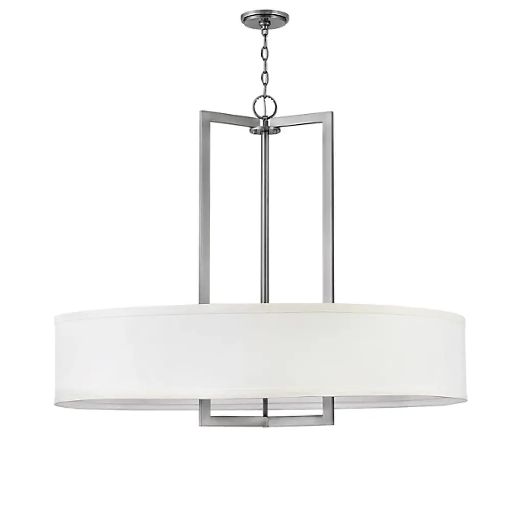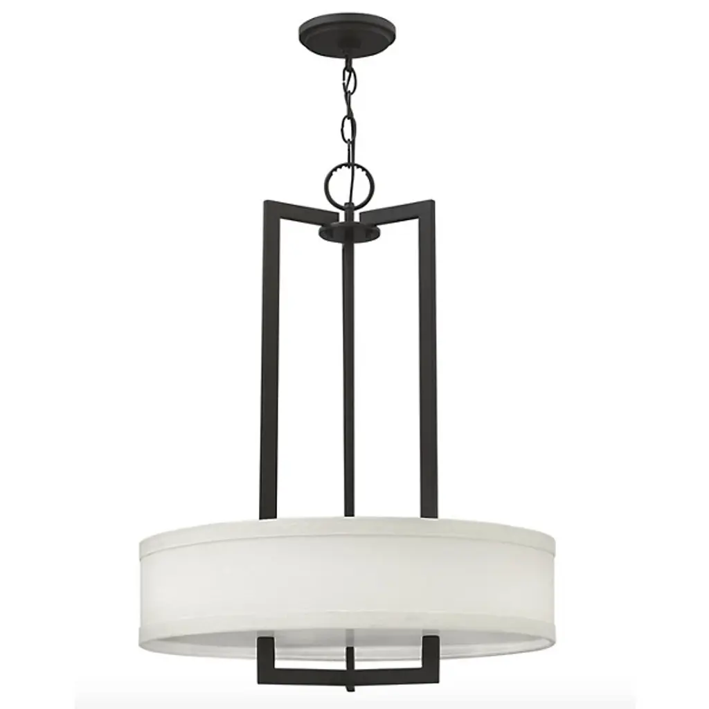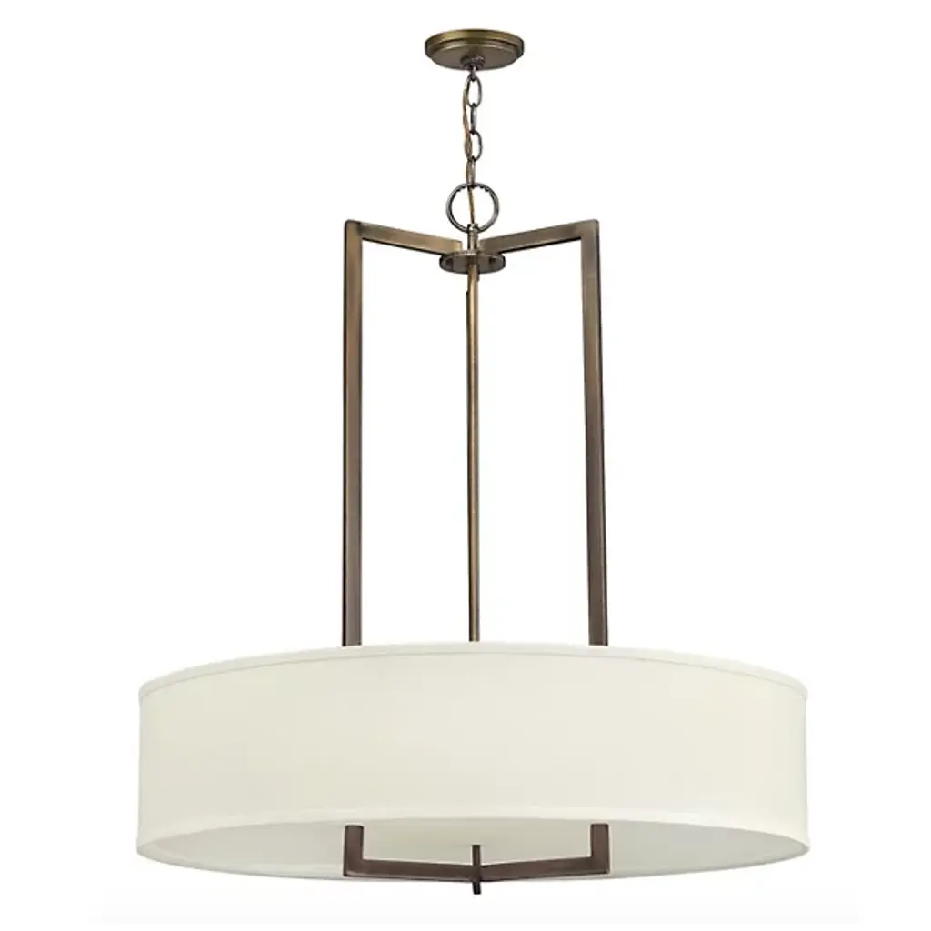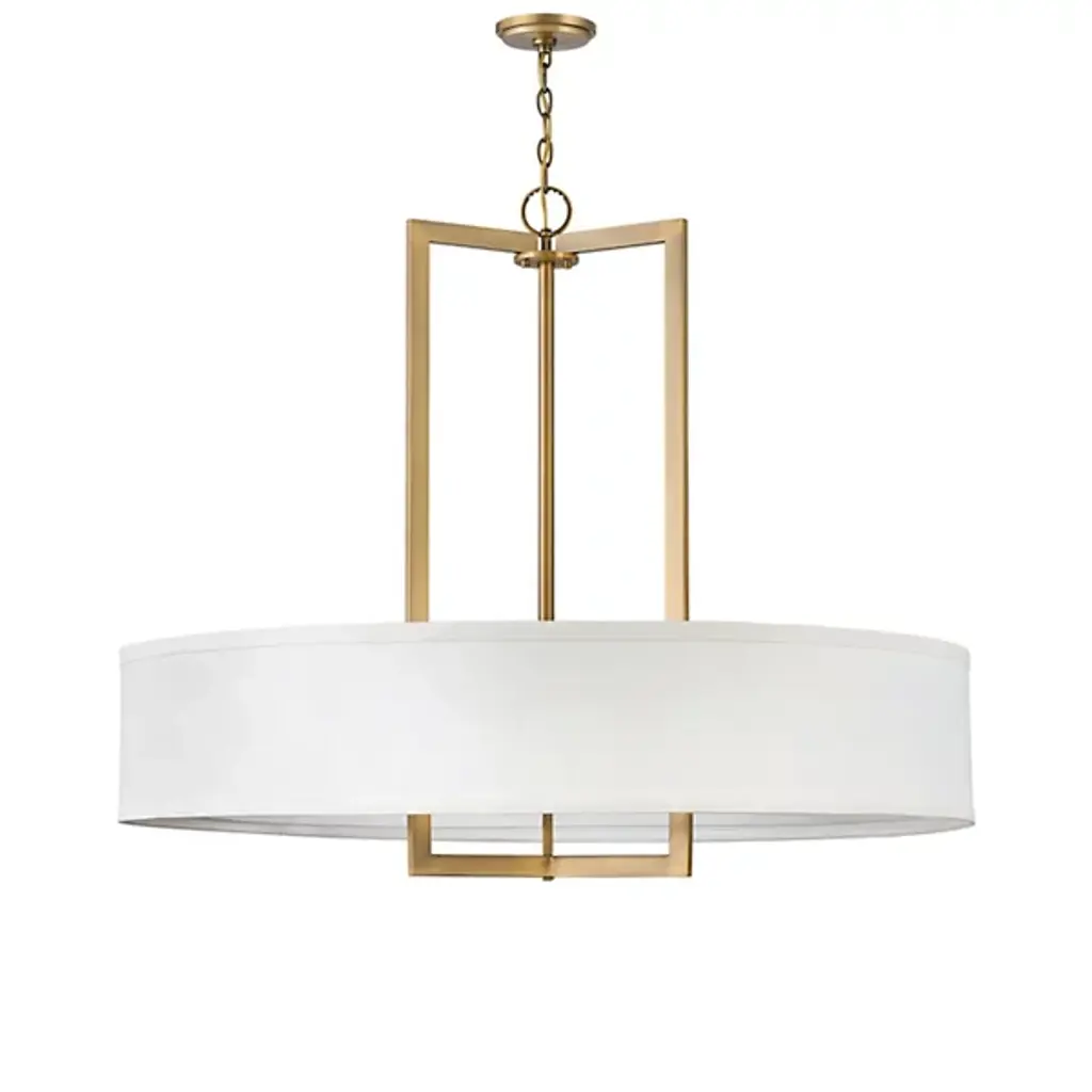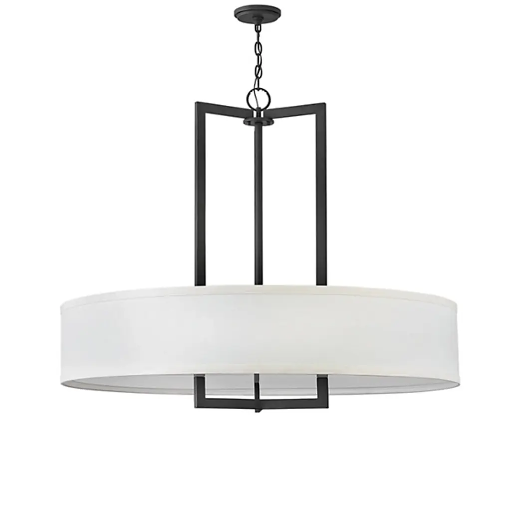 The strength and design simplicity of the metal frame is the focus of the Hinkley Lighting Hampton Drum Pendant. At the bottom of the frame, three lights are housed beneath a single drum-shaped hardback soft linen shade. Available in two finishes and three sizes to accommodate any entryway or dining room, large or small.