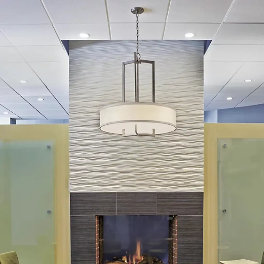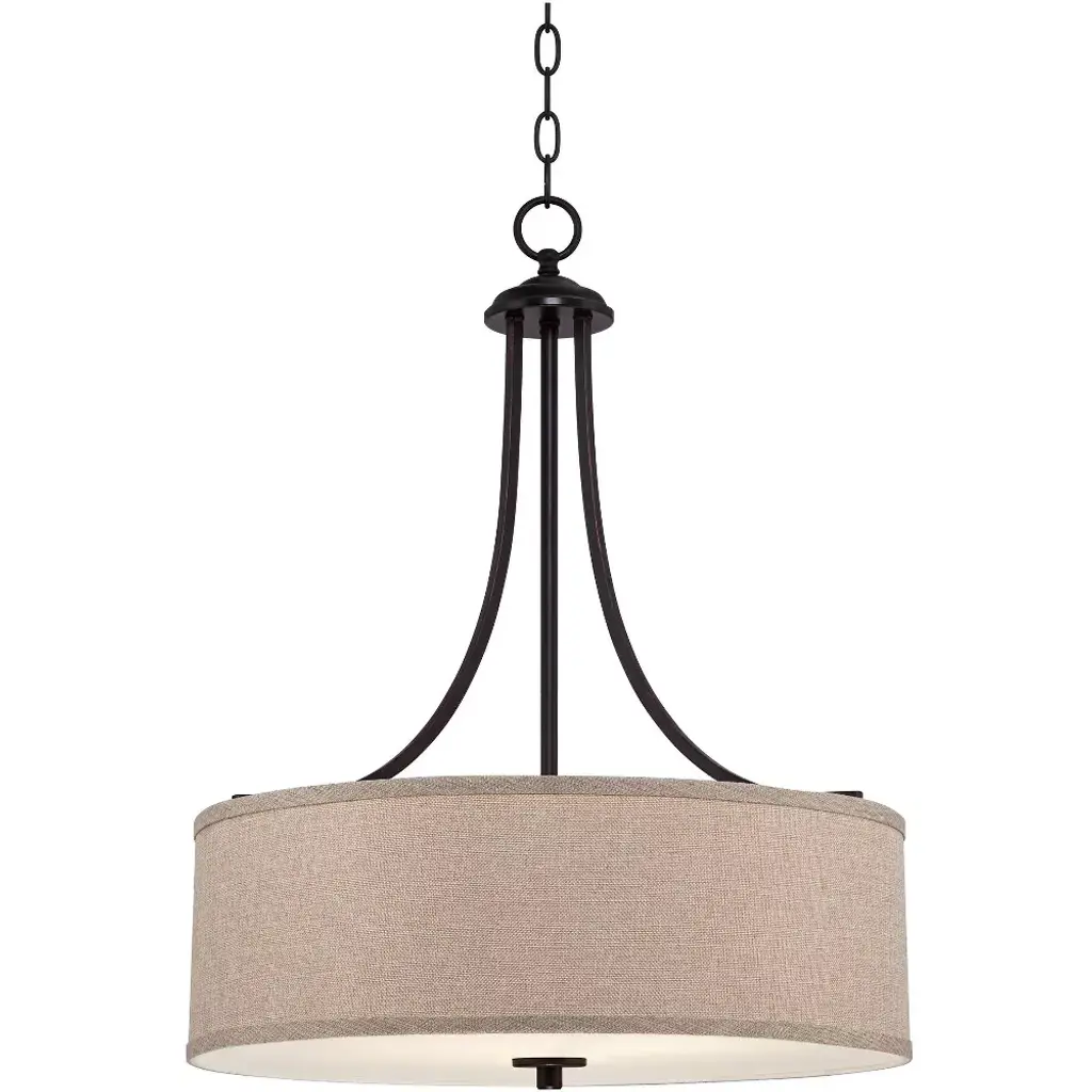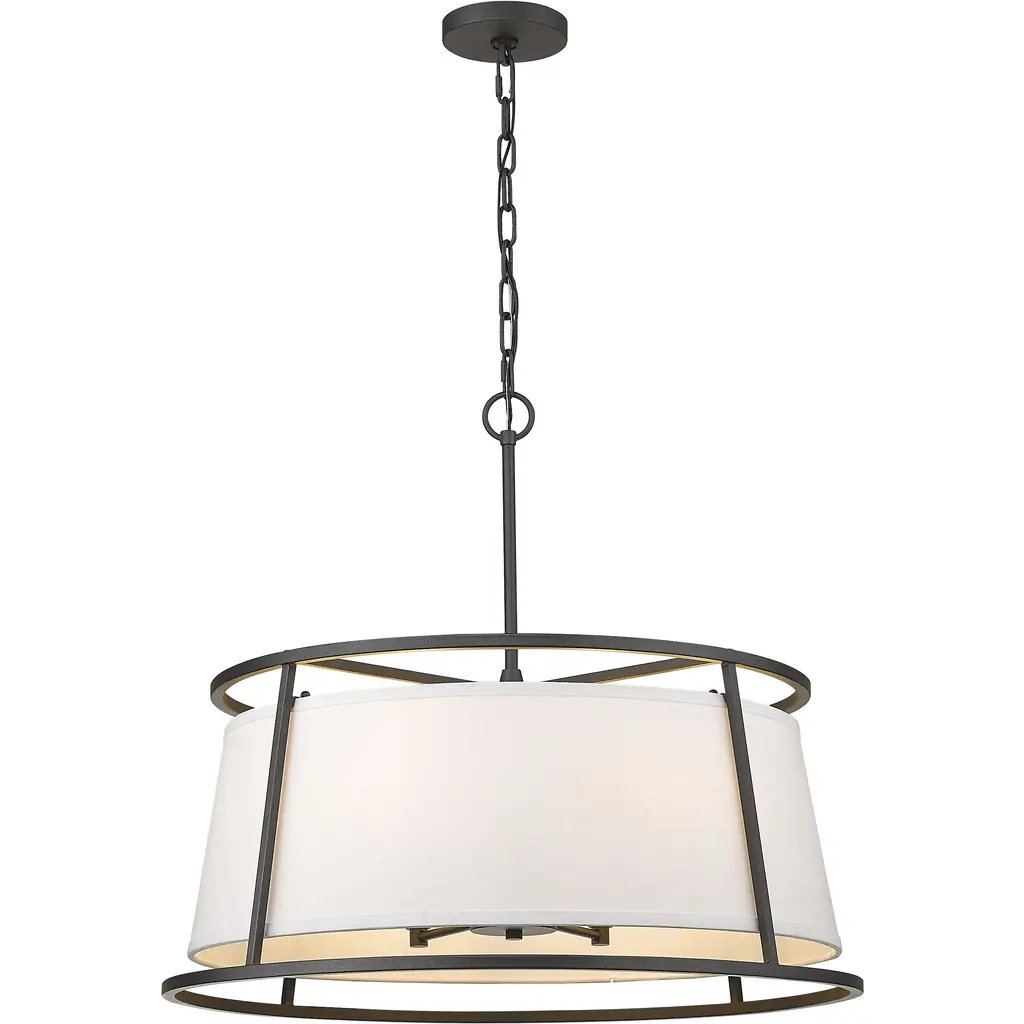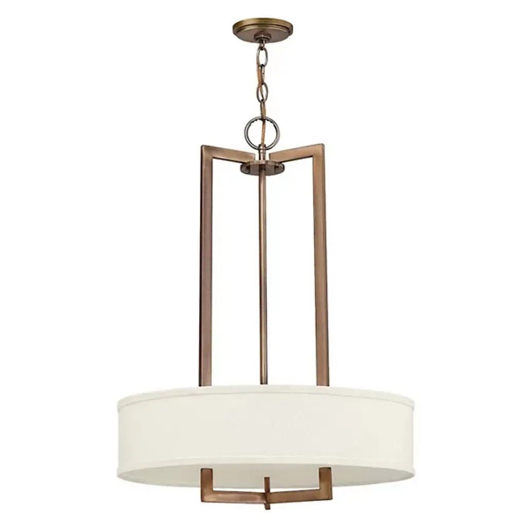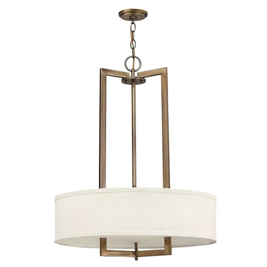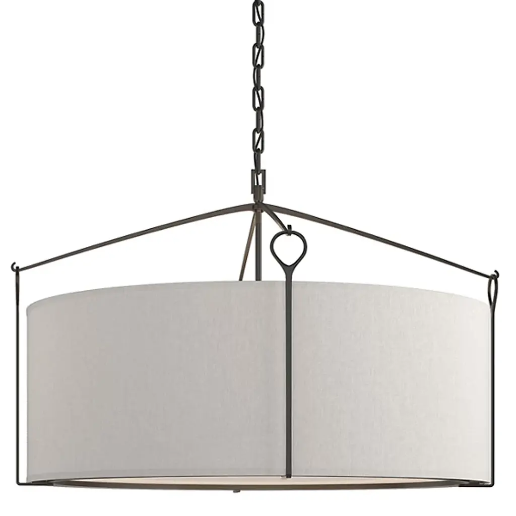 The strength and design simplicity of the metal frame is the focus of the Hinkley Lighting Hampton Drum Pendant. At the bottom of the frame, three lights are housed beneath a single drum-shaped hardback soft linen shade. Available in two finishes and three sizes to accommodate any entryway or dining room, large or small.