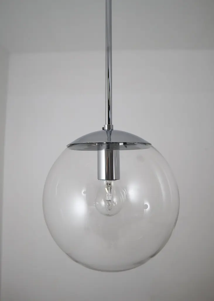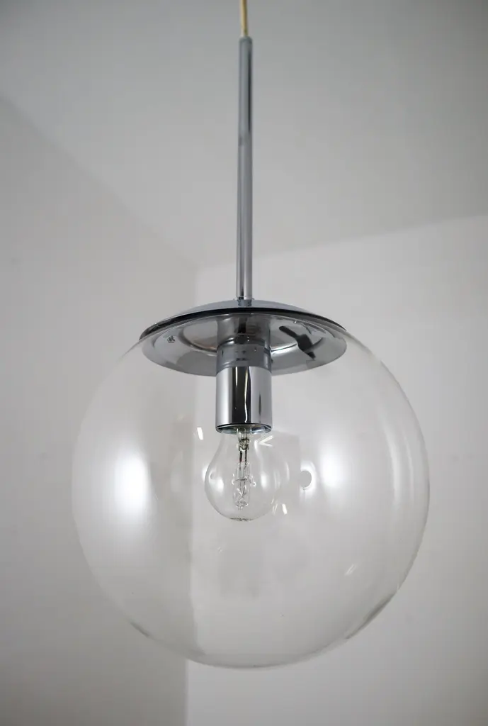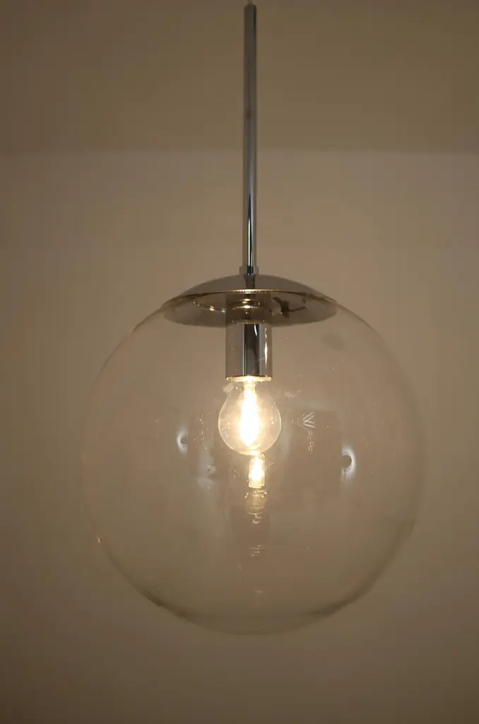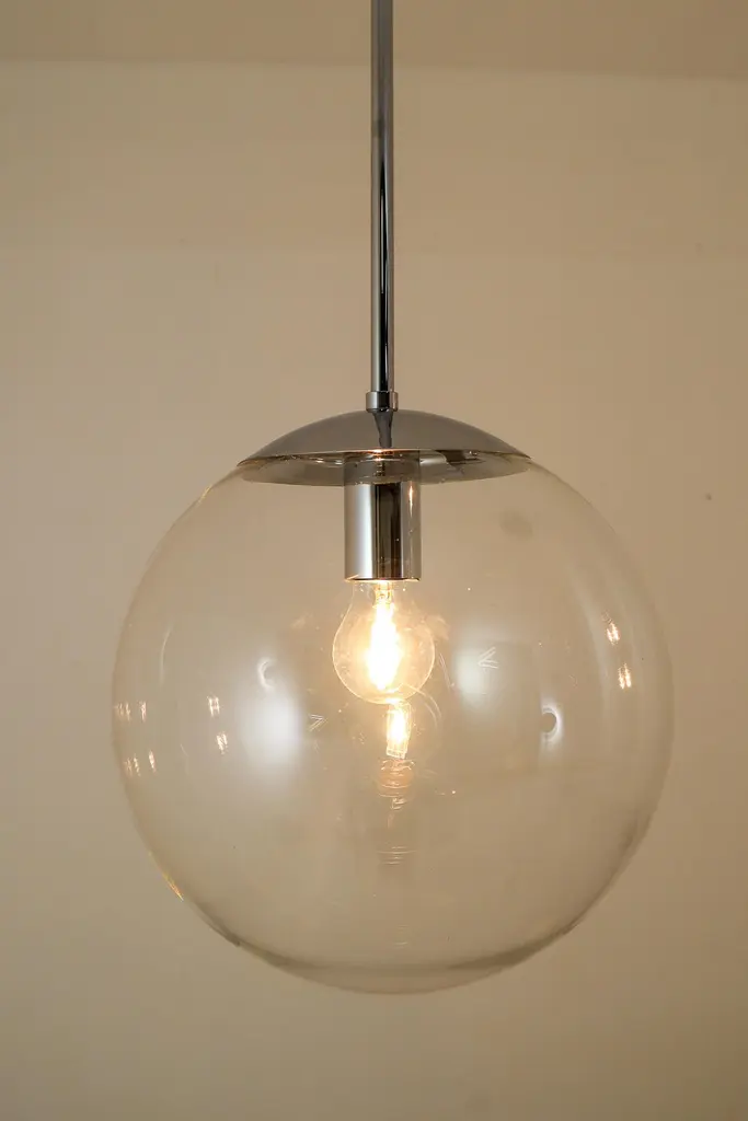 Hand blown pendant lamps were made by the German manufacturer Limburg Glashütte in the 1970s. The hand blown glass globes are mounted on a chrome base. Heavy quality and in very good condition. The pleasant light spreads very atmospheric, this pendant will contribute to a luxurious character of the (hotel-bar) interior. They will be sold singly, as pair or set. Diameter of the globes: 10" (25 cm). The cable can be adjusted per globe to alter the height required. Also possible for higher sealing. Newly rewired (US and EU use likewise E27 socket) in a black fabric or textile or cloth covered cable. We can supply, free of charge, any length and color of cable.12 availableDiameter of the globes: 10" (25 cm).