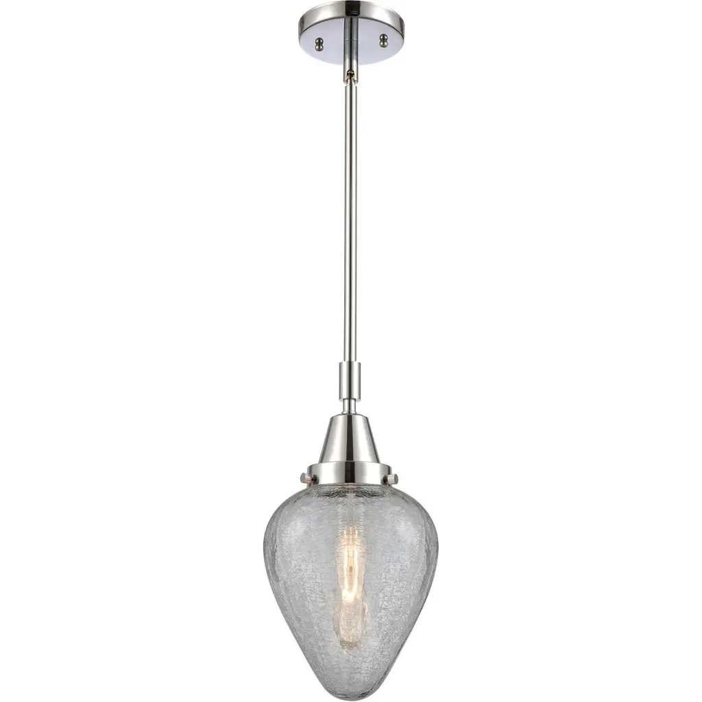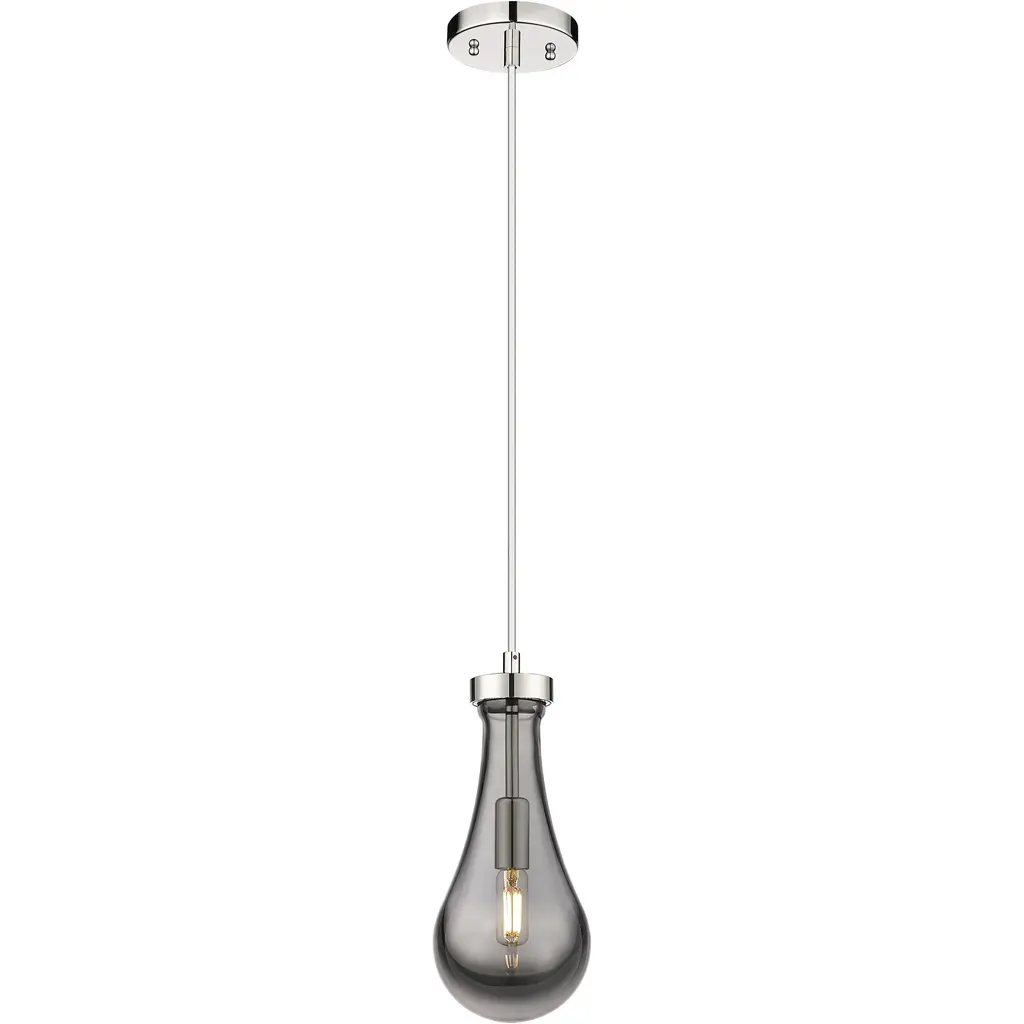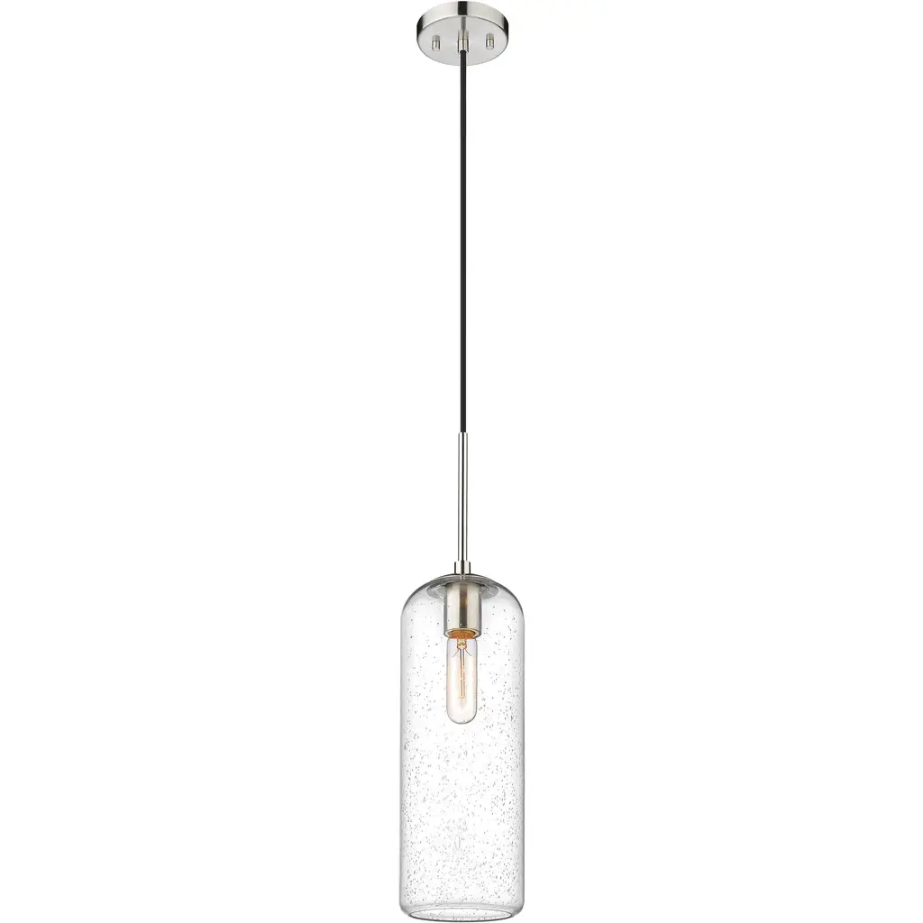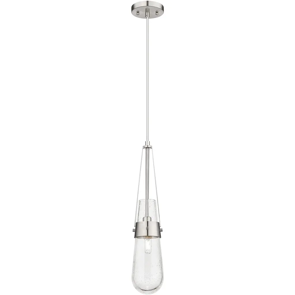 A hanging pendant with rippled, handblown glass, brushed nickel accents, and a vintage Edison bulb. Includes a 10' adjustable cord and a T9 Long Spiral Edison Bulb. 40 Watt Max, Canopy: 7"