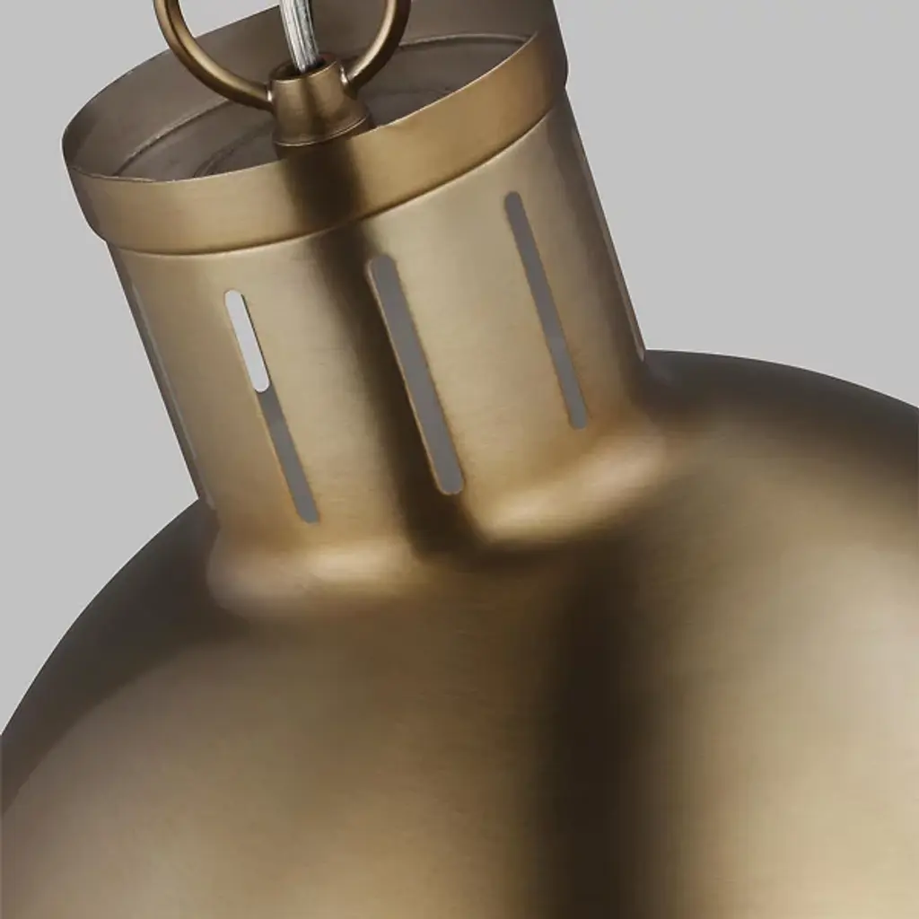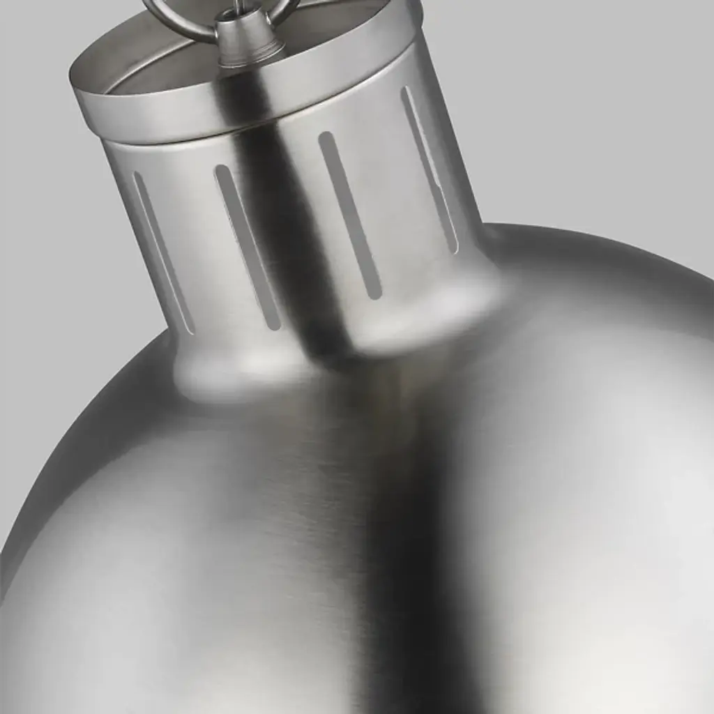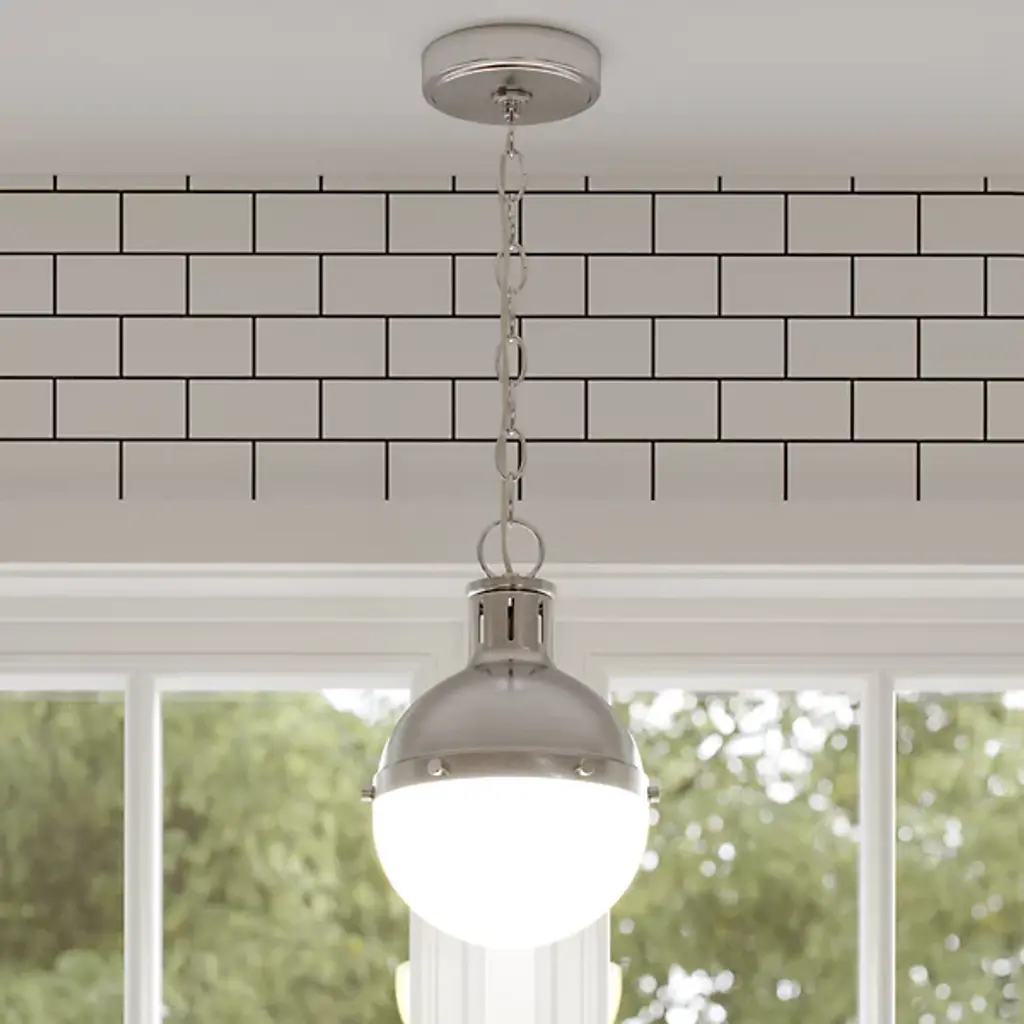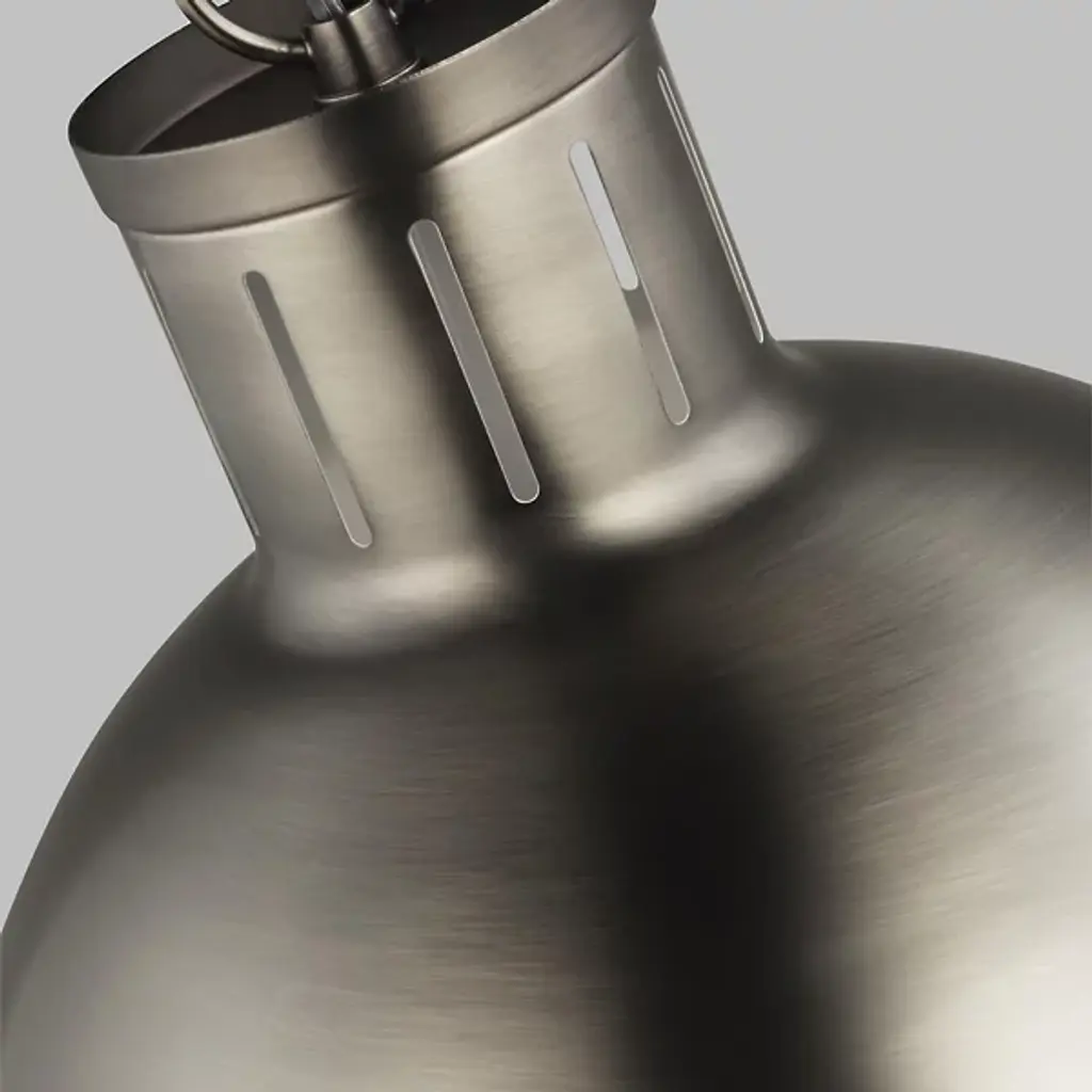 Add classic elegance to your indoor areas with the eye-catching Hanks Pendant from Visual Comfort Studio, formerly known as Sea Gull Lighting, A simple design with industrial solidity, it uses a low-profile ceiling mount and robust chain to support a steel dome housing holding both damp-listed lamping and a glass diffuser that transforms the dome into a self-contained sphere. The otherwise smooth fixture uses a riveted ring to secure the shade, functioning as an equatorial boundary to divide the solid upper structure from the ephemeral ambiance of its lit lower half.