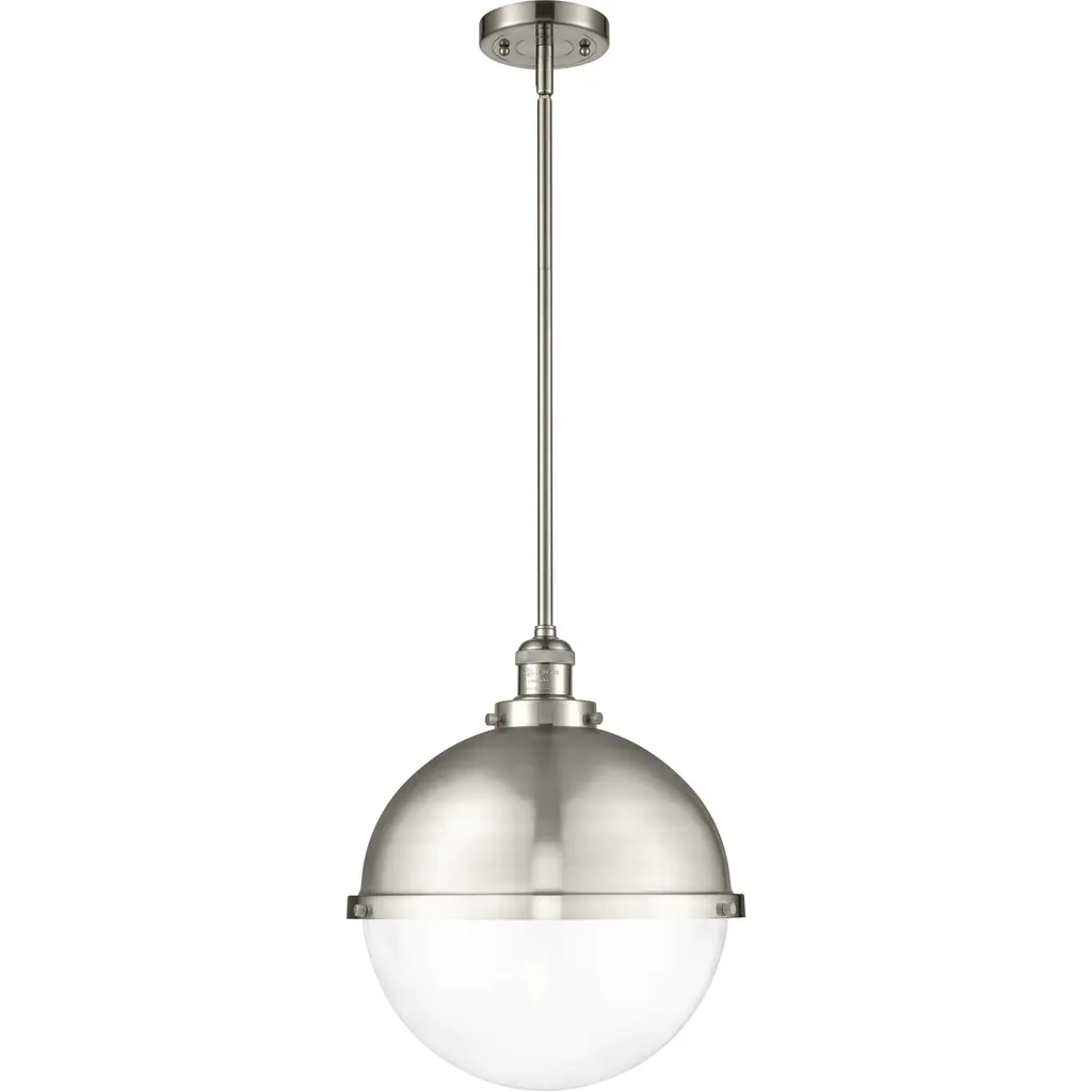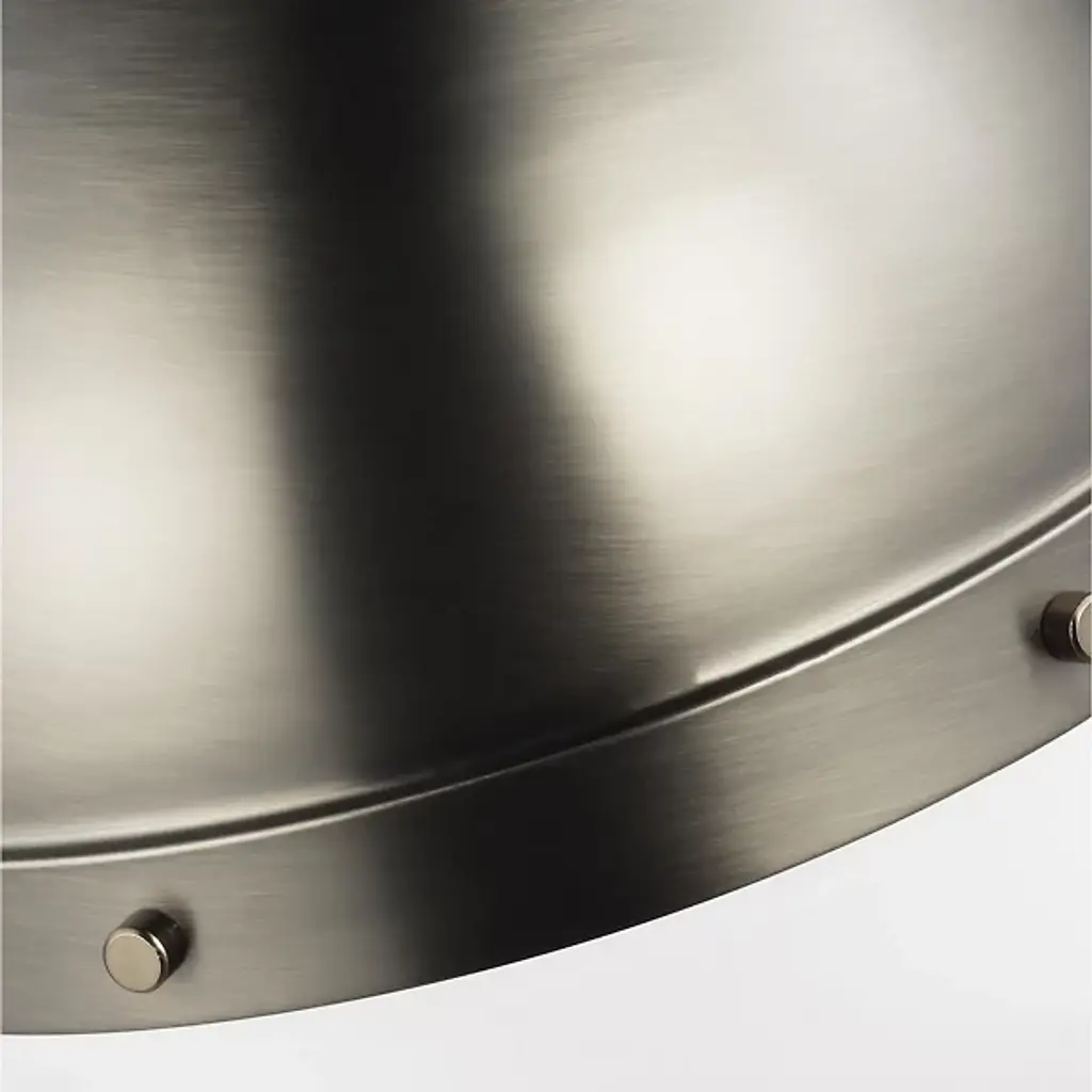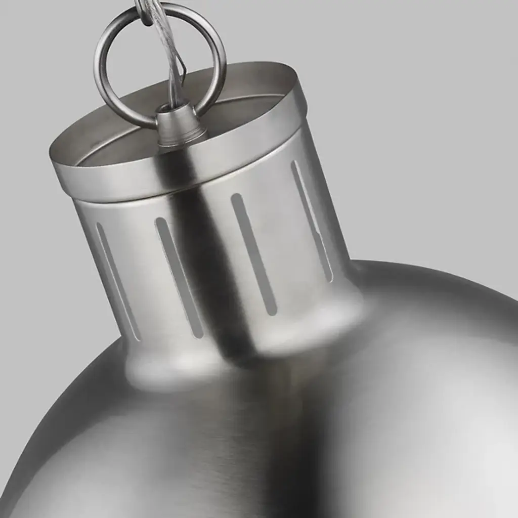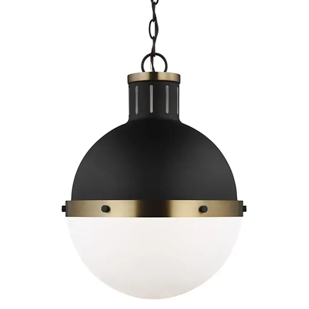 Add classic elegance to your indoor areas with the eye-catching Hanks Pendant from Visual Comfort Studio, formerly known as Sea Gull Lighting, A simple design with industrial solidity, it uses a low-profile ceiling mount and robust chain to support a steel dome housing holding both damp-listed lamping and a glass diffuser that transforms the dome into a self-contained sphere. The otherwise smooth fixture uses a riveted ring to secure the shade, functioning as an equatorial boundary to divide the solid upper structure from the ephemeral ambiance of its lit lower half.