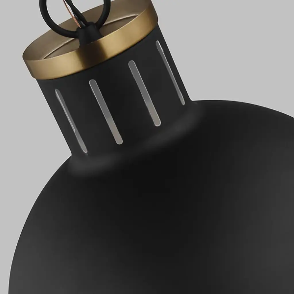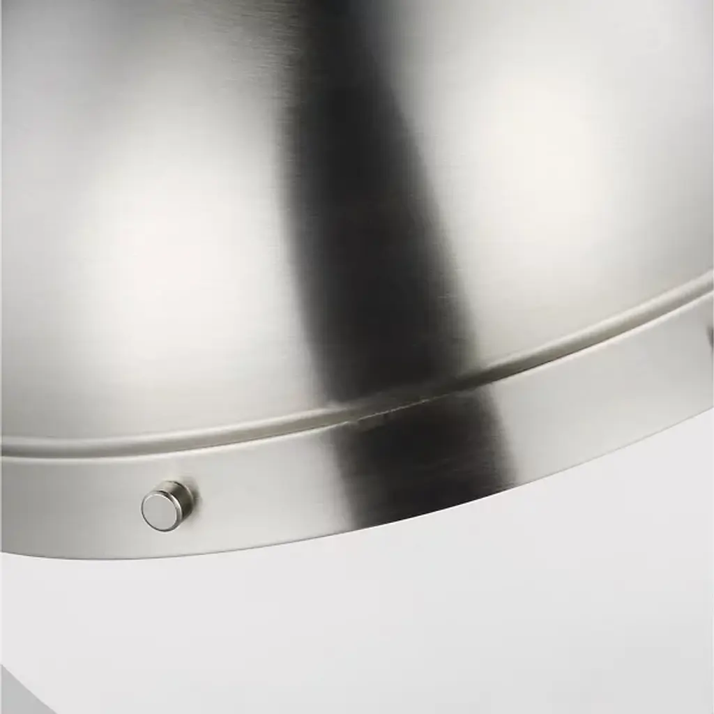 Add classic elegance to your indoor areas with the eye-catching Hanks Pendant from Visual Comfort Studio, formerly known as Sea Gull Lighting, A simple design with industrial solidity, it uses a low-profile ceiling mount and robust chain to support a steel dome housing holding both damp-listed lamping and a glass diffuser that transforms the dome into a self-contained sphere. The otherwise smooth fixture uses a riveted ring to secure the shade, functioning as an equatorial boundary to divide the solid upper structure from the ephemeral ambiance of its lit lower half.