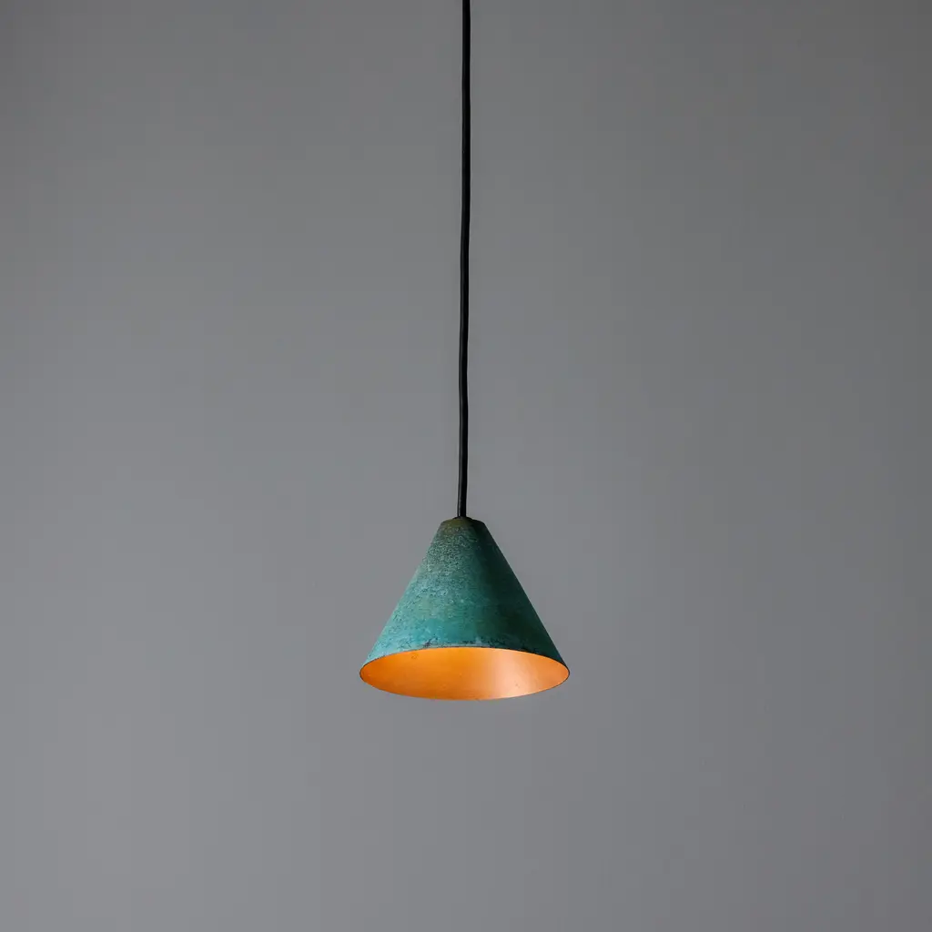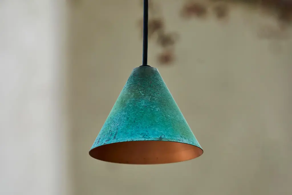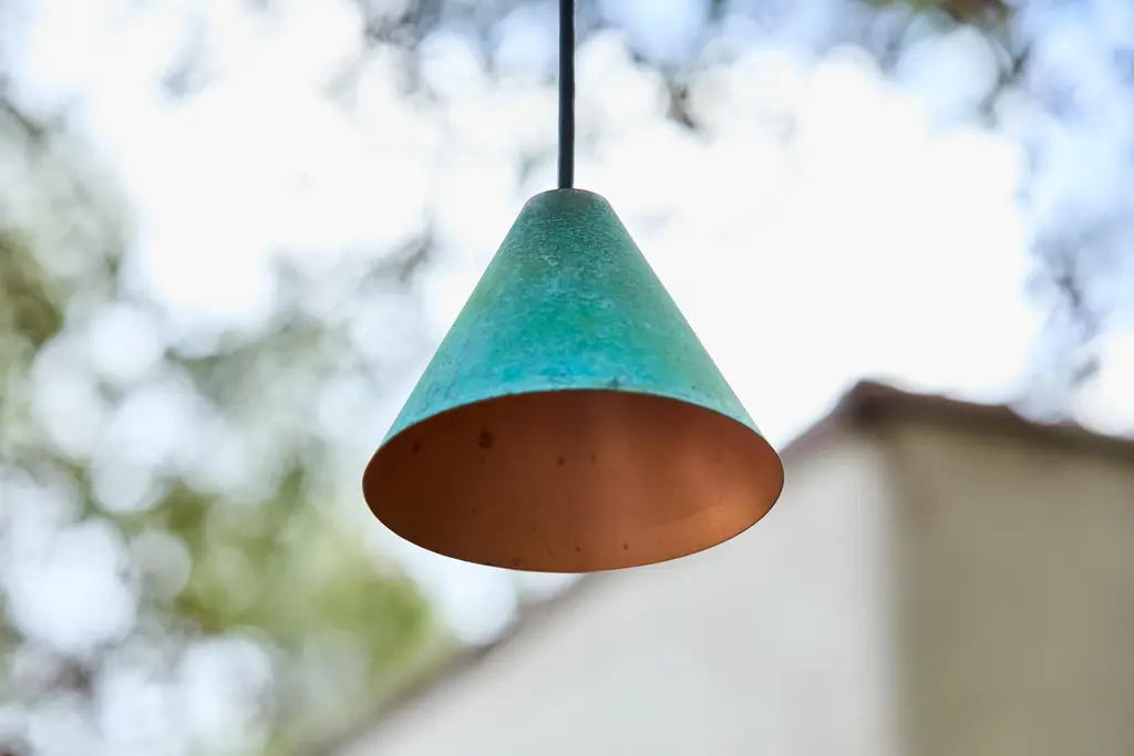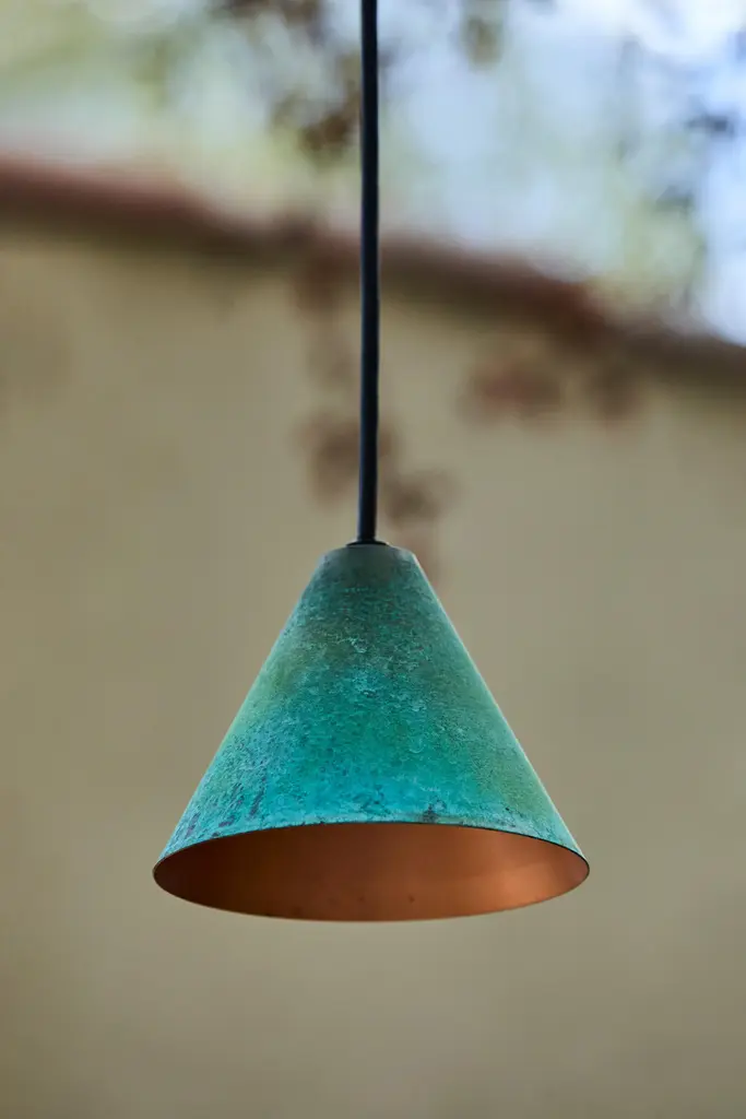Hans-Agne Jakobsson Verdigris Patinated 'Mini-Tratten' Outdoor Pendant An exclusive made for U.S. and UL listed authorized re-edition of the classic Swedish design from Jakobsson, Executed in rich verdigris patinated metal with a burnished interior finish. An incredibly refined design that is quintessentially Scandinavian. This low-voltage version is UL listed for outdoor use and wet location. Price is per item. Available in unlimited quantities and in a variety of finishes including raw or polished brass or copper, verdigris patinated, darkly patinated, dark brown patinated, and white, black, brown, bronze, silver, or steel painted metal. An indoor version, as well as an indoor/outdoor sconce version, are also available in a separate listing. This listing is for the outdoor low-voltage verdigris 'Mini-Tratten' pendant. In-stock and ready to quick ship. Please note that inventory availability can change at any time. For time-sensitive orders, kindly inquire prior to purchasing. Authorized re-edition newly produced by Orsjo, Sweden. Professionally wired for US electrical with 9 feet of 18 gauge SJ exterior grade wire that can be cut to desired length. UL listed for wet location. Accommodates 1x US 12 volt e26 LED bulb (LED only, not included). Recommended installation by licensed electrician. Only one representative example of the patinated lamps is featured in the photos. Please note that the chemical patination process can result in unique variation from lamp to lamp including streaking, flaking, spotting, discoloration, patchiness and other irregularities, including inside the shade. The interior of the lamp is fabricated in unlacquered metal, and will also naturally patinate over time with exposure to the elements, handling, etc. Finish may vary from lamp to lamp, with darker and lighter color variations possible that may differ from the listing photos. Patinas can also change, fade over time and even rub off due to handling, storage, and exposure to the elements, resulting in further variation and irregularities. Patination is a dynamic process which continually evolves in beautifully unpredictable ways to create a unique look with its own special characteristics. Made to order.