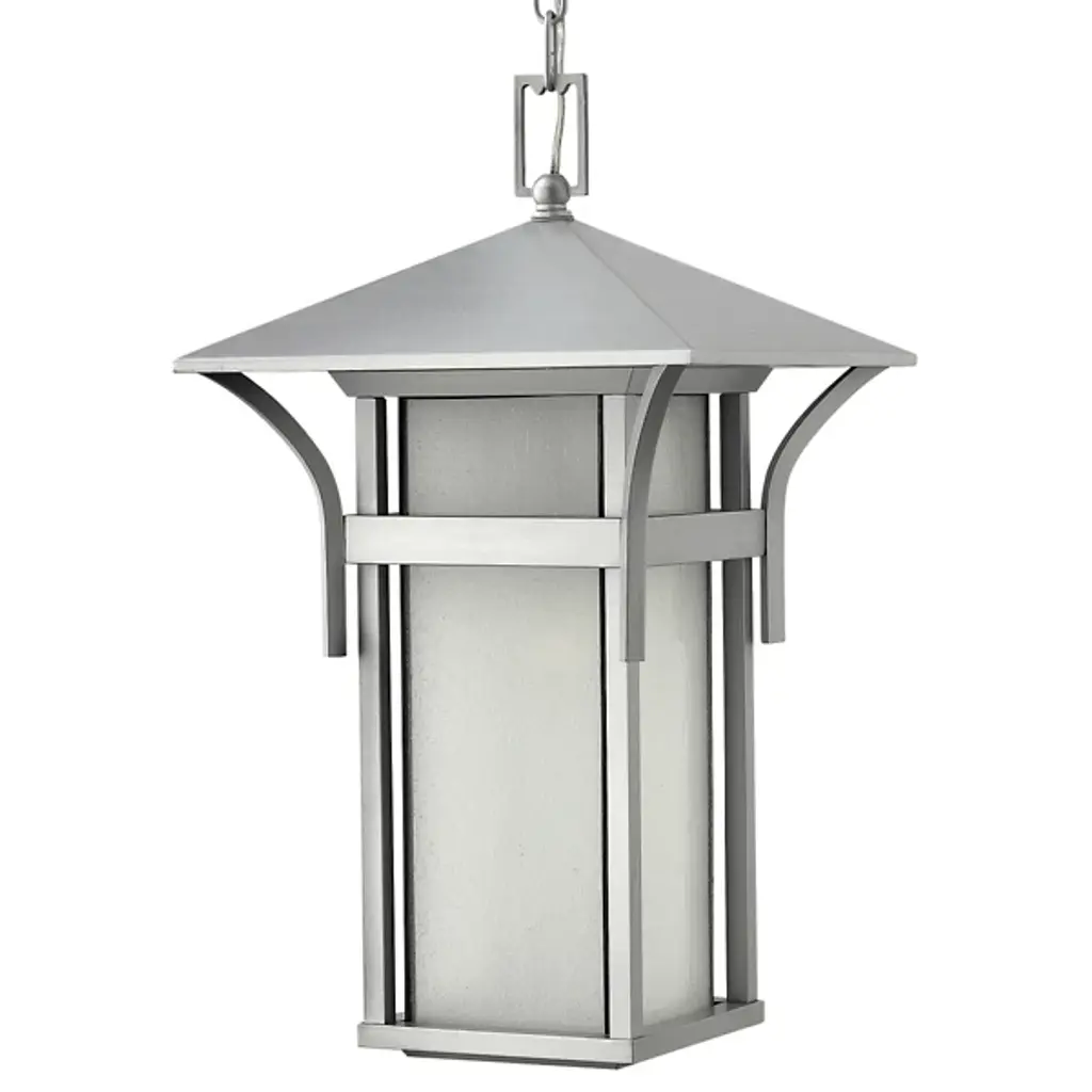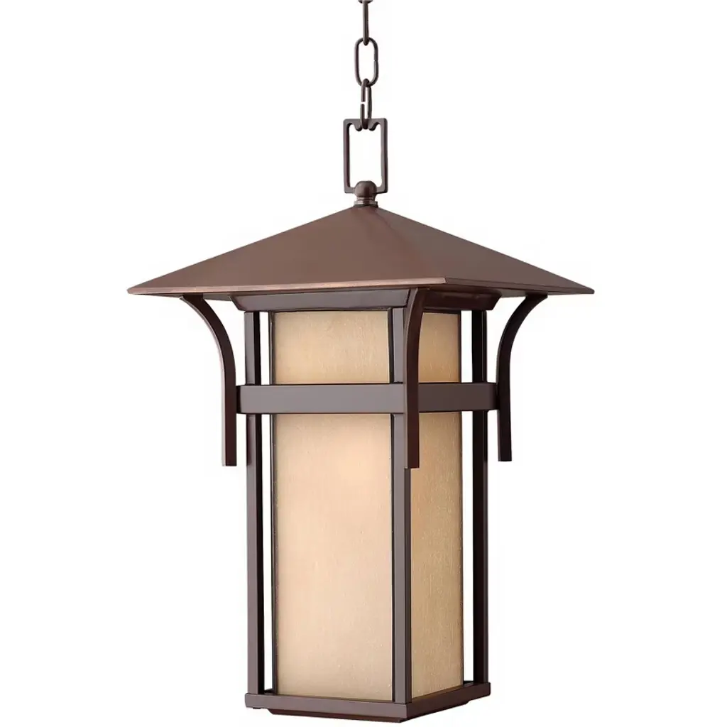 Built to resemble the friendliness and familiarity of the modern lighthouse. The Harbor Outdoor Pendant by Hinkley Lighting is an outdoor piece built to function just like its inspiration: to provide soft, ambient lighting to exterior living spaces. The fixture’s most notable trait is its profile, which utilizes a brass and aluminum framework complete with a topping that’s built like a fine, metallic pyramid. Fixture also utilizes an etched amber seedy bound glass that allows the internal lamping to radiate a soft, diffused light. Fixture is suitable for use in areas like covered decks and patios.
