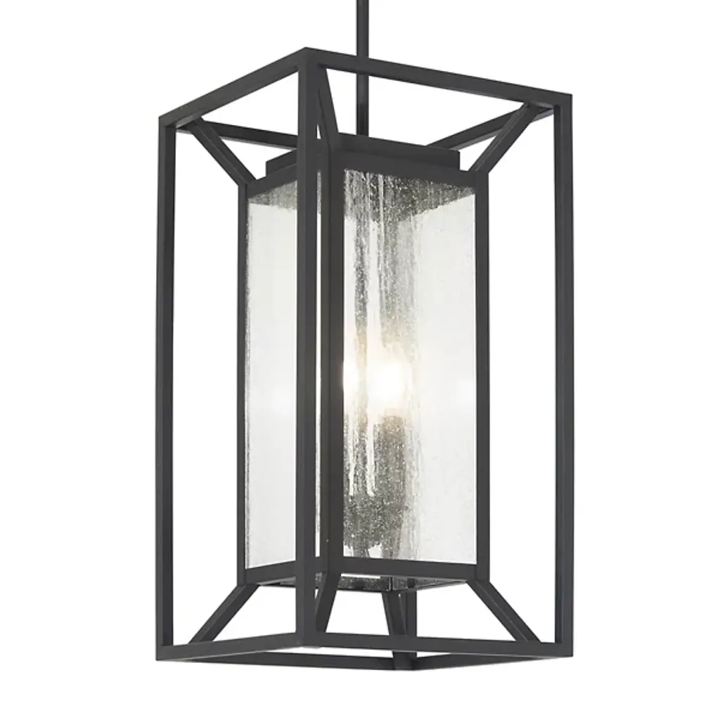 A clean modern piece full of slim lines, the Harbor View Outdoor Pendant from The Great Outdoors uses a traditional lantern silhouette to elevate the décor. Hanging from a slim downrod, this piece consists of a series of smooth metal bars that sharply angle into an open frame that gently encloses a center rectangular shade with clear seeded glass panels and a set of four bulbs. The light from the bulbs is bright and even, diffusing through the glass as a warm ambiance.