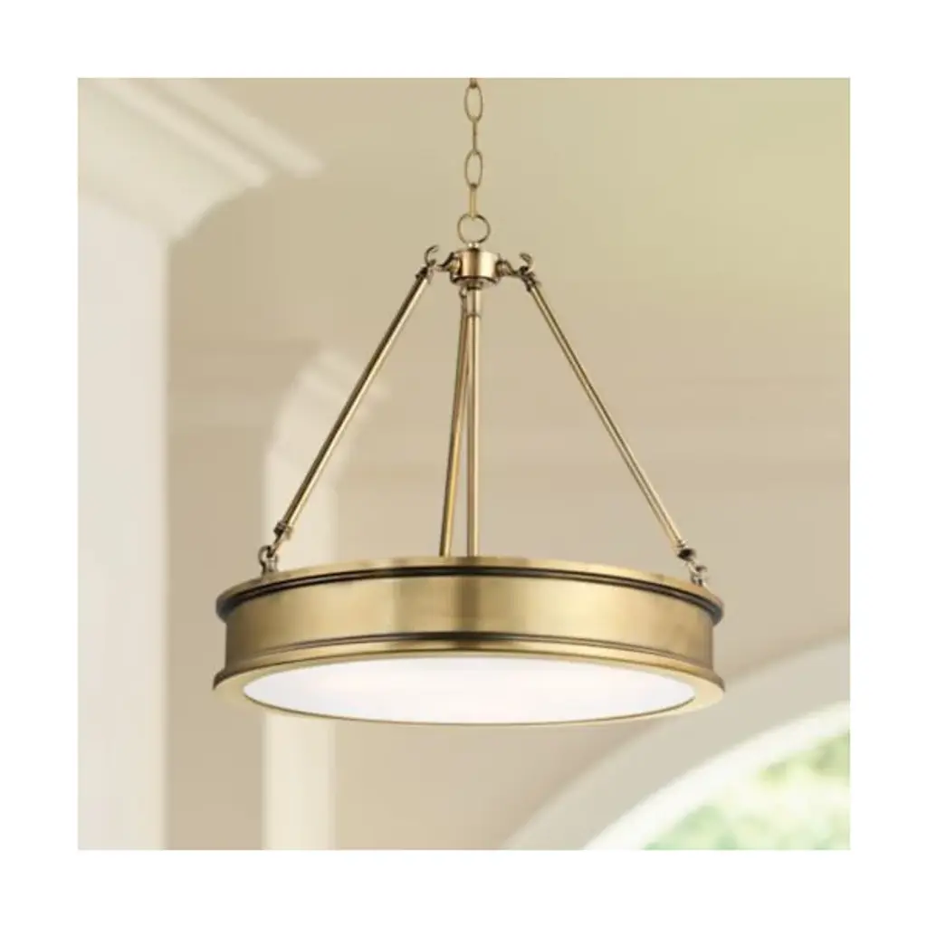 Tasteful, traditional style. The Minka-Lavery Harbour Point Drum Pendant presents a clean silhouette that needs little embellishment. Hook-and-rod elements offer structural detail, joining the drum-shaped shade to the suspension chain. Subtly tiered edges add a touch of detail while below, an etched white glass diffuser provides a smooth wash of cheerful illumination.