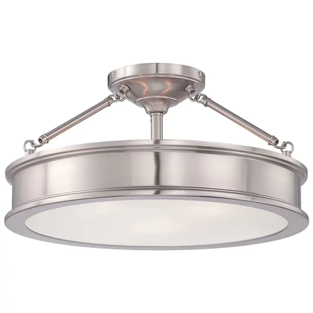 Tasteful, traditional style. The Minka-Lavery Harbour Point Drum Semi-Flushmount presents a clean silhouette that needs little embellishment. Hook-and-rod supports join the drum-shaped shade to the canopy, all in a rich Liberty Gold finish. Subtly tiered edges add a touch of detail while below, an Etched White glass diffuser provides a smooth wash of cheerful illumination.