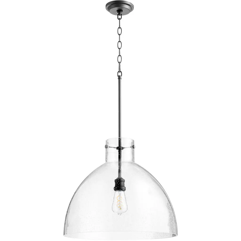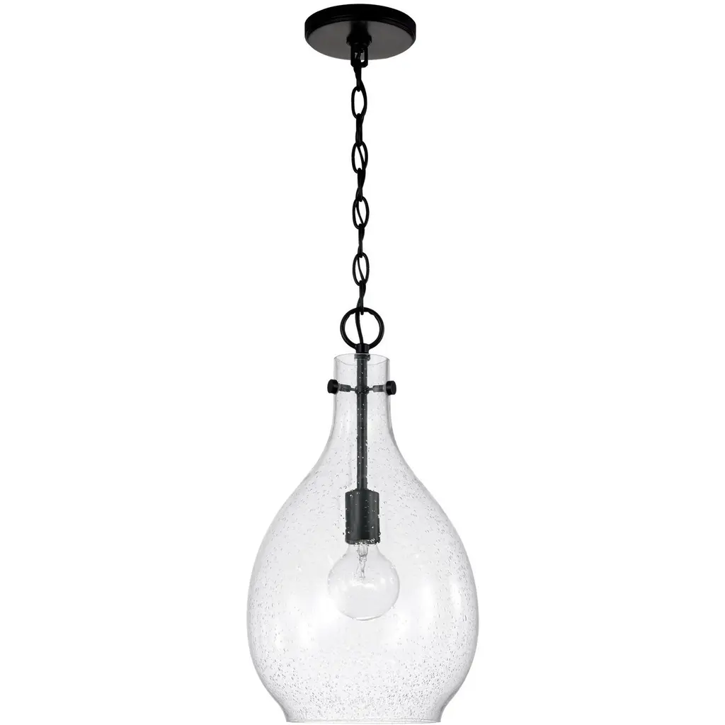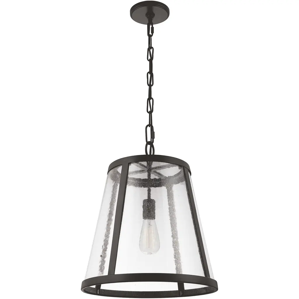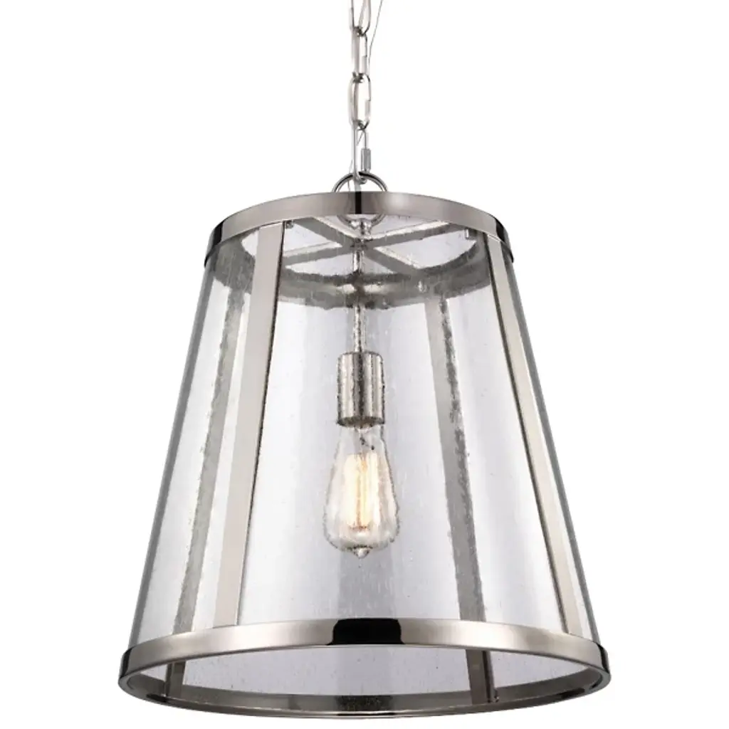 Transparent lighting that hides nothing. The Visual Comfort Studio, formerly known as Sean Lavin, Harrow Pendant takes a cone-shaped shade with a clear seedy glass barrier and a solid steel frame to lend wide space illumination. The exposed bulb within is highlighted by the optical quality of the bubbles in the glass, making the diffusion of light unique. Vintage filament bulb recommended for aesthetic enhancement. Suspends from square linked chain and rounded canopy.