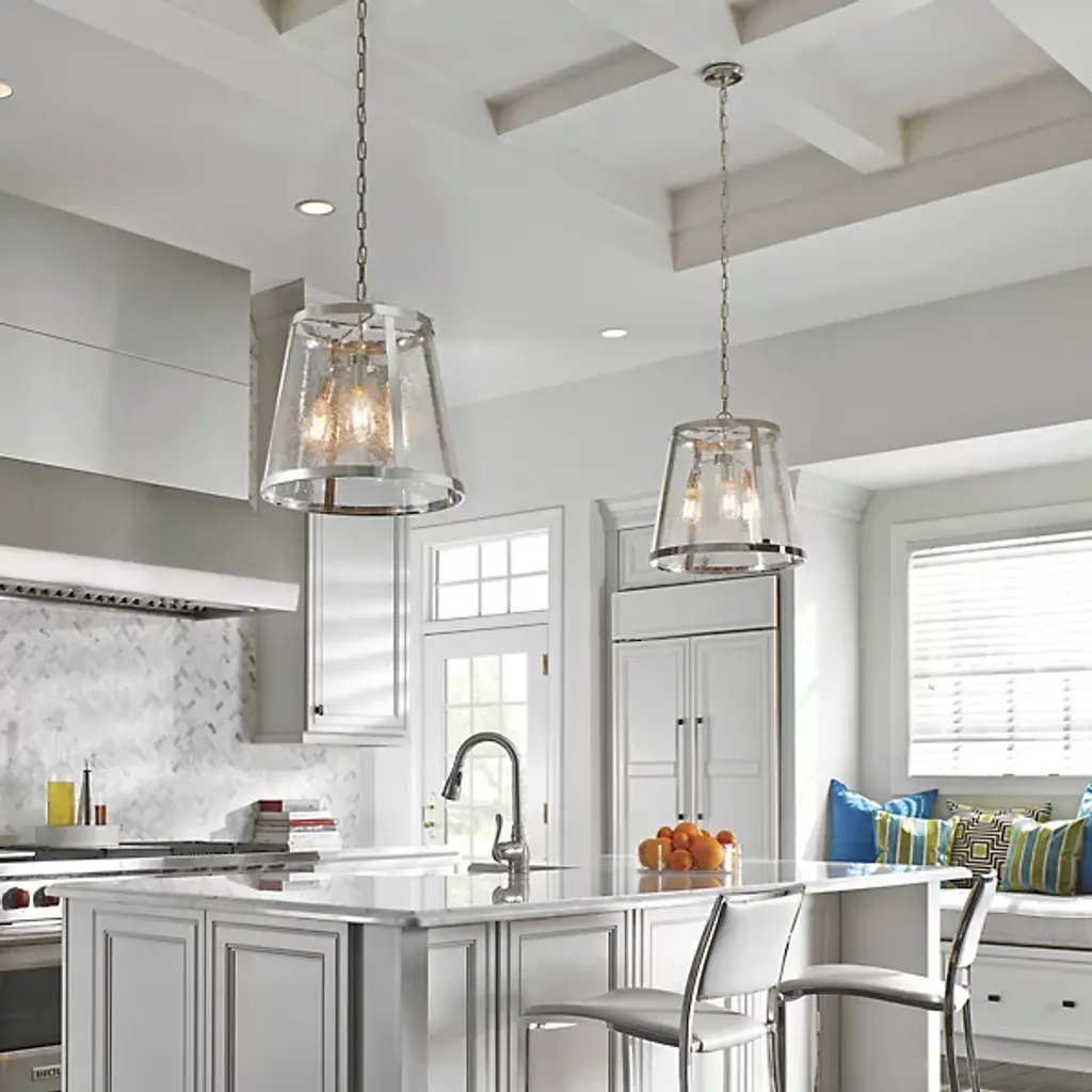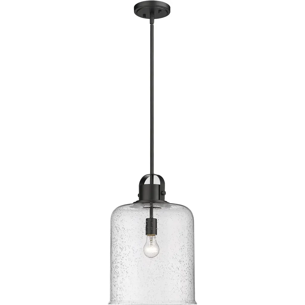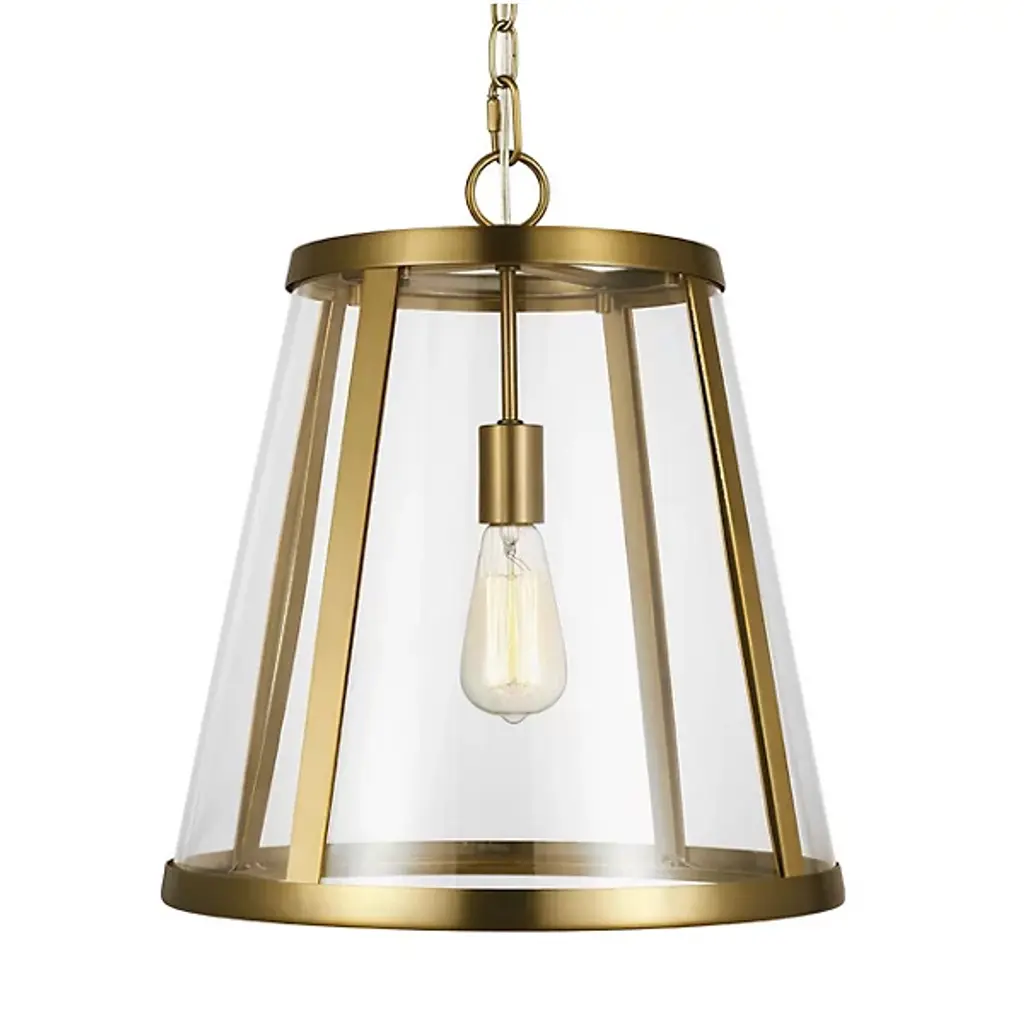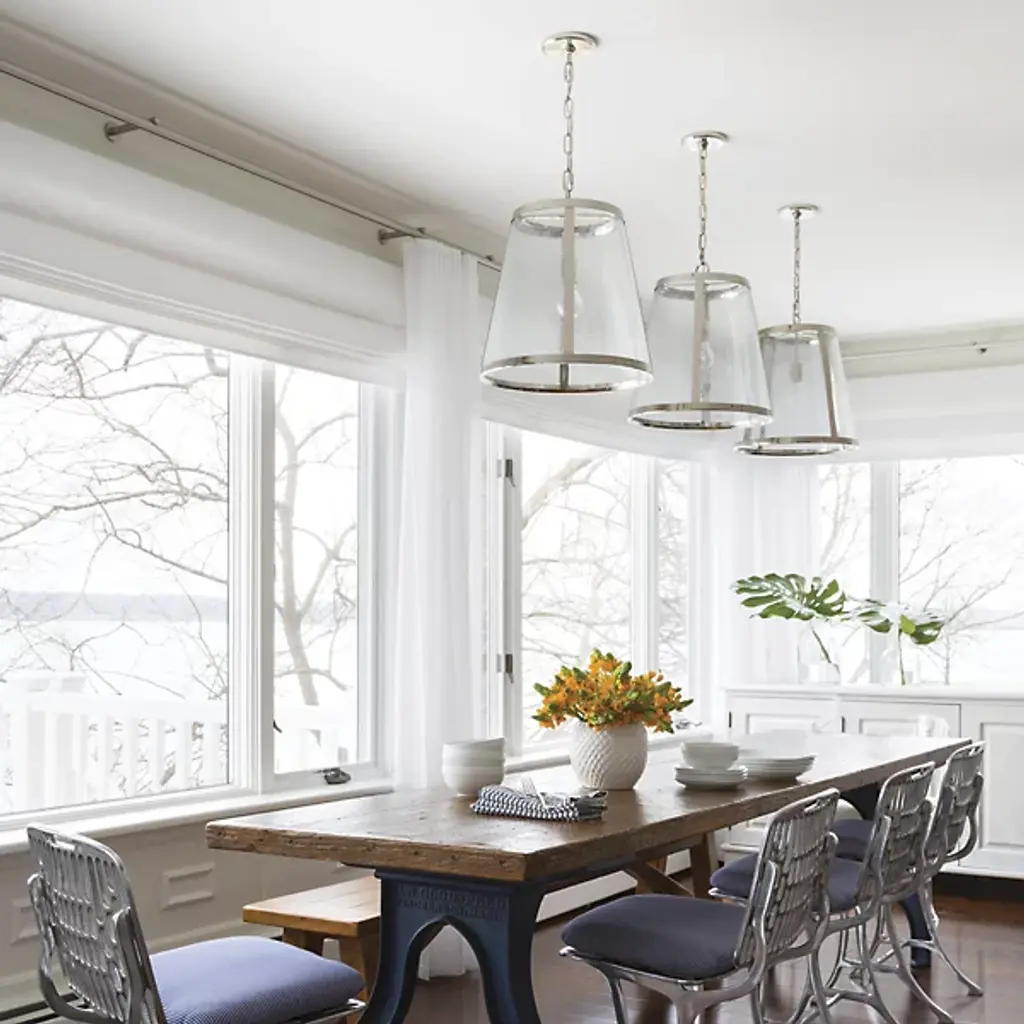 Transparent lighting that hides nothing. The Visual Comfort Studio, formerly known as Sean Lavin, Harrow Pendant takes a cone-shaped shade with a clear seedy glass barrier and a solid steel frame to lend wide space illumination. The exposed bulb within is highlighted by the optical quality of the bubbles in the glass, making the diffusion of light unique. Vintage filament bulb recommended for aesthetic enhancement. Suspends from square linked chain and rounded canopy.