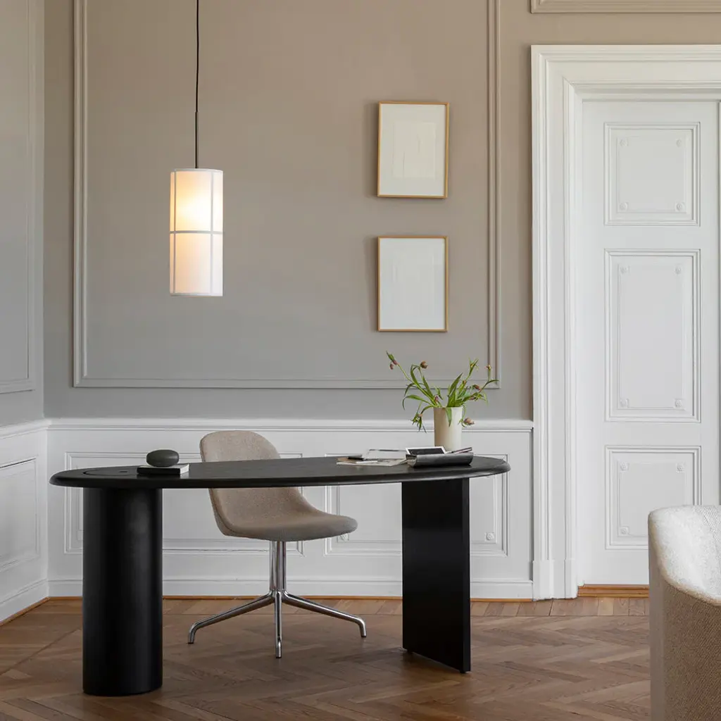 An elegantly spare column of light suspended from the ceiling by a textile cord reiterates the shape of Hashira collection’s floor and table lamps. Precisely sheathed in translucent linen fabric that suggests the graphic structure within, the pendant spreads a warm ambient light. Norm Architects looked to traditional paper lanterns to inspire this striking fixture, perfect above a dining table at home or in varied public settings.