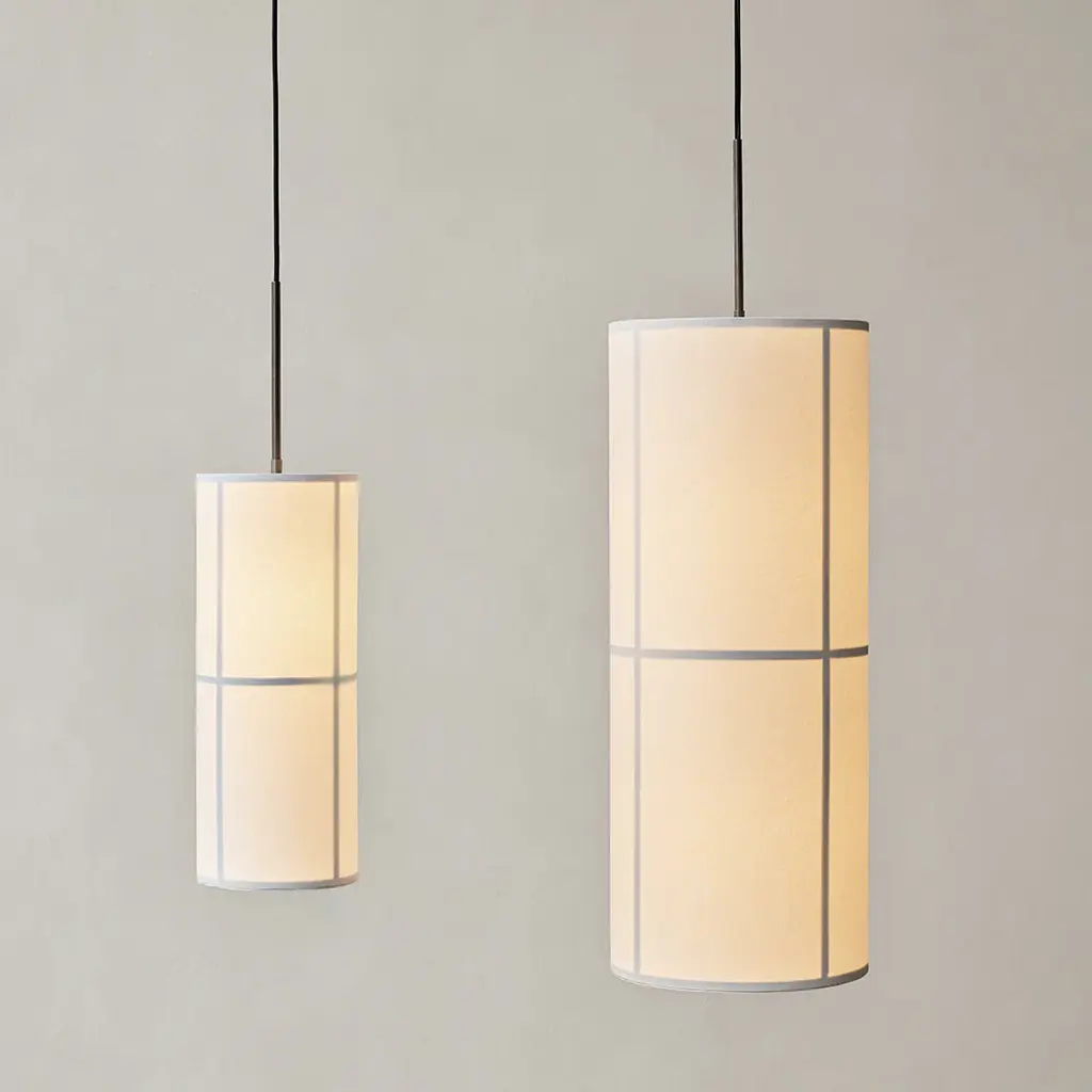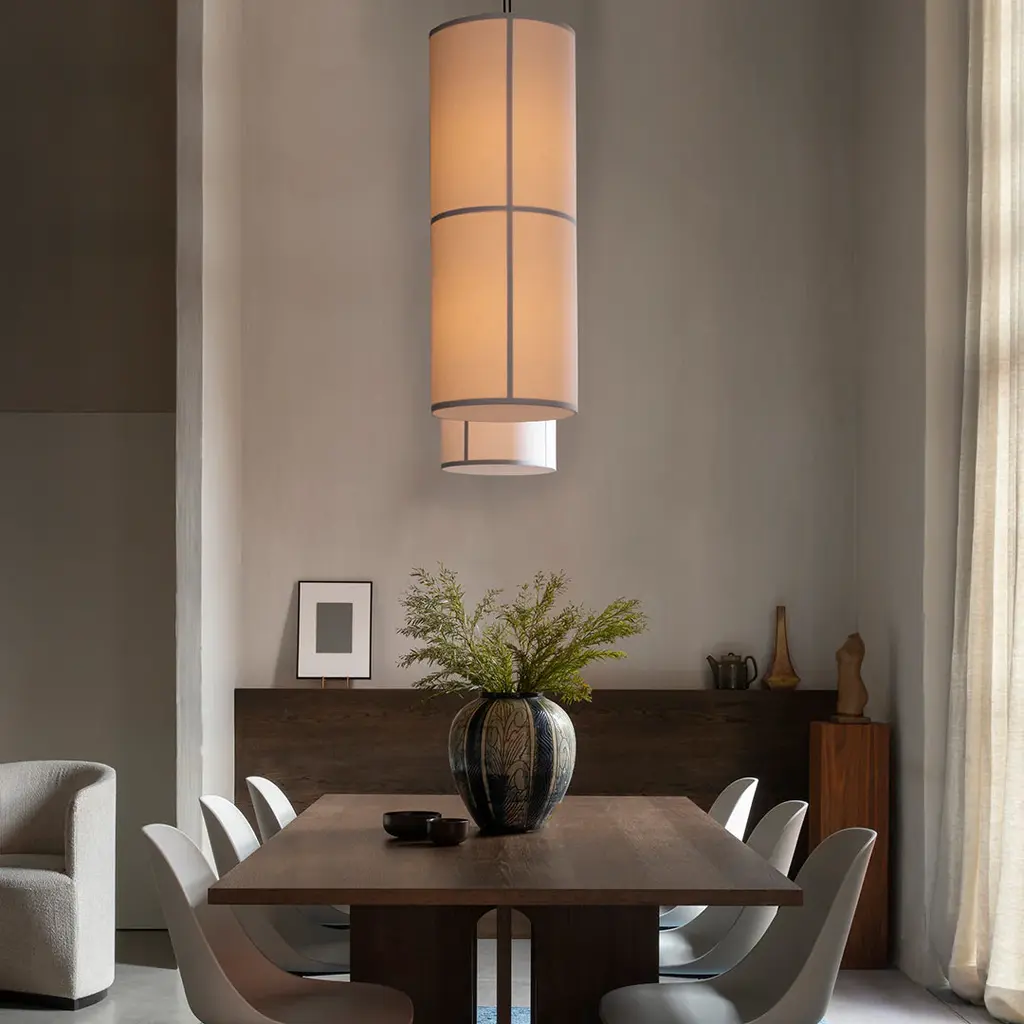 MENU launches the Hashira Collection, a modern, Nordic take on the traditional Japanese rice paper lantern. A fusion of East and West, tradition and modernity, and a perfect balance of aesthetics and proportion and simplicity and character, Hashira is a new collection of floor, table and pendant lamps for modern spaces. Designed by Norm Architects, the collection takes its cues from visits to traditional Japanese Washi paper makers and its name from the Japanese word for column or pillar. The cylindrical Hashira Floor Lamp rises majestically from the floor. The translucent fabric shade not only acts as a diffuser, projecting the light in multiple directions while creating a cozy, glare-free ambiance, it also adds palpable appeal that enhances the softness of an interior, acoustically as well as tactilely. Shaped from the basic geometric form in architecture, the slender Hashira Table Lamp is set on a wooden base that underpins the minimalist expression and is visible through the translucent fabric shade that softly diffuses the light in multiple directions. The Hashira Cluster, a trio of pendants suspended from a black textile cord, is offered in two sizes (small and large) that lend themselves to any setting thanks to its minimalist expression and natural materials, and the collection's single pendant light, available in two sizes, is created with the same column-like shape as the floor and table lamps to fill spaces with cozy, ambient light."Spreading ambient light in a room, the Hashira Collection makes for purposeful lighting above a dining table, in a reception area or on a table in a hotel bedroom, bringing a sense of understated luxury and purpose to interior spaces.", Norm Architects