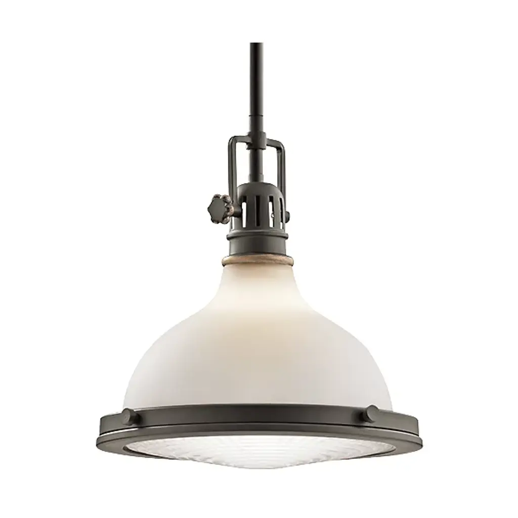 With a gentle and softly toned exterior, the Kichler Hatteras Bay Glass Pendant is a mild-mannered ceiling fixture that diffuses downward light with ample illumination. Its vintage-style functionality is conveyed with a fully functional paddle switch and metal lining for a traditional persona. Light is cast through an etched Fresnel lens, deeply ridged and set into separate concentric sections to improve refractivity and dispersal of light.