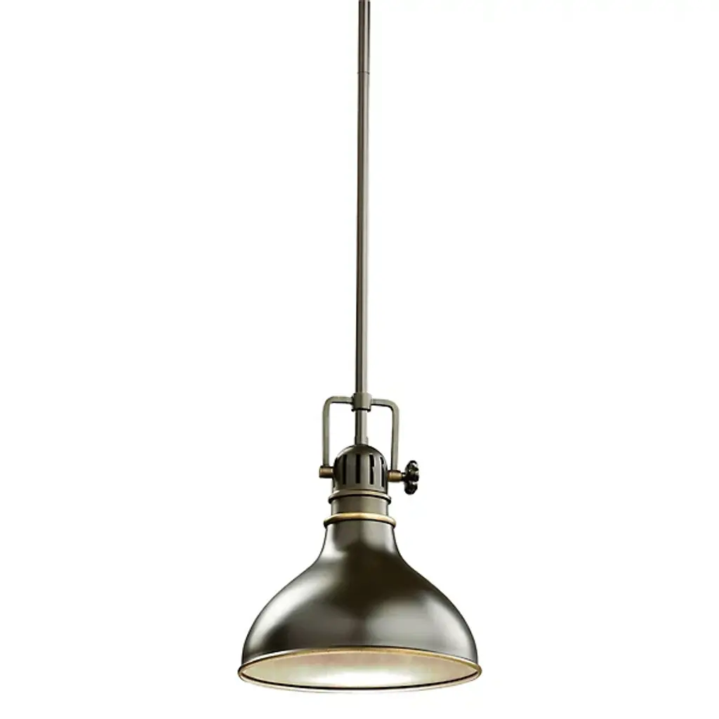 Mechanical and modern, the Kichler Hatteras Bay Mini Pendant takes on the classic bell shape supported by a single downrod. This fixture features traditional ornamentation at the top of the bell curve, adding conventional detailing. This mini pendant works well alone or in groups, the single Halogen bulb providing sufficient downlight in a variety of spaces.