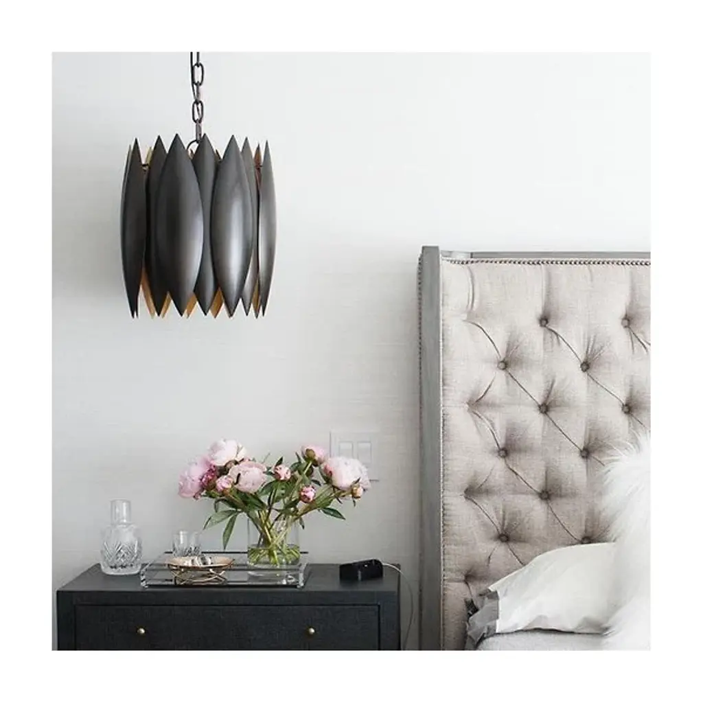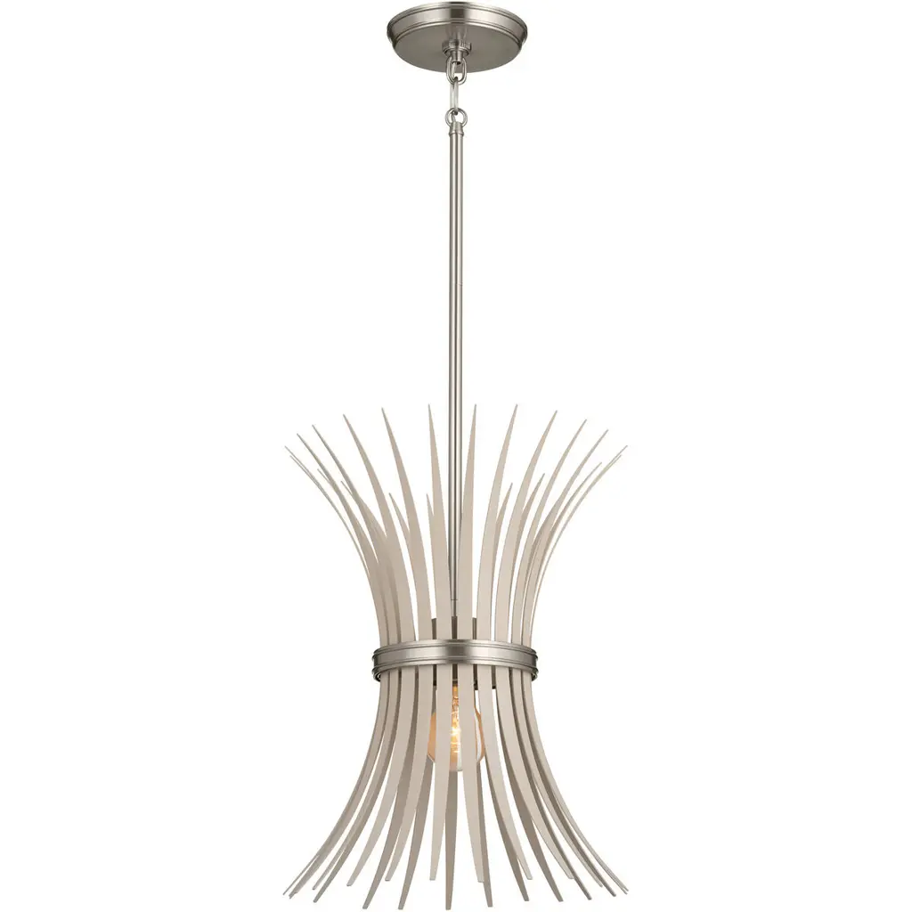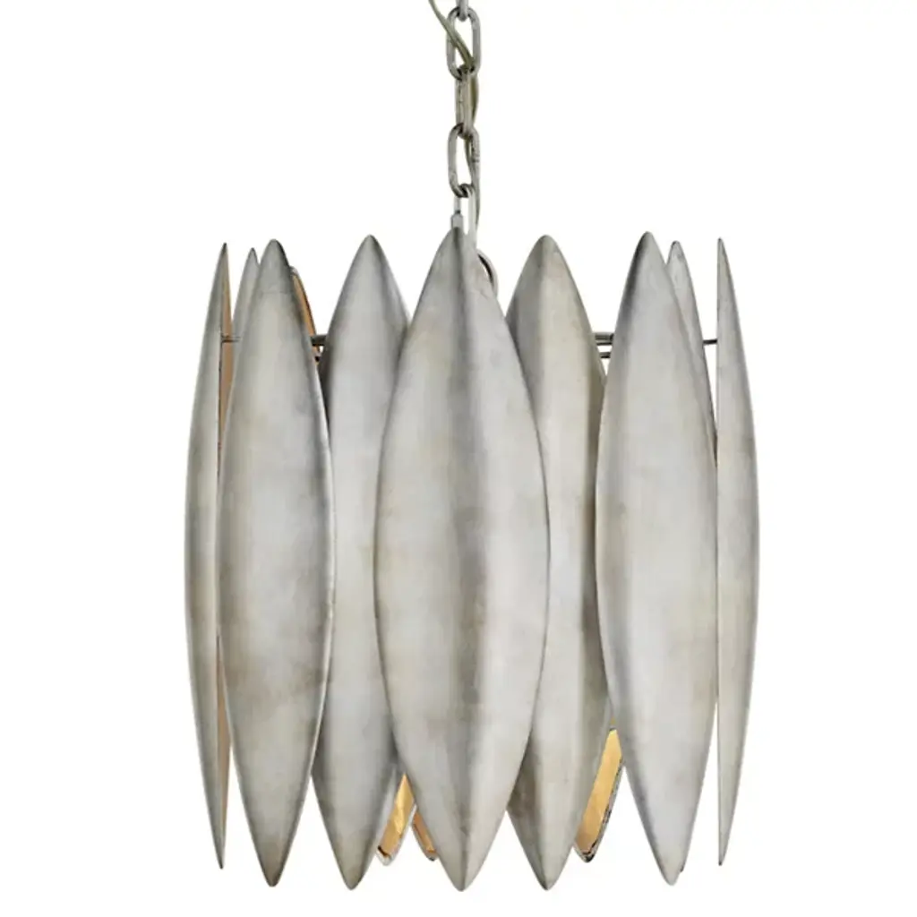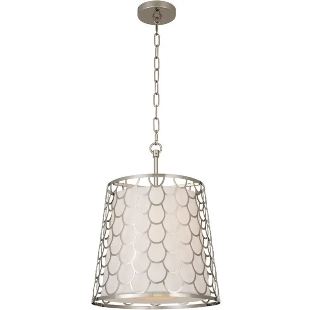 Visually impressive fixture created by designer Barry Goralnick. The Hatton Pendant by Visual Comfort Signature, formerly known as Visual Comfort, has a charming presence and feels right at home in a wide range of settings. It has a tranquil lamp shade composed of overlapping marquise-shaped metal pieces arranged around and fastened to a central column. Light from the internal source shines through the top, bottom, and gaps between the overlapping pieces of the shade and uplifts the ambiance of any setting.