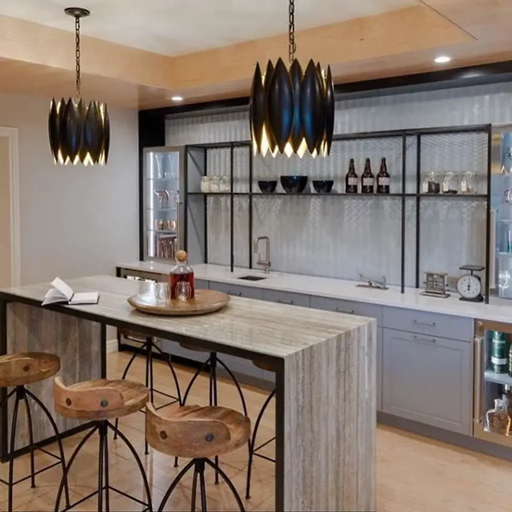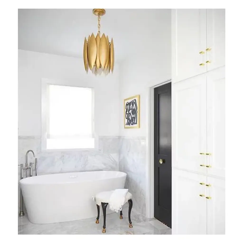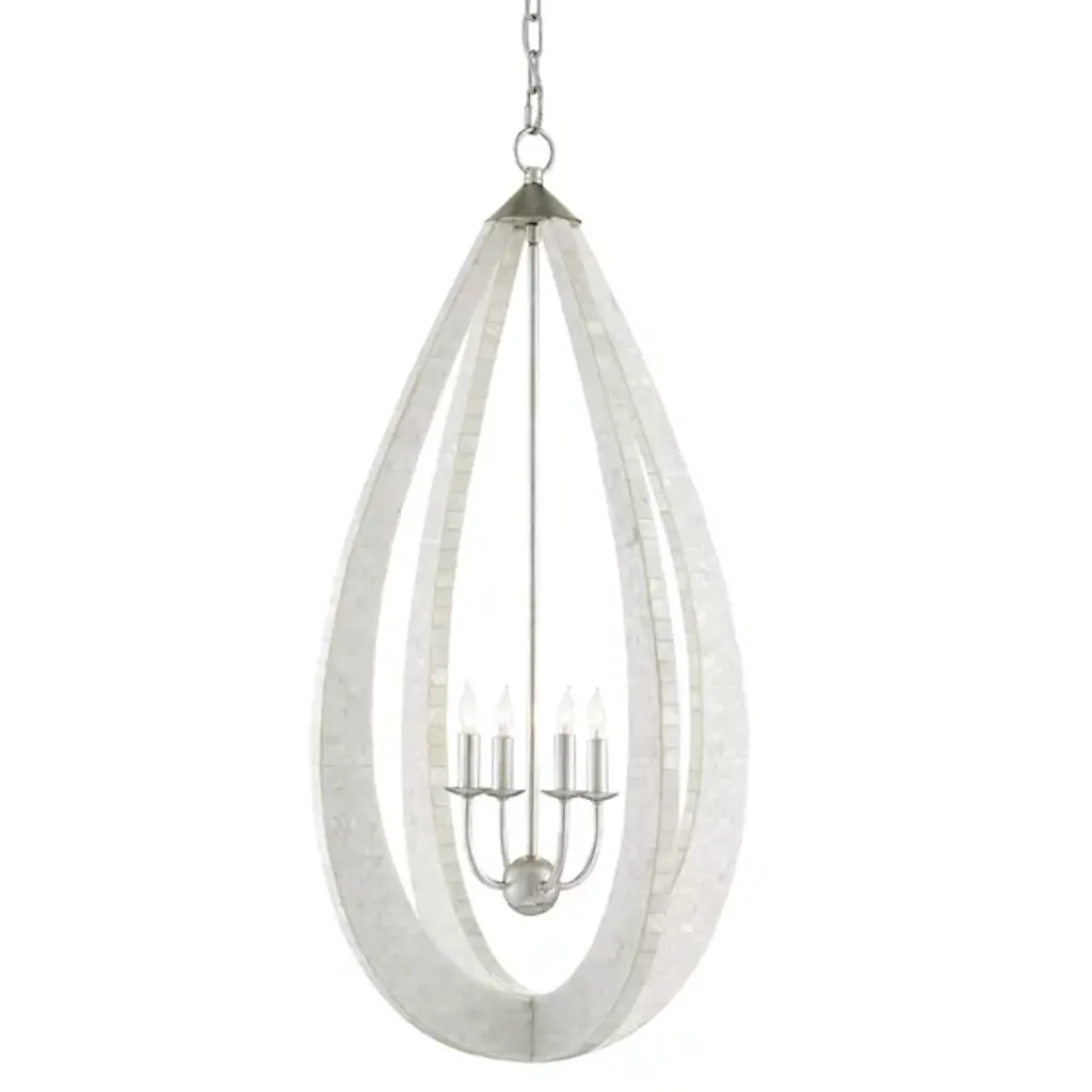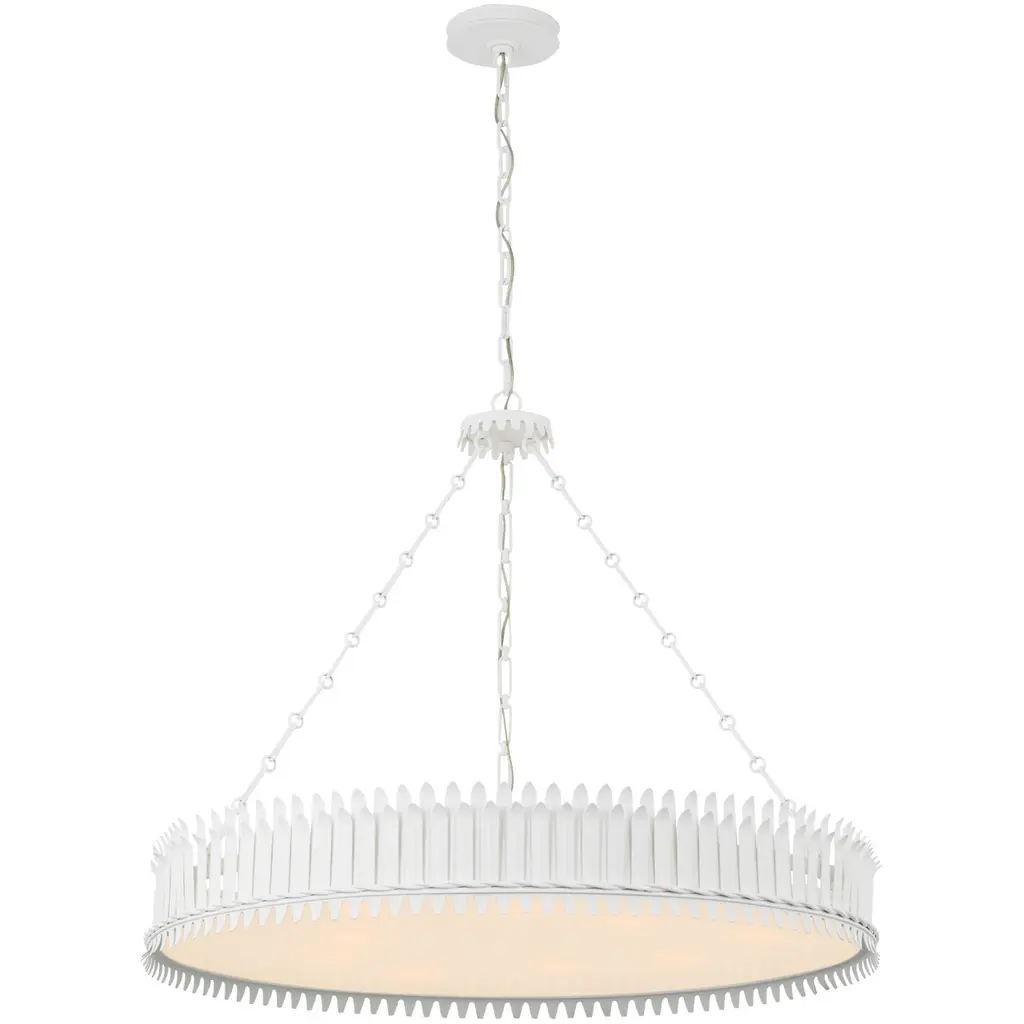 Visually impressive fixture created by designer Barry Goralnick. The Hatton Pendant by Visual Comfort Signature, formerly known as Visual Comfort, has a charming presence and feels right at home in a wide range of settings. It has a tranquil lamp shade composed of overlapping marquise-shaped metal pieces arranged around and fastened to a central column. Light from the internal source shines through the top, bottom, and gaps between the overlapping pieces of the shade and uplifts the ambiance of any setting.