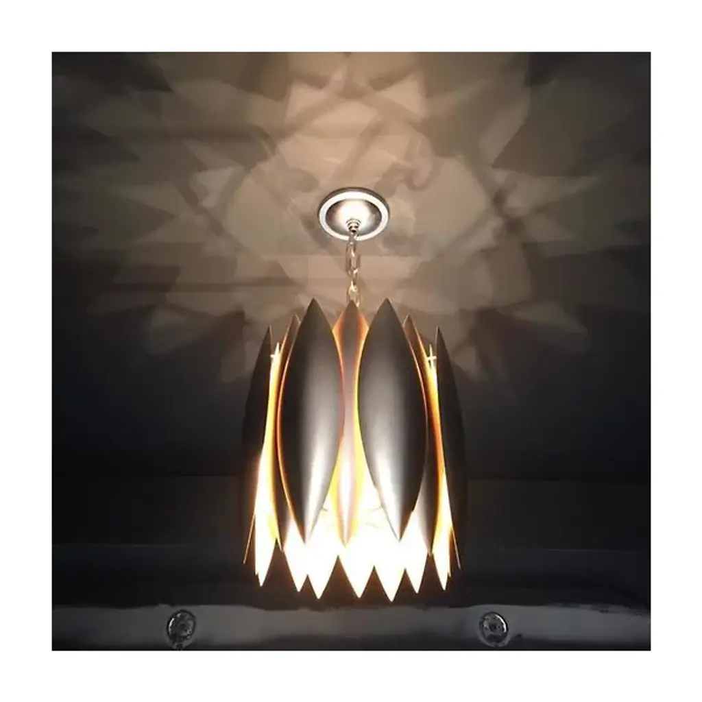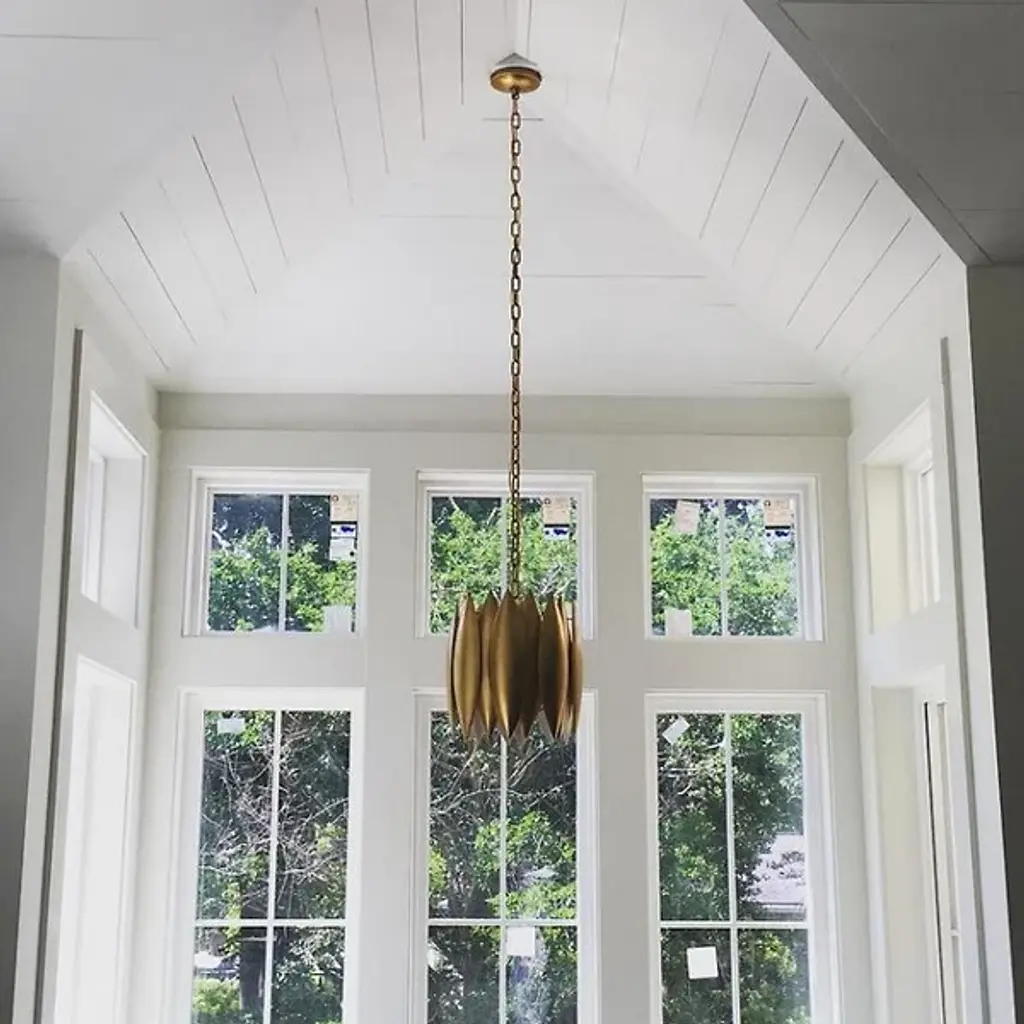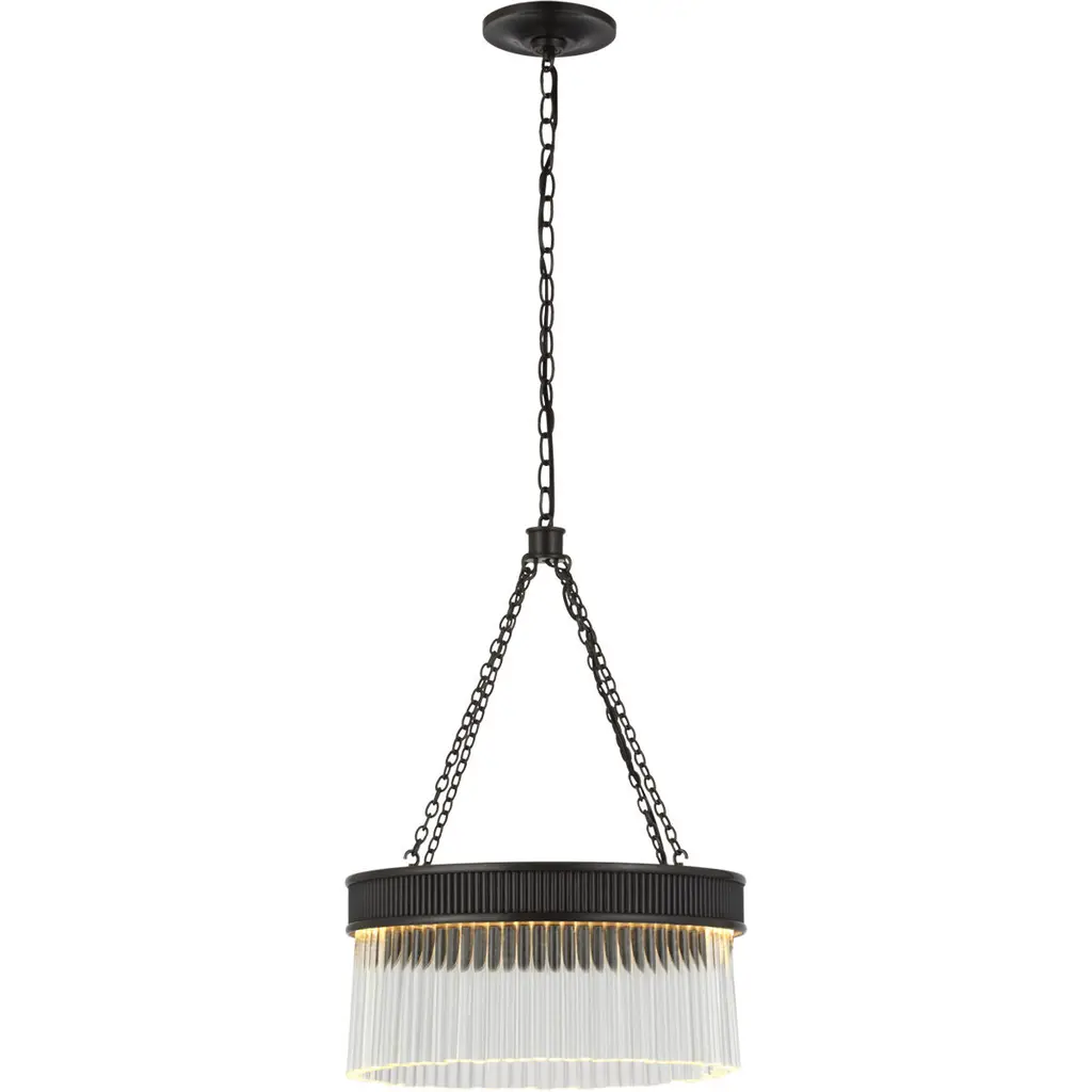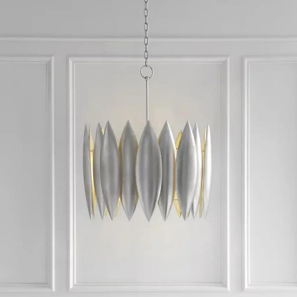 Visually impressive fixture created by designer Barry Goralnick. The Hatton Pendant by Visual Comfort Signature, formerly known as Visual Comfort, has a charming presence and feels right at home in a wide range of settings. It has a tranquil lamp shade composed of overlapping marquise-shaped metal pieces arranged around and fastened to a central column. Light from the internal source shines through the top, bottom, and gaps between the overlapping pieces of the shade and uplifts the ambiance of any setting.