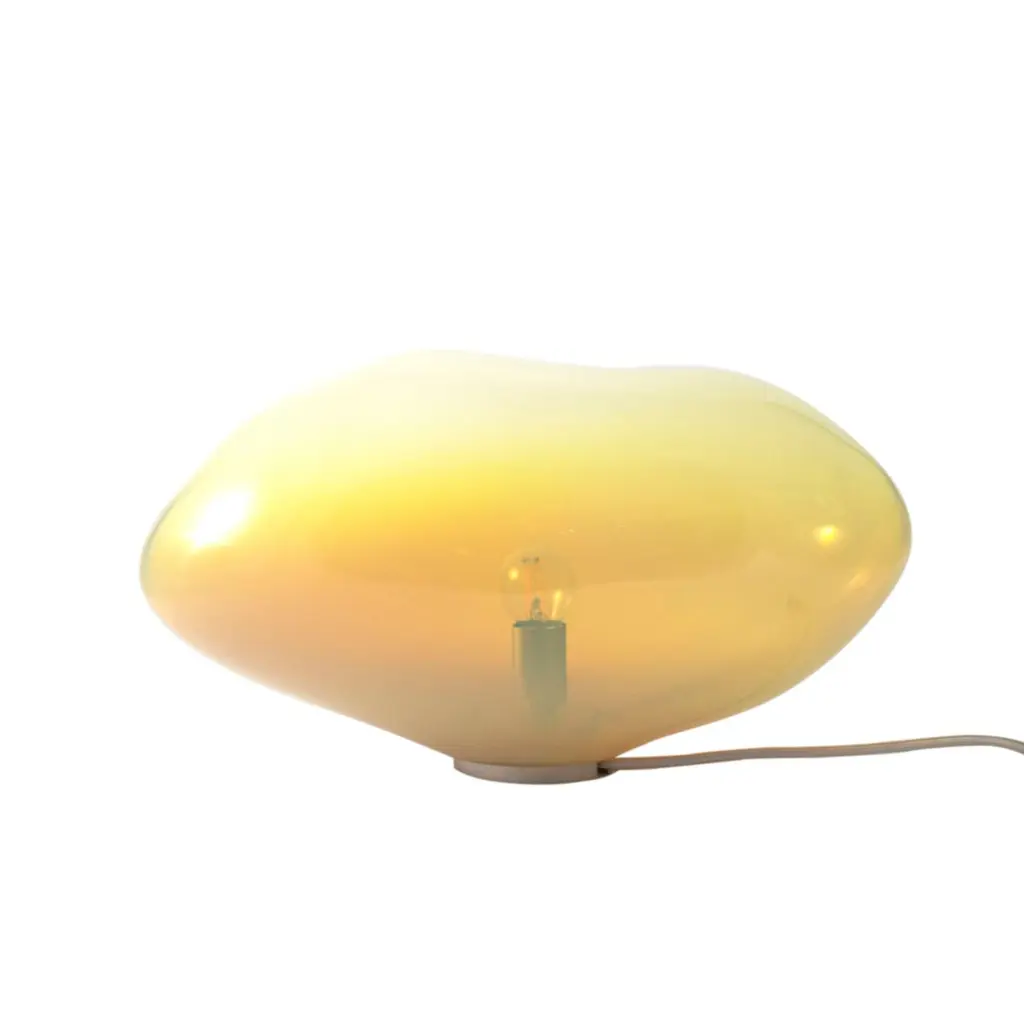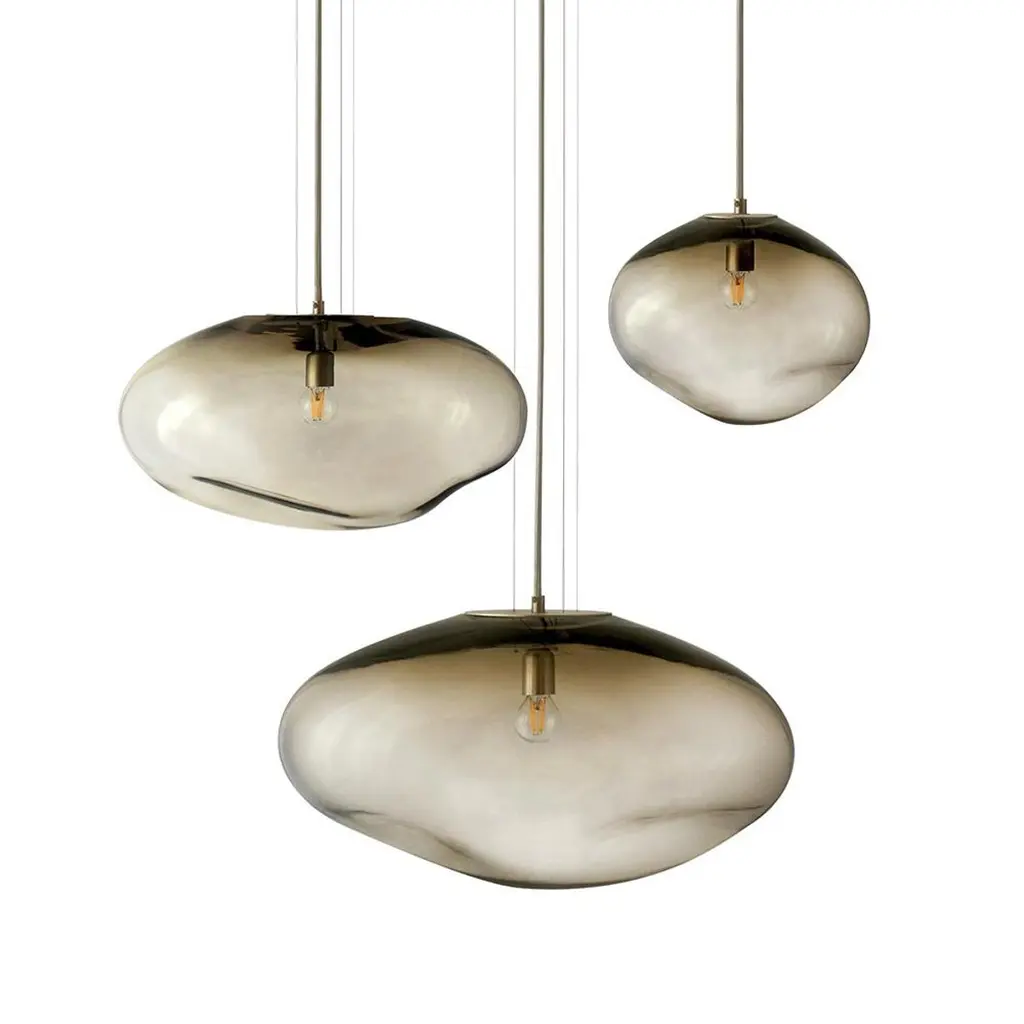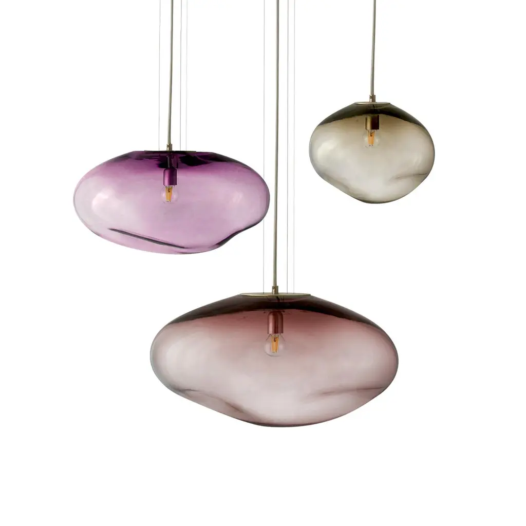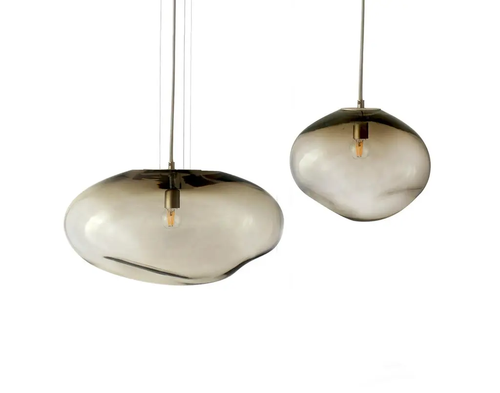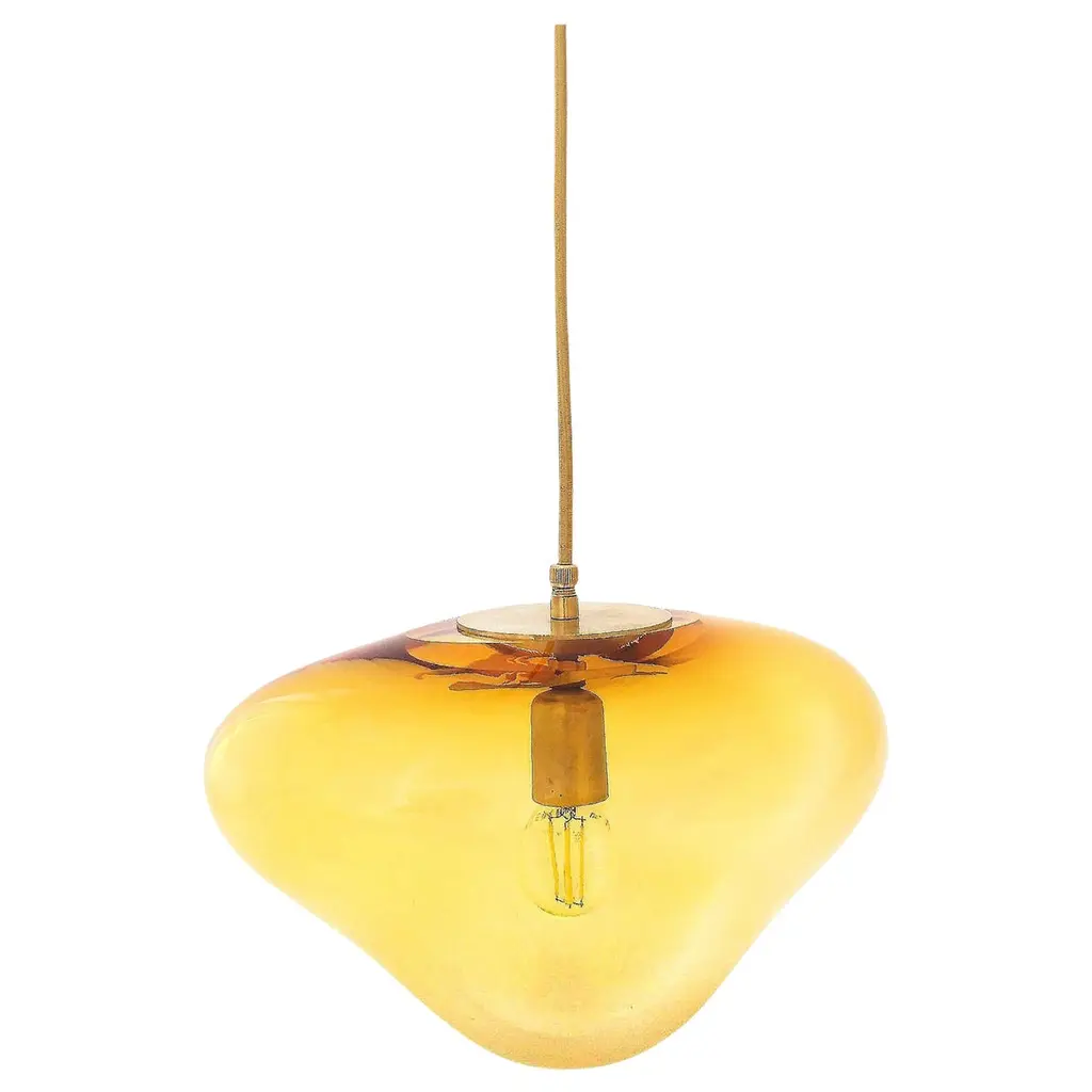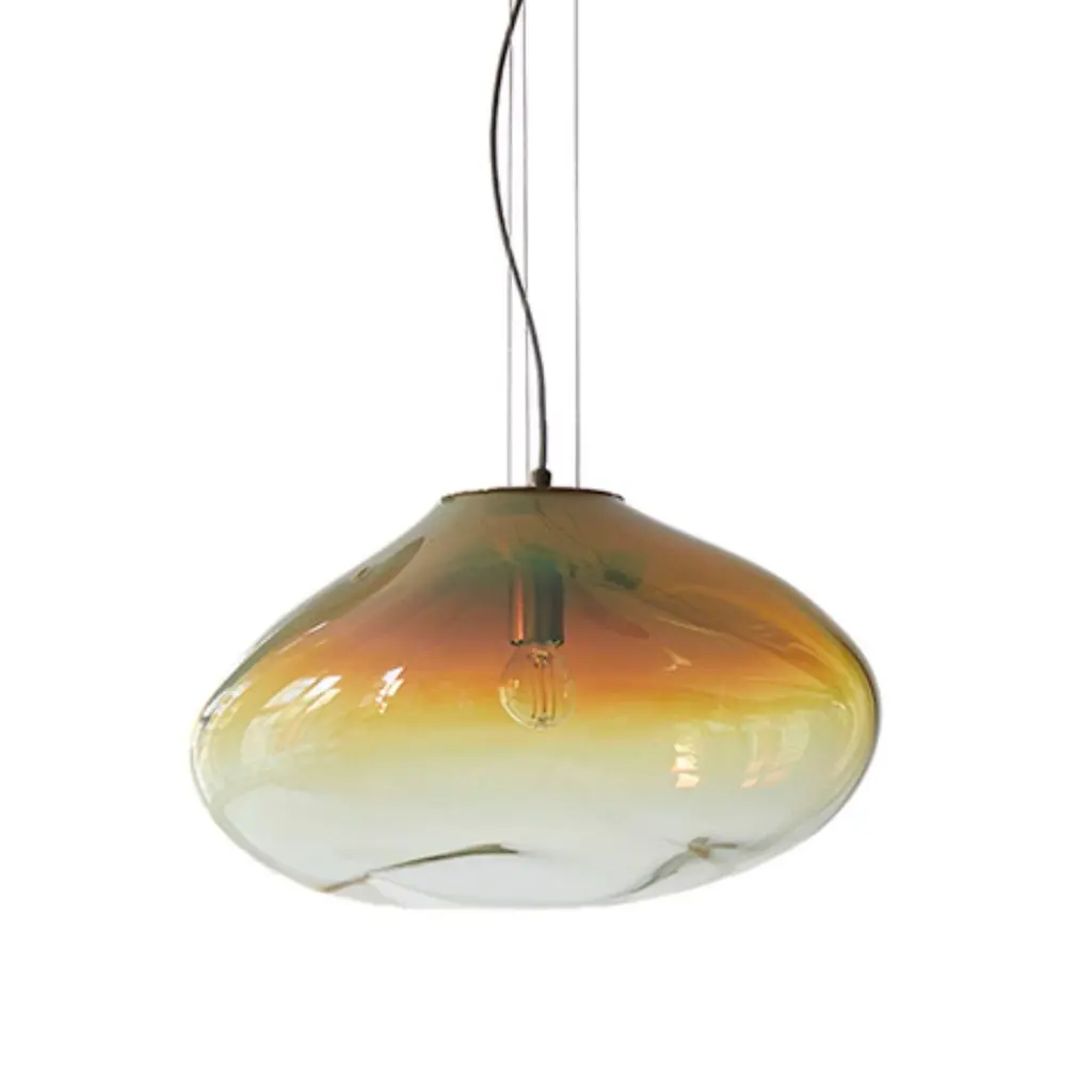 Haumea Amorph amber iridescent M pendant by Eloa.No UL listed Material: glass, steel, silver, LED bulbDimensions: D30 x W32 x H27 cmAlso available in different colors and dimensions.All our lamps can be wired according to each country. If sold to the USA it will be wired for the USA for instance.Haumea is an elliptical asteroid with a crystalline surface. ELOAs HAUMEAAMORPH is shaped as natural forms of giant soap bubbles morphing throughthe air. This brilliance then blends down softly into gradients of silversmoke color, which can seem wonderfully polar or soothingly warm depending on its orientation within your gaze. Its shape is The integrity of the blown glass gives it the flexibility of looking beautiful anywhere, whether used as a table piece or as a ceiling lamp. All our objects can be fabricated as hanging, floor, standing, or wall luminaries. The fixation and cable come optionally in gold (brass) or silver (nickle).Light objects float weightlessly in space. Fragile, iridescent, timeless. ELOA is amodular lighting system composed of unique handcrafted glass pieces. Select from a variety of hand-blown forms, which are one of a kindin shape, size andcolor - unique.Solitary or in constellation, the ELOA lights create individual light concepts andassociate with star constellations. Each glass piece is named after a star or a planet.They exist as hanging, floor, standing and wall luminaries.ELOA combines the Craft of ancient glassblowing with a simple, yet distinct design.In order to achieve the large size of the glass objects and working without forms, it takes a high level of refined craftsmanship and skill performed by only a few master glassblowers.