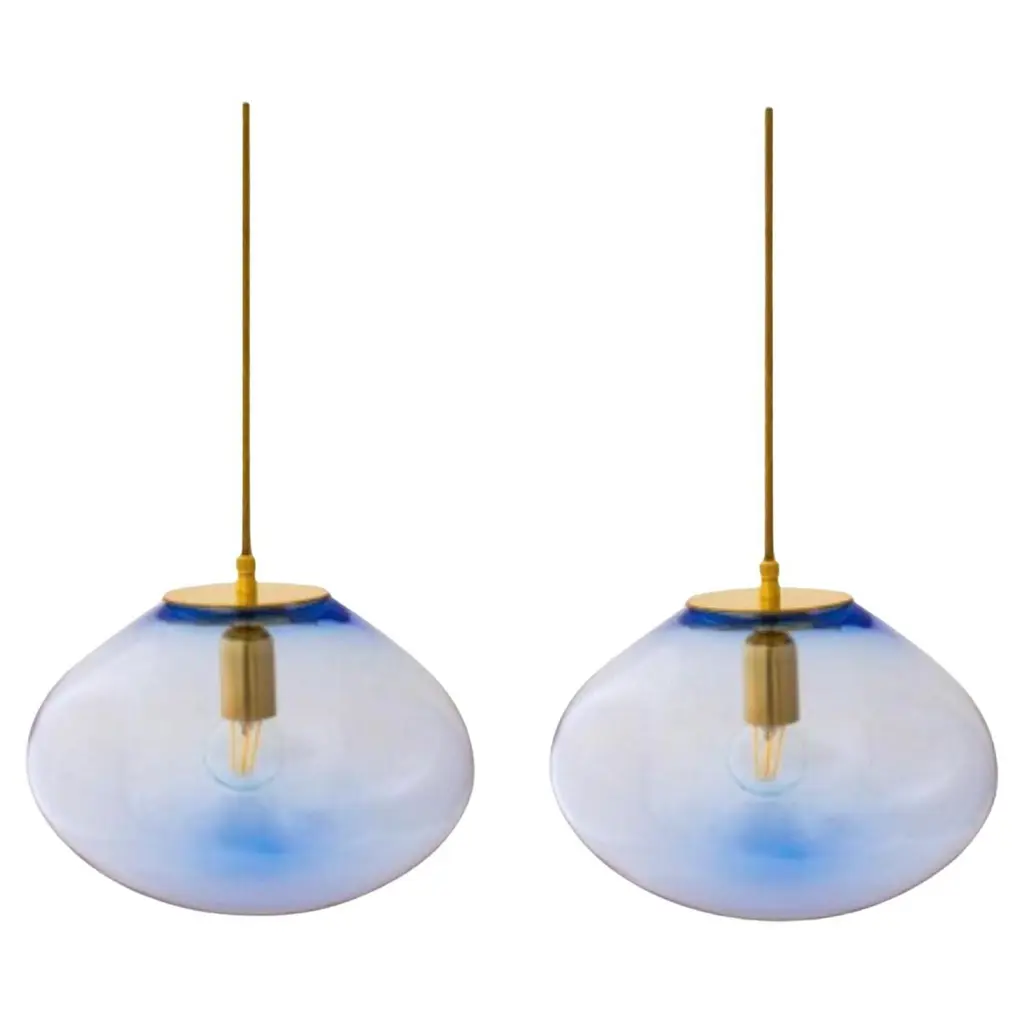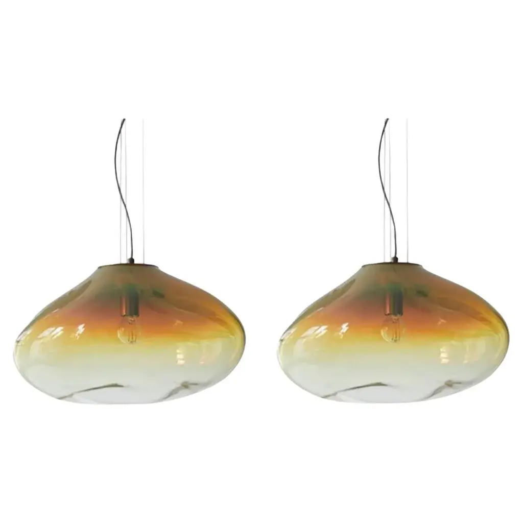 Set of 2 haumea amorph amber iridescent xl pendants by eloa. No ul listed material: glass, steel, silver, led bulb. Dimensions: d 35 x w 47 x h 32 cm. Also available in different colours and dimensions. All our lamps can be wired according to each country. If sold to the usa it will be wired for the usa for instance. Haumea is an elliptical asteroid with a crystalline surface. Eloa. Haumea amorph is shaped as natural forms of giant soap bubbles morphing through the air. This brilliance then blends down softly into gradients of silversmoke color, which can seem wonderfully polar or soothingly warm depending on its orientation within your gaze. Its shape is the integrity of the blown glass gives it the flexibility of looking beautiful anywhere, whether used as a table piece or as a ceiling lamp. up to 250v (europe/uk standard).