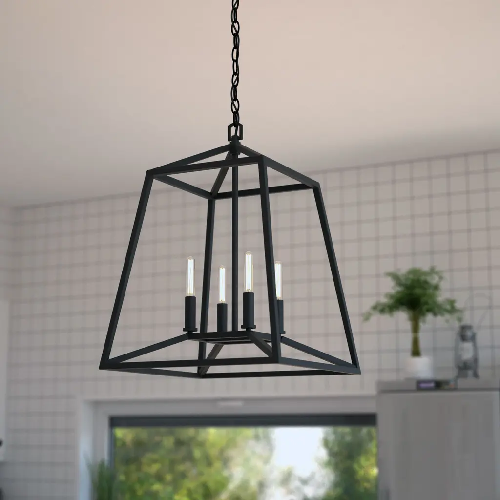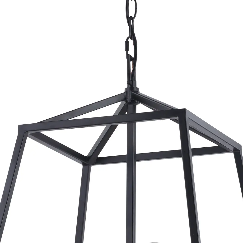 An open cage design and exposed light source define the Hayes pendant collection. Strong geometric lines finished in black surround vintage Edison style filament bulbs to complete the look. The open cage design means there is no glass to clean or fog up. Install these lantern pendants individually or in a group ideal for kitchens, dining areas, or bar areas. Use this damp rated ceiling light indoors or outdoors ideal for your covered porch, entryway, or any other area of your home.
