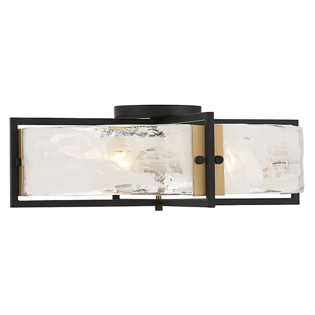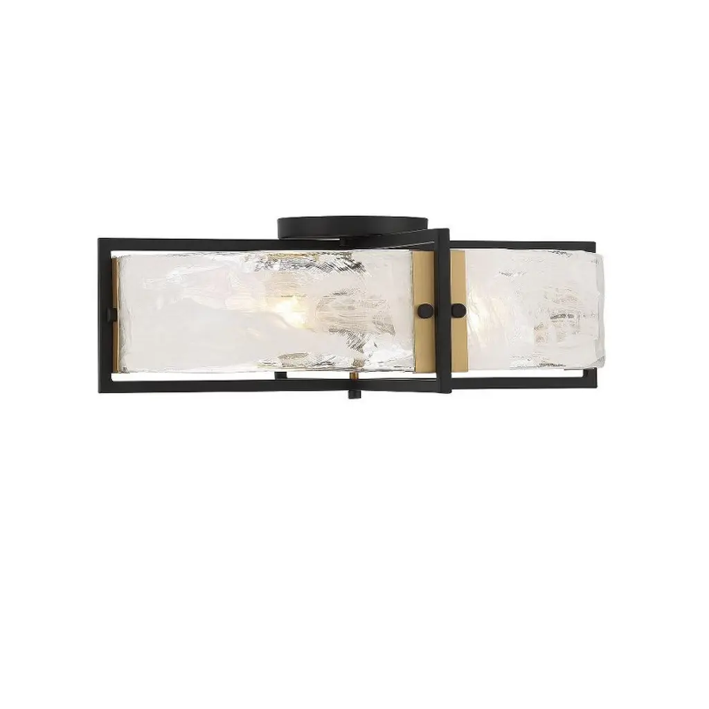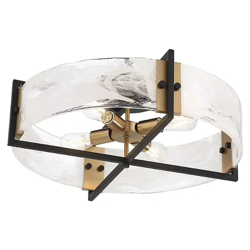 Modern style fuses with a slight vintage industrial flair to present the Hayward Semi-Flushmount, a fashionable piece of illumination released by Savoy House. A flat glass ring encompasses the perimeter, accented by a matte black metallic crisscross frame with warm brass finished brackets. Exposed bulbs from within will diffuse their light through the glass shade and cast the remaining in all directions, reflecting against the ceiling and unit itself. It’s a stylish and unique approach to interior lighting.
