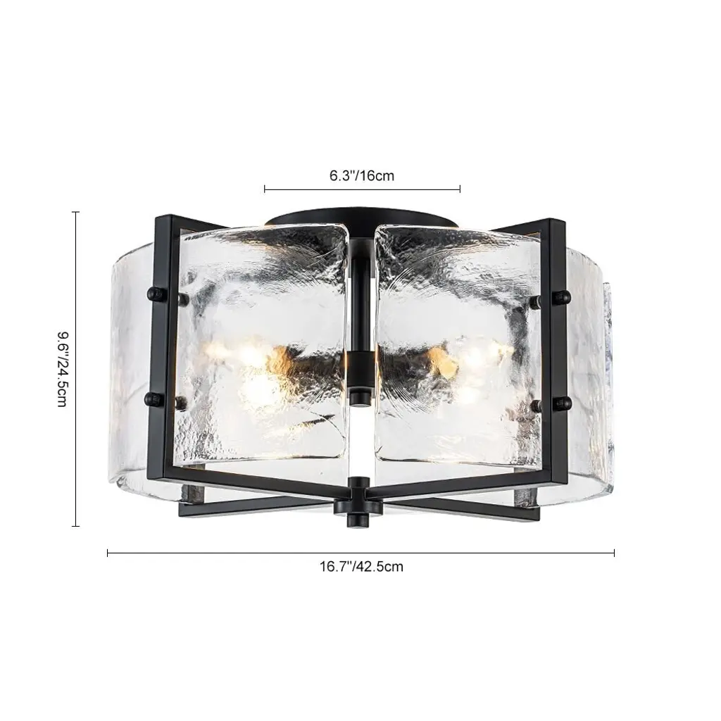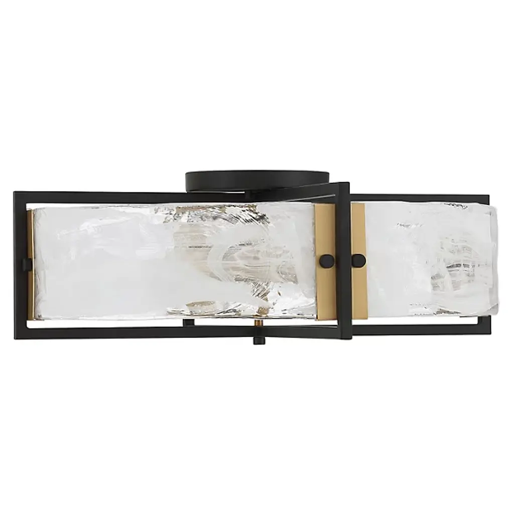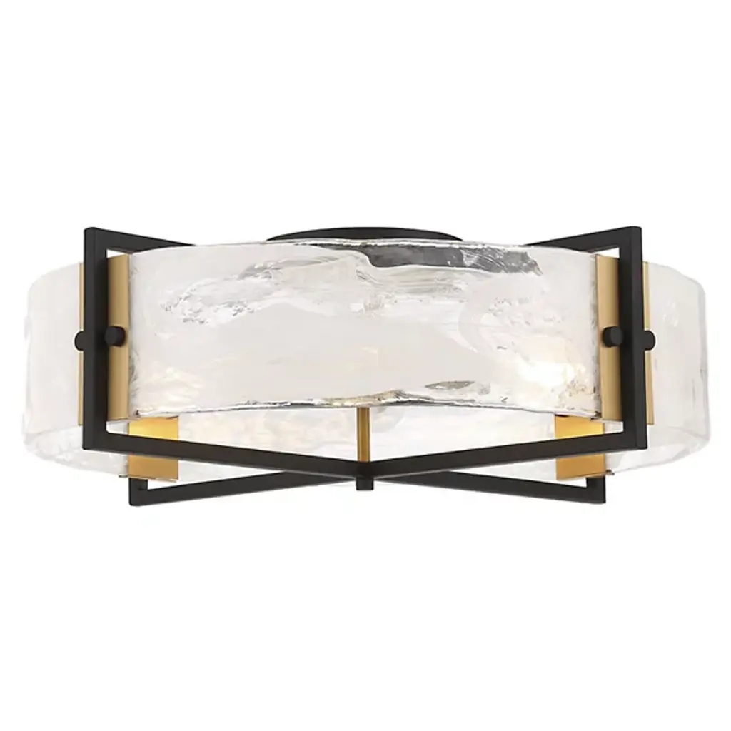 Modern style fuses with a slight vintage industrial flair to present the Hayward Semi-Flushmount, a fashionable piece of illumination released by Savoy House. A flat glass ring encompasses the perimeter, accented by a matte black metallic crisscross frame with warm brass finished brackets. Exposed bulbs from within will diffuse their light through the glass shade and cast the remaining in all directions, reflecting against the ceiling and unit itself. It’s a stylish and unique approach to interior lighting.