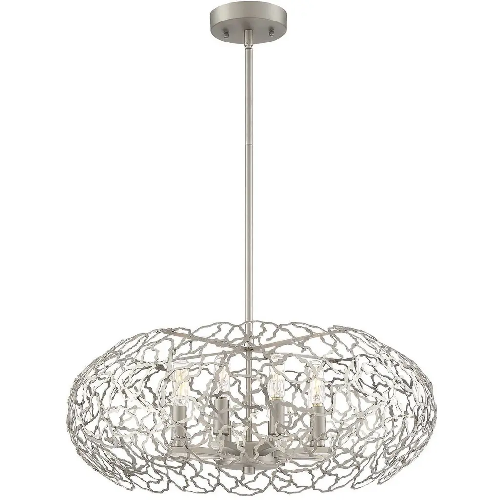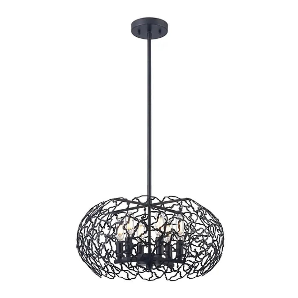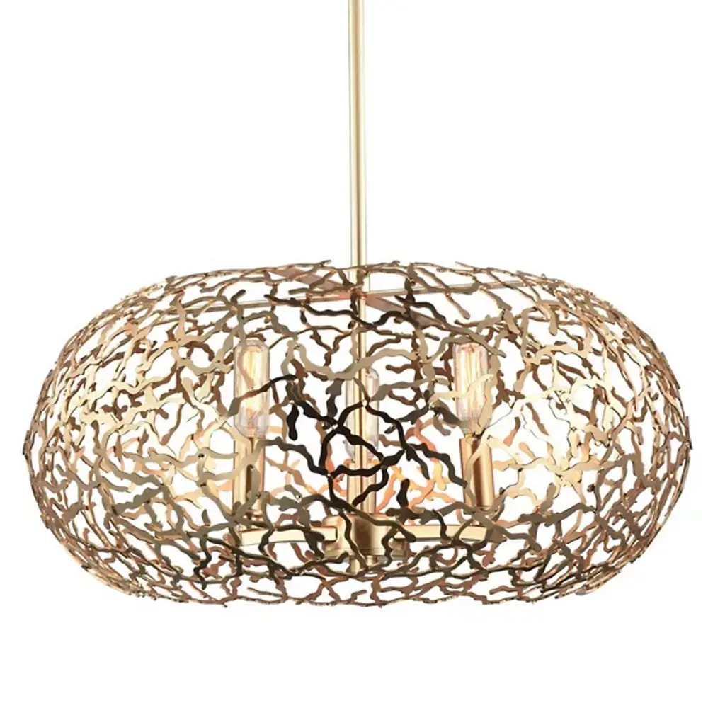 Let the sunshine in with the elegant, transitional lines of the Helios Pendant by Zeev Lighting. Starting with a conventionally arranged disc ceiling mount, it extends a central stem downward to a branching pattern of flat-cut metal, interwoven in a torus shape over the candelabra-style sockets. Best fitted with retro-style bulbs to enhance its intriguing appearance, the lamping is screened slightly above and to the sides for an interesting shadow effect, while the base of the shade is left open for a more functional spread of light below.
