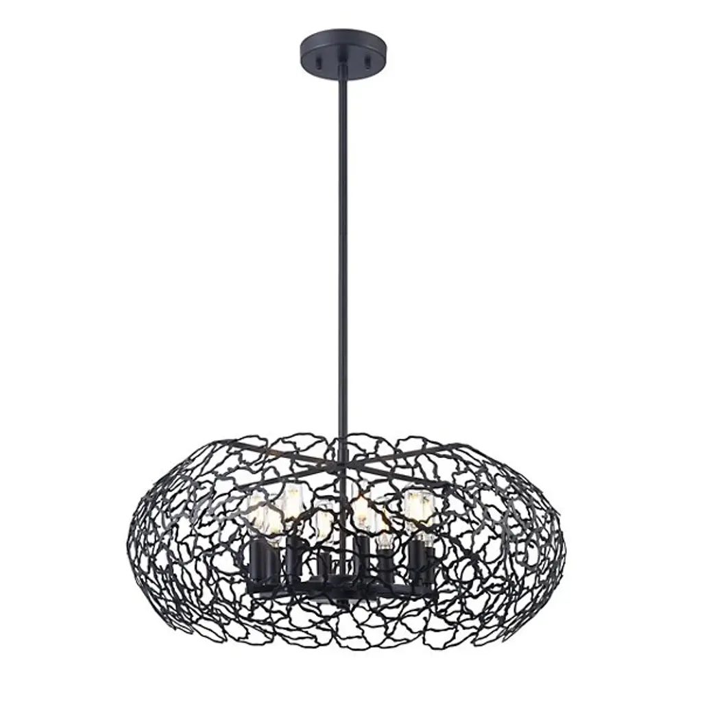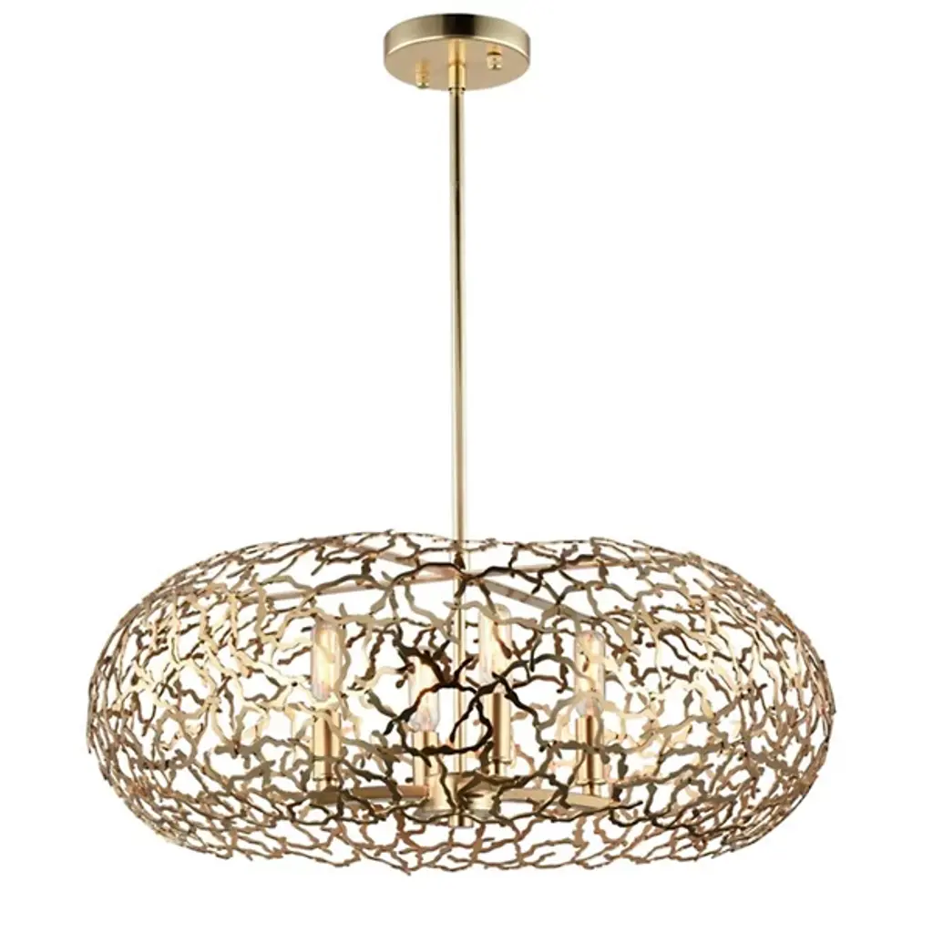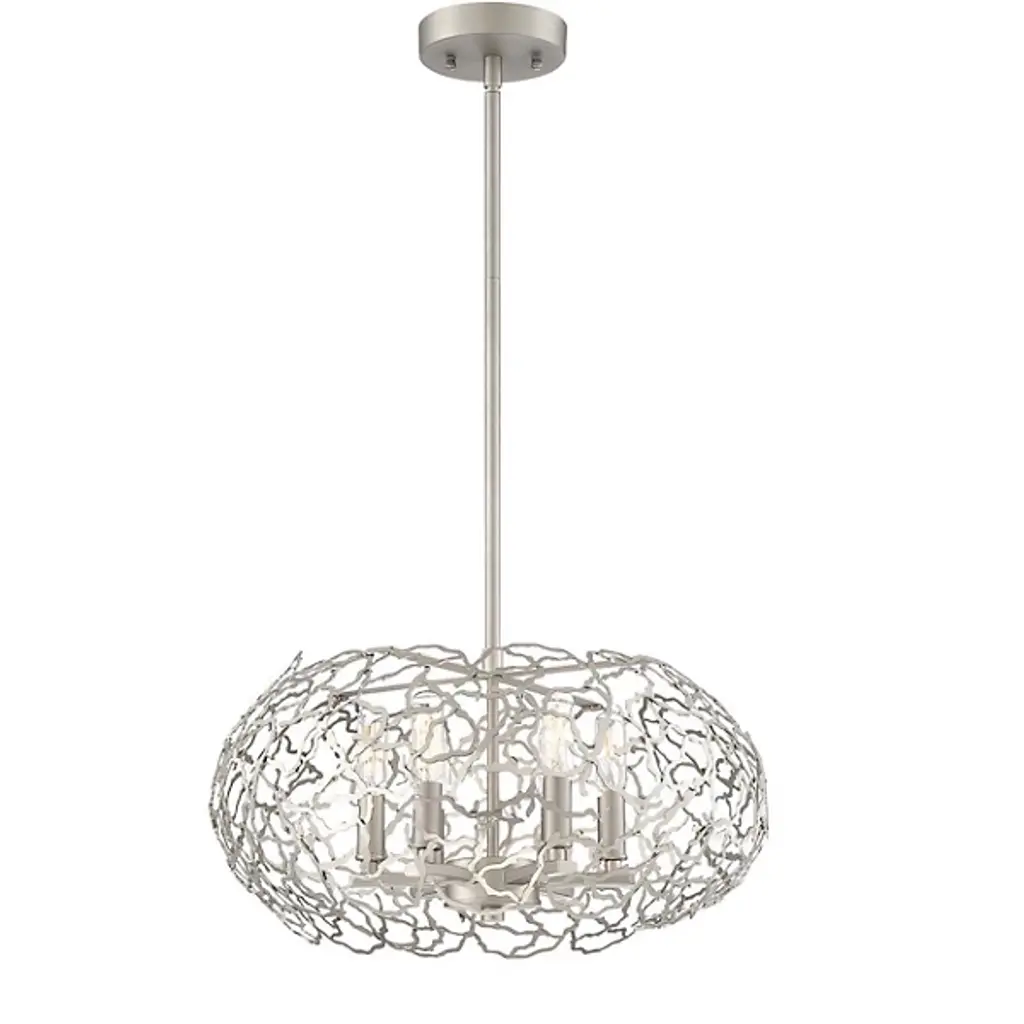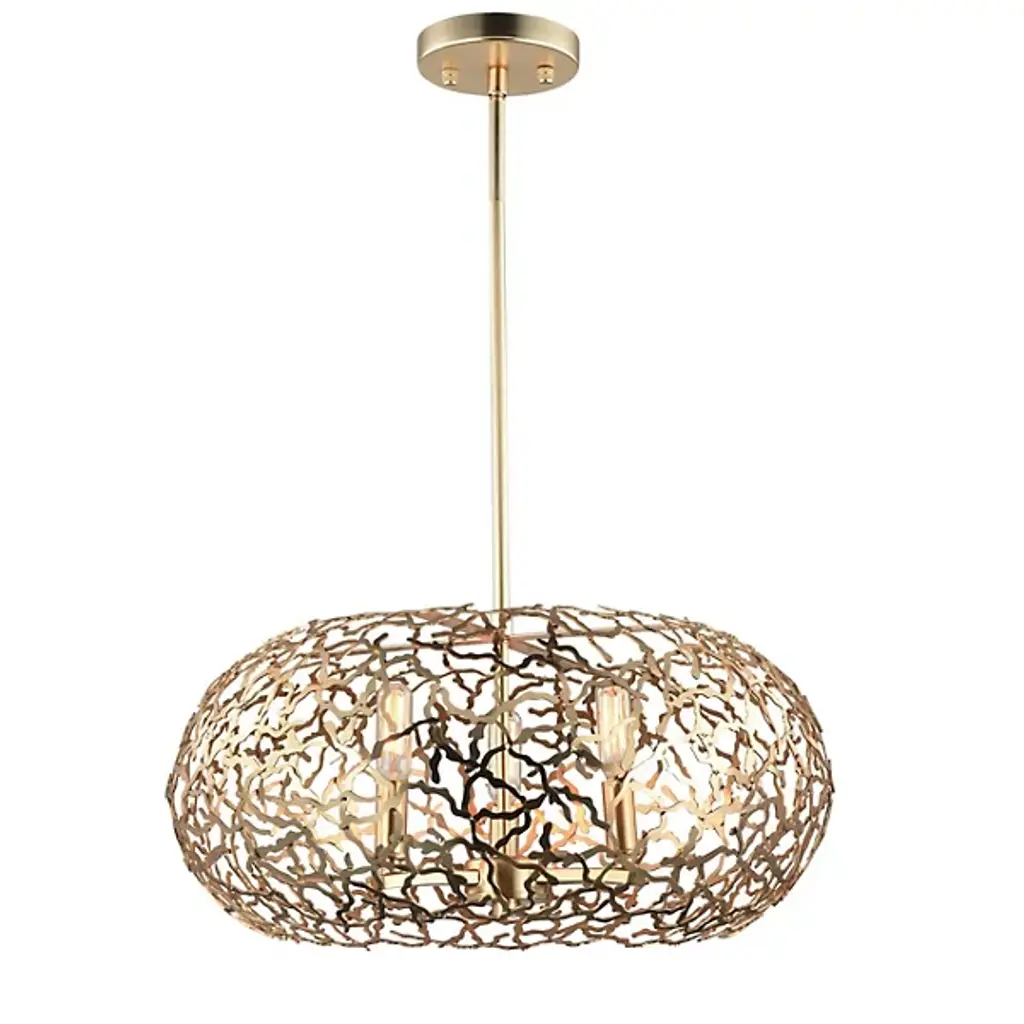 Let the sunshine in with the elegant, transitional lines of the Helios Pendant by Zeev Lighting. Starting with a conventionally arranged disc ceiling mount, it extends a central stem downward to a branching pattern of flat-cut metal, interwoven in a torus shape over the candelabra-style sockets. Best fitted with retro-style bulbs to enhance its intriguing appearance, the lamping is screened slightly above and to the sides for an interesting shadow effect, while the base of the shade is left open for a more functional spread of light below.
