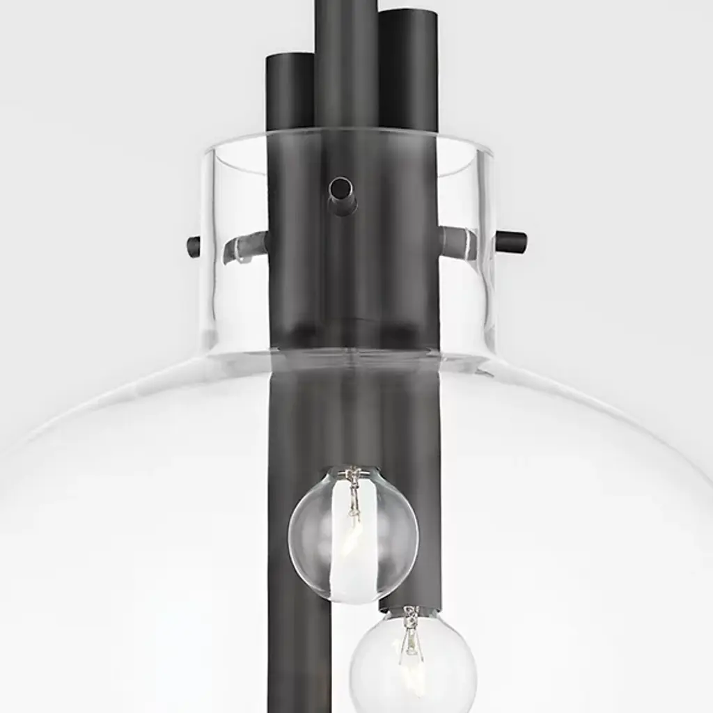 The Hempstead Pendant by Hudson Valley Lighting is a refined take on a designer's-favorite contemporary look for the home or office. Made using artisan-crafted elements, this fixture is centered on a delicate clear glass globe shade that features a tall chimney top accent inspired by classic oil lamp designs. This shade houses a simple filament style Edison bulb that is suspended from a simple matte finish metal frame for a complete look. It's a standalone minimalist style perfect for kitchen islands, entryways, and more.