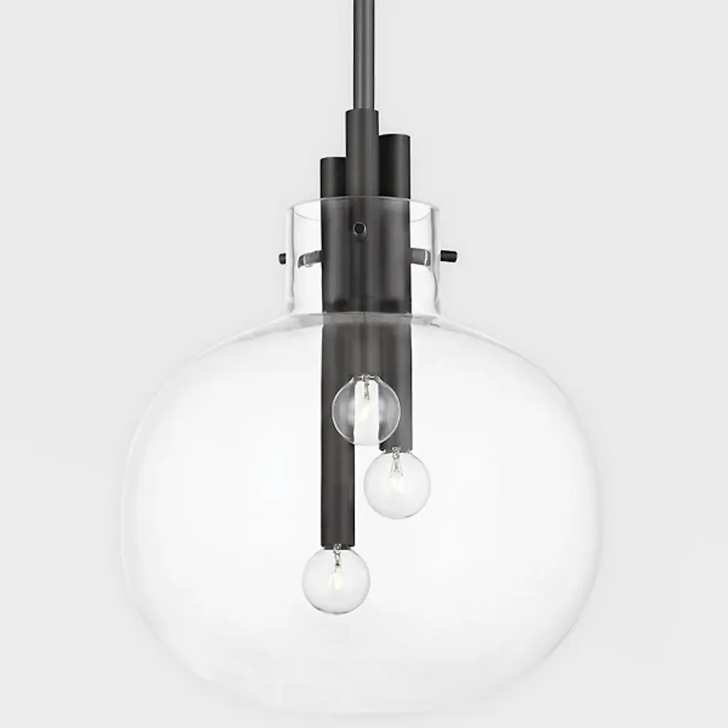 The Hempstead Pendant by Hudson Valley Lighting is a refined take on a designer's-favorite contemporary look for the home or office. Made using artisan-crafted elements, this fixture is centered on a delicate clear glass globe shade that features a tall chimney top accent inspired by classic oil lamp designs. This shade houses a simple filament style Edison bulb that is suspended from a simple matte finish metal frame for a complete look. It's a standalone minimalist style perfect for kitchen islands, entryways, and more.