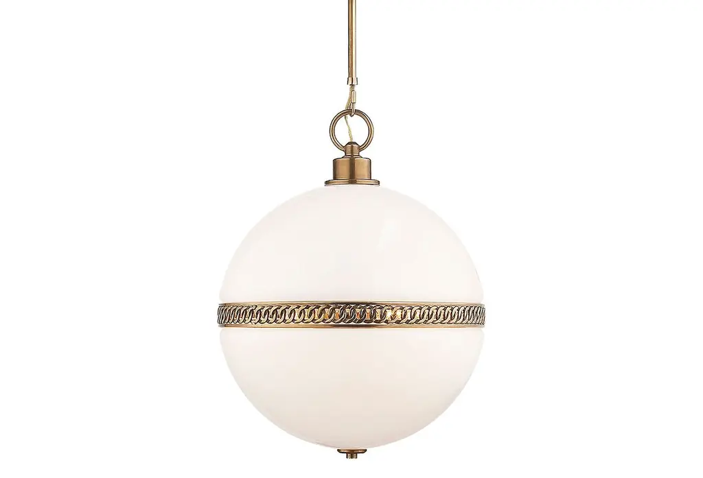 We love how a textural brass relief and matching canopy lend this otherwise sleek-and-simple globe pendant a note of industrial charm. Hardwired.