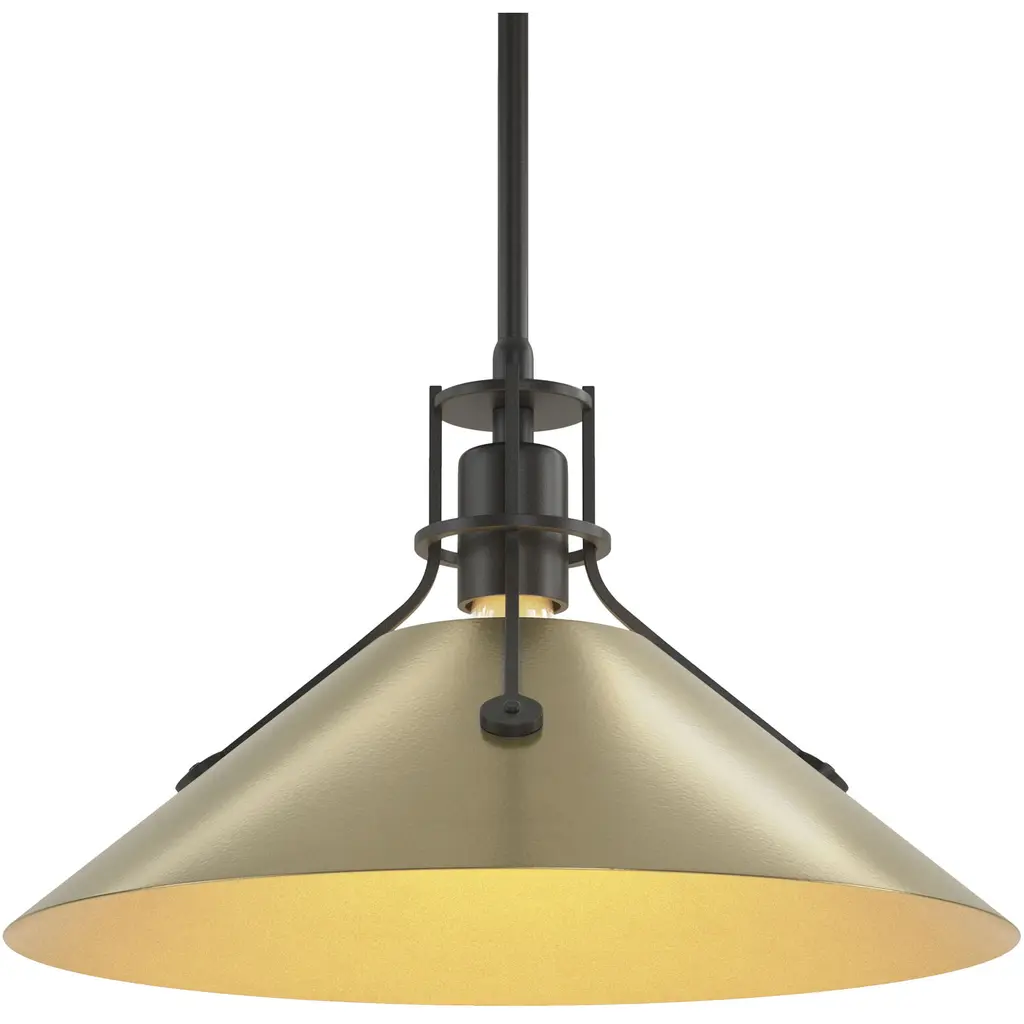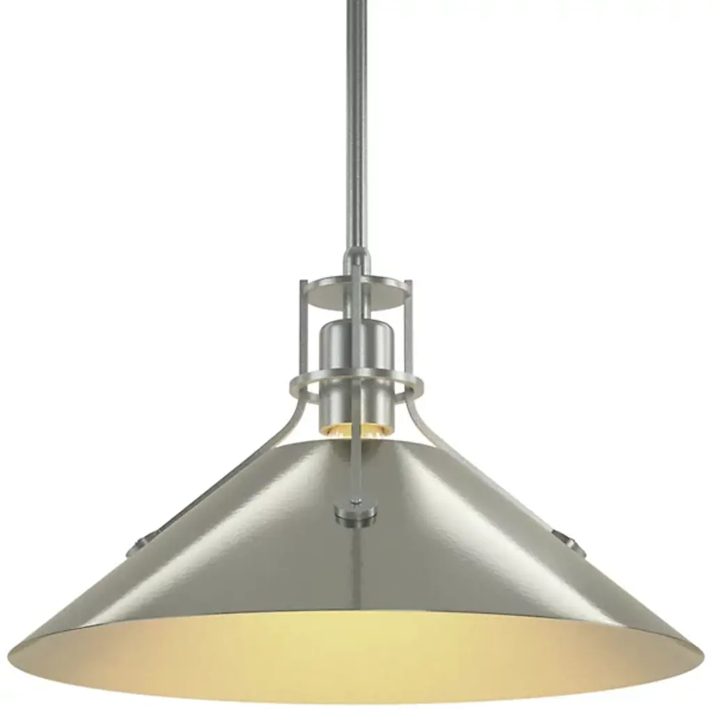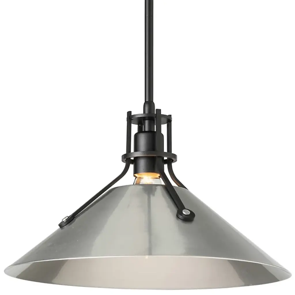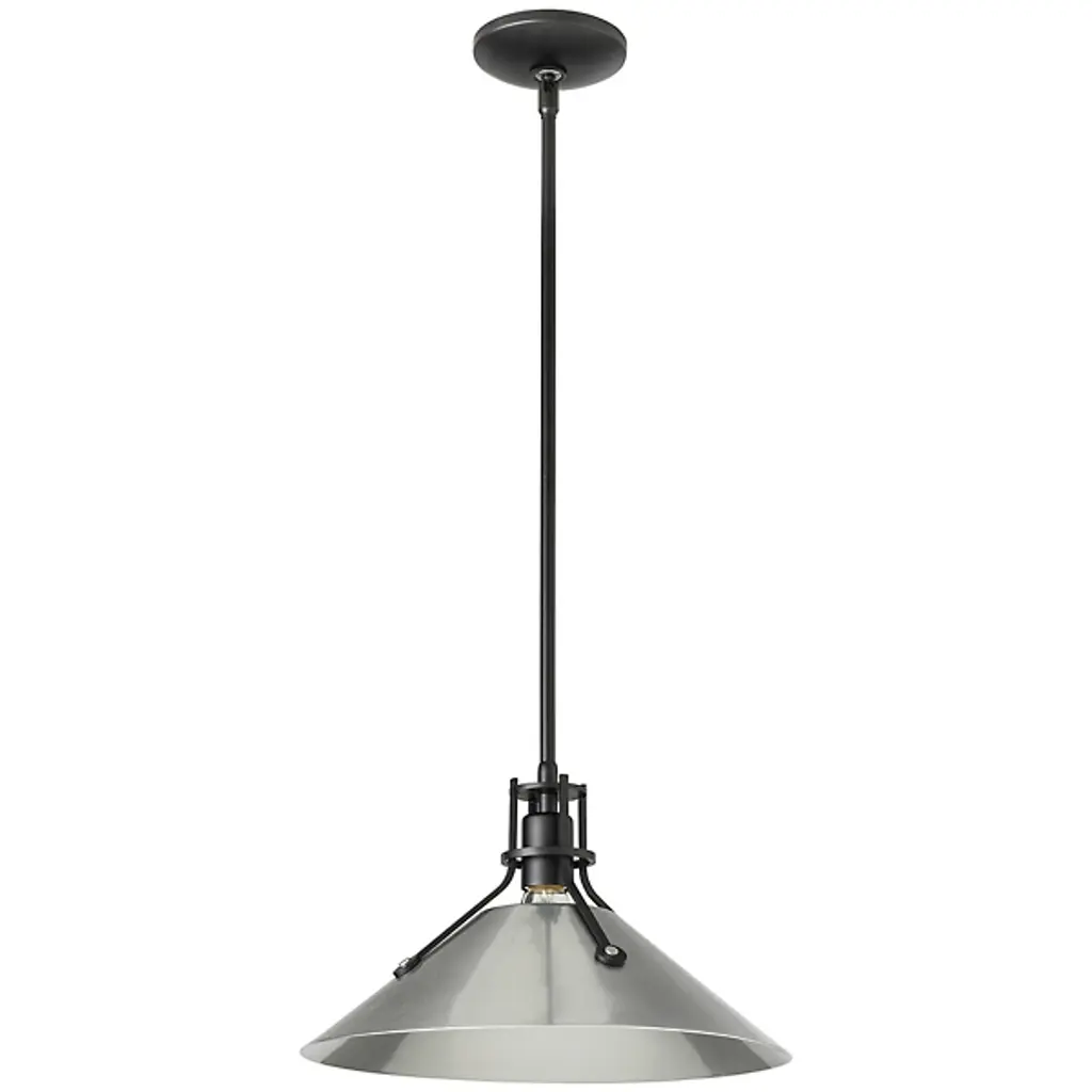 A remarkable take on industrial-inspired designs, the Henry Medium Steel Shade Pendant by Hubbardton Forge takes design savvy up a notch. A complete steel and metal construction makes this light fixture a cold, stark appeal. The medium-sized conical steel shade is a trademark of Henry, held by slim steel arms with rivets that add to the mechanical feel. Hang this pendant light above a workstation or desk to create focused light where you need it most.