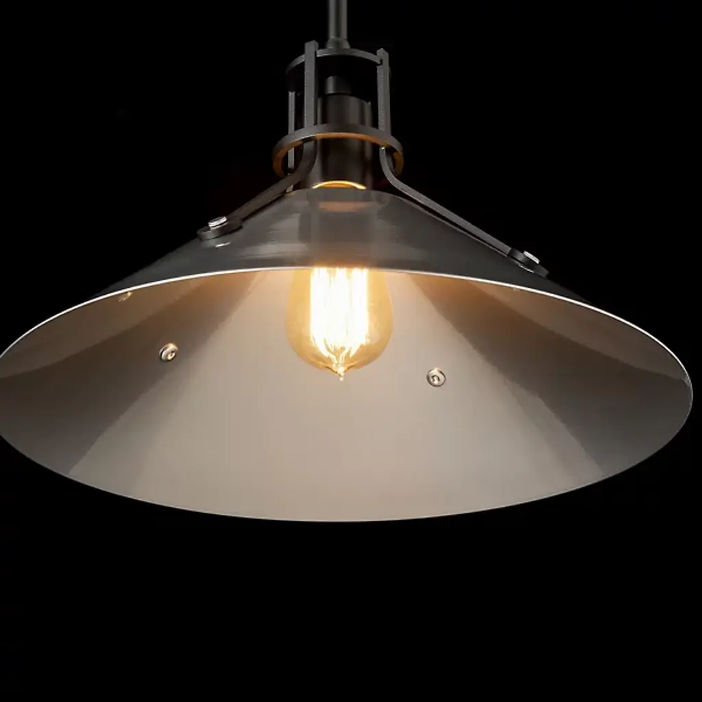 A remarkable take on industrial-inspired designs, the Henry Medium Steel Shade Pendant by Hubbardton Forge takes design savvy up a notch. A complete steel and metal construction makes this light fixture a cold, stark appeal. The medium-sized conical steel shade is a trademark of Henry, held by slim steel arms with rivets that add to the mechanical feel. Hang this pendant light above a workstation or desk to create focused light where you need it most.
