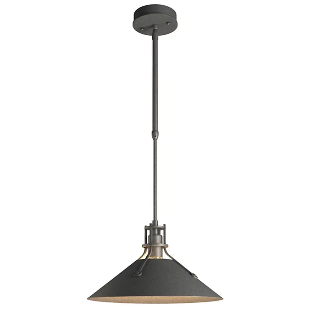 Bring bright light to your outdoor areas with the smooth and tasteful Henry Outdoor Medium Pendant by Hubbardton Forge. Industrial in style, it uses a simple disc and an adjustable stem arrangement to hold a single socket inside a beveled, outward-flaring shade made of aluminum. The open top allows some sparks of light to peek out above, while the smooth metal interior casts a wide pool of direct light below, spreading a layer of light around the fixture’s surroundings.