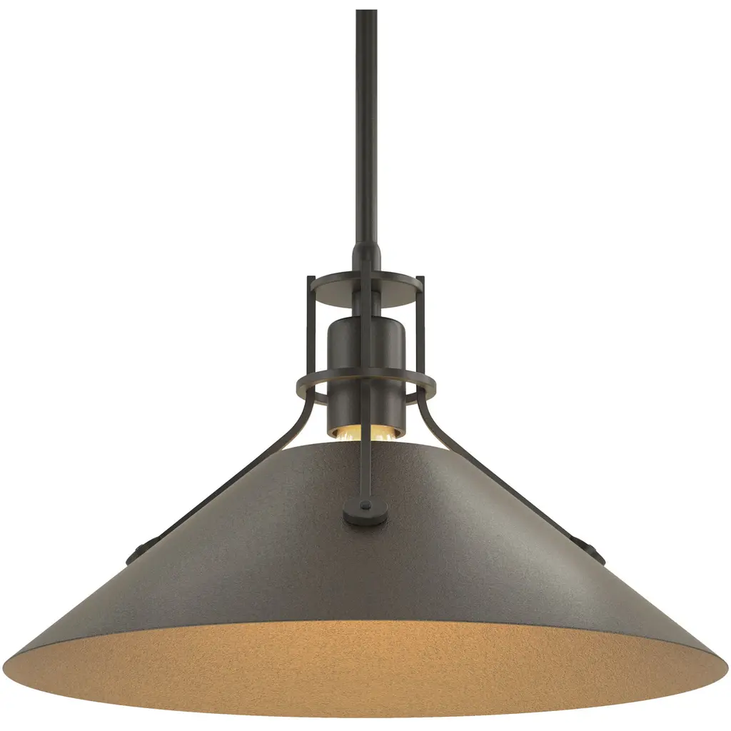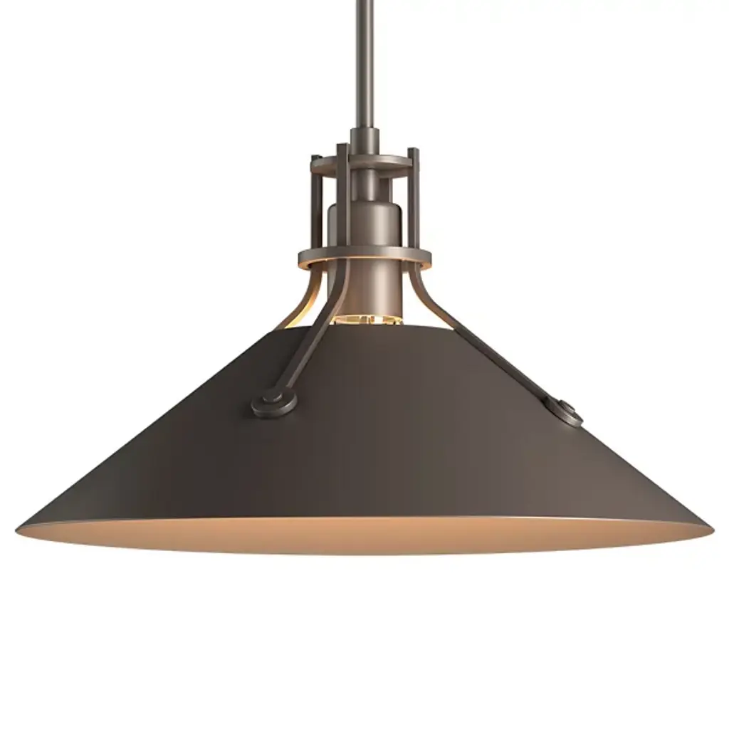 With a stylish blend of modern style and traditional character, the Henry with Chamfer Pendant by Hubbardton Forge is a handsome addition to any interior décor. Dropped from a slender downrod, its base is adorned with banded fittings that lend a bold industrial effect. Its smooth chamfer shade nestles a series of bulbs inside its conical form, channeling its warm light downward for an intimate ambiance and practical illumination ideal over dining spaces.