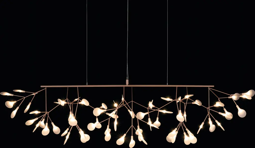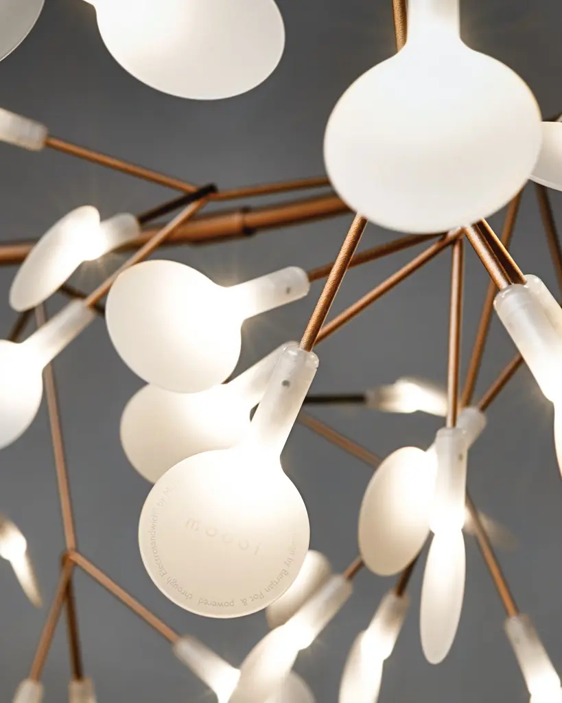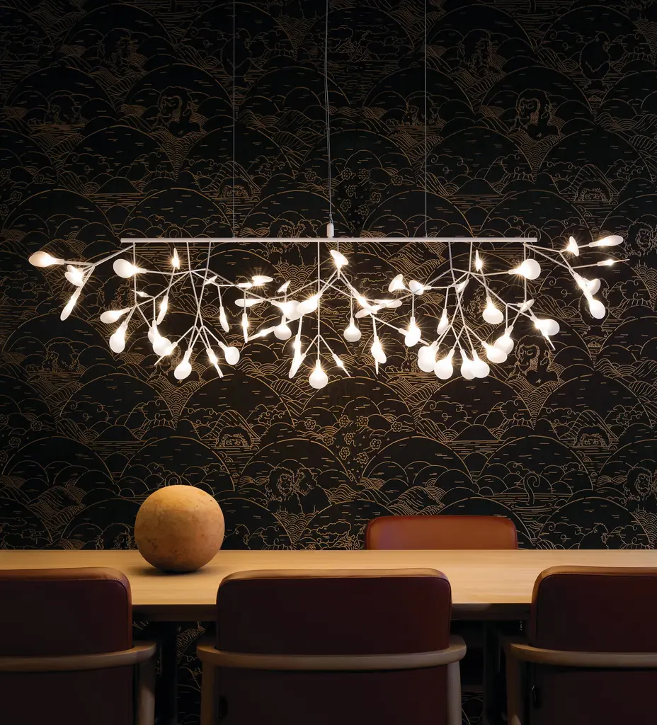The Heracleum III Linear Pendant (2014) hangs like a chandelier of flowers. Named for the plant that inspired it, Heracleum consists of LEDs embedded in leaf-shaped polycarbonate lenses attached to slim metal stems to create a natural-looking form. Each lens can be rotated, allowing for endless configurations. Designed by Bertjan Pot, Heracleum is included in the collection of the Stedelijk Museum Amsterdam. Bulbs (included): multiple LEDs, 22 total watts, 1872 lumens, 2600 (warm) color temp. UL Listed. Please review the assembly instructions for correct installation and function. If using a Lutron Wall Switch, please contact our sales team to inquire about the compatible Wireless Wall Switch or Driver. Made in the Netherlands.