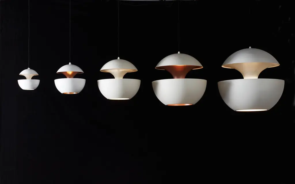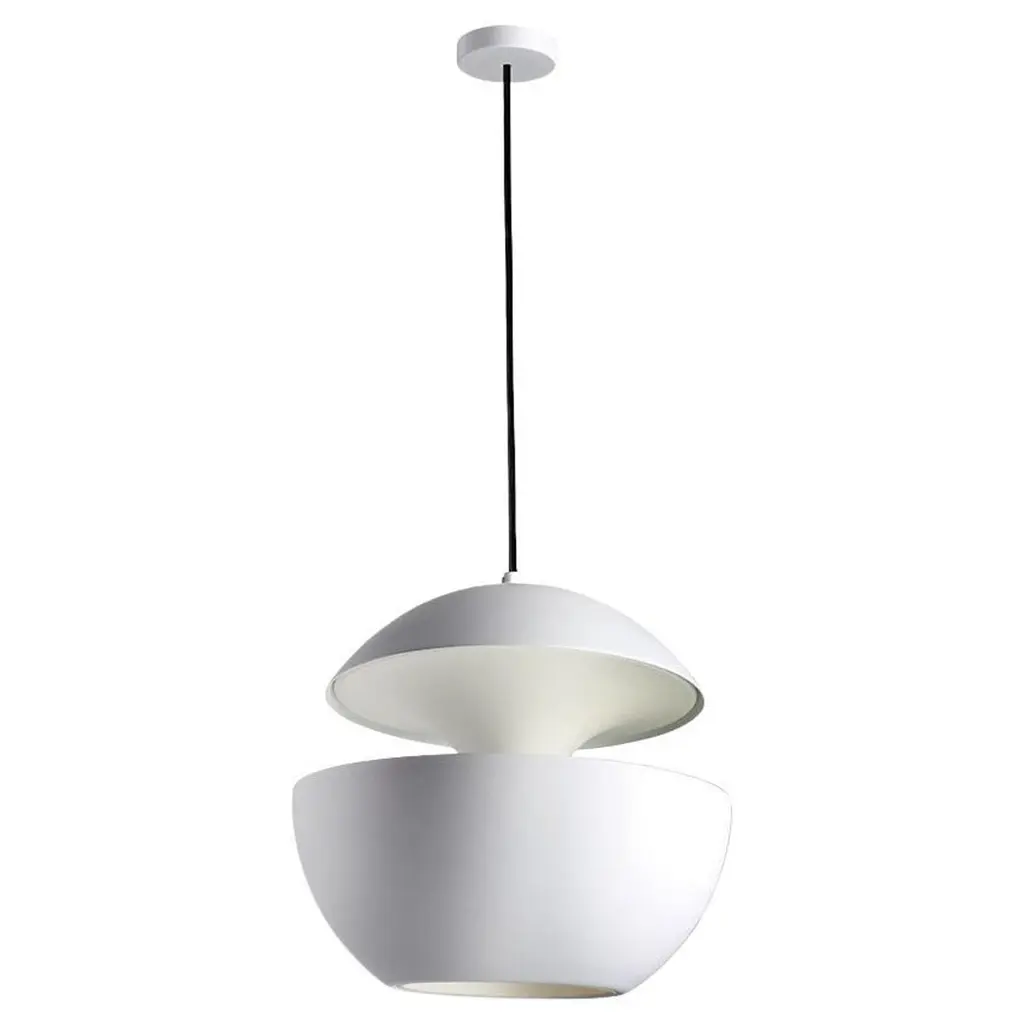 Here comes the sun large white pendant lamp by Bertrand BalasDimensions: D 35 x H 35 cmMaterials: AluminumAvailable in different sizes and colors,All our lamps can be wired according to each country. If sold to the USA it will be wired for the USA for instance.Pendant lamp inspired by the setting sun. It can be arranged alone or in a cluster.Bertrand Balas, born in Toulouse in 1935 likes to watch the sun set over the Garonne river. With that musical lilt typical of the south, he likes to say : " It does me good ". In August 1970 he designed the lamp Here Comes the Sun. At first glance, this original design is like all the other lamps that get called an " original ". But once lit, the Here Comes the Sun hanging lamp takes on a magical quality. Darkness looses its rawness and metamorphoses into something reassuring.At the same time as Balas was designing his lamp, in the Spring of 1969, the Beatles were having difficulties ; tension was running high and relations between the members distinctly frosty. All of which prompted George Harrison to write Here Comes The Sun. After the cold and ice of the winter it is always good to feel the first rays of sunshine.The song came out in 1970, just a few days before Bertrand Balas lamp, prompting him to change the name, just in case the Beatles might take offence. In fact, they could have taken the stage together...