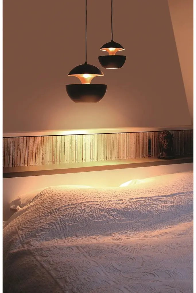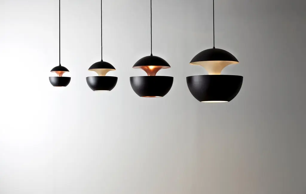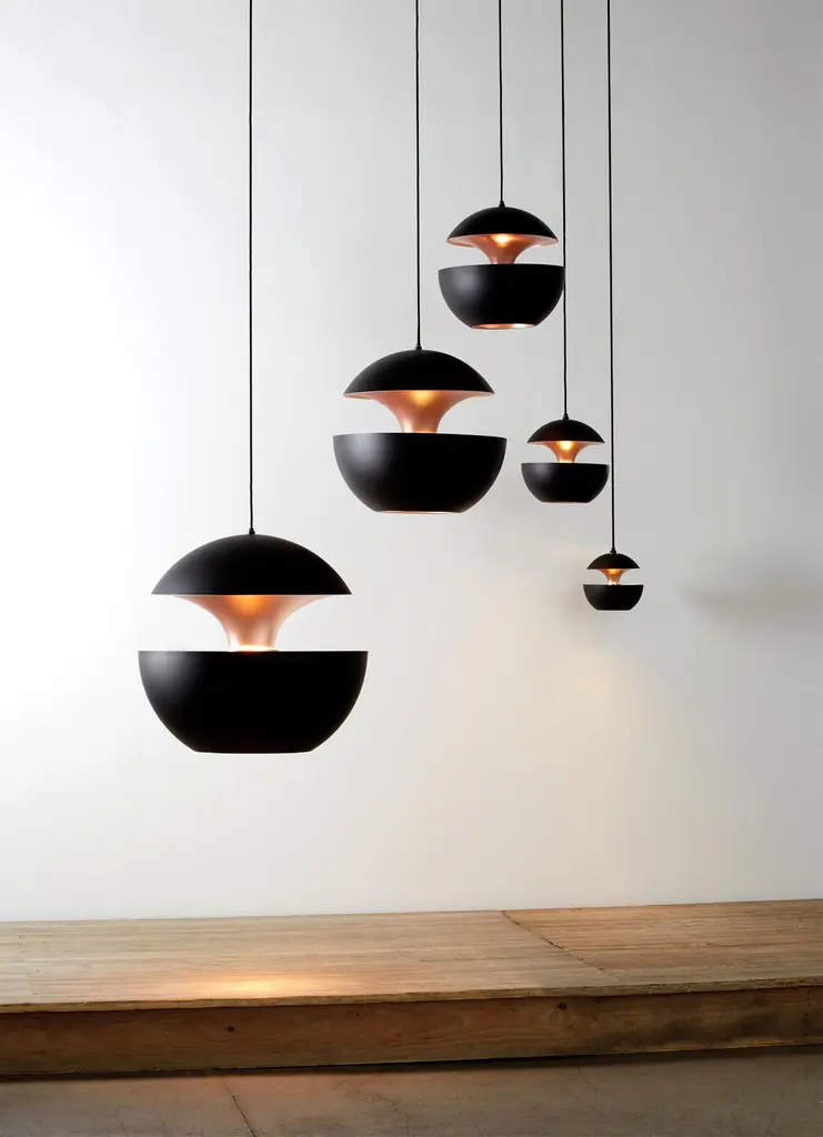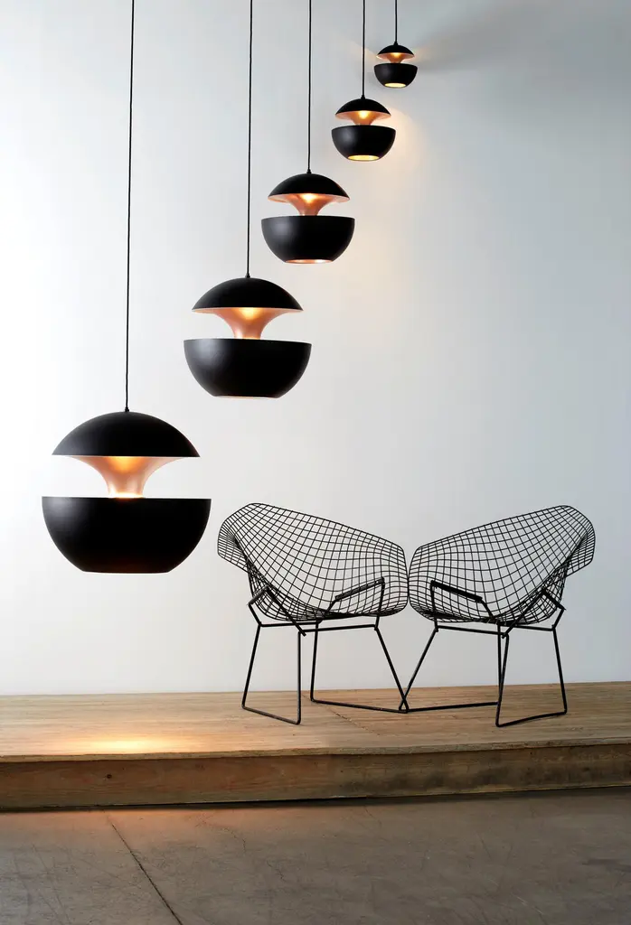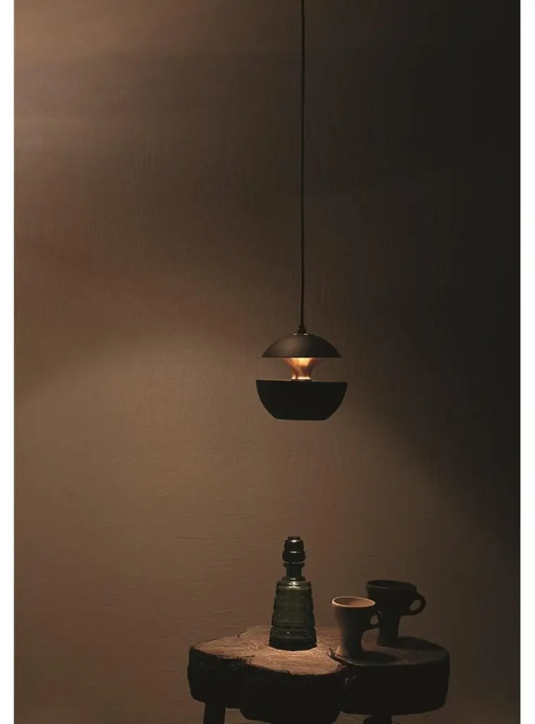 Here comes the sun small black and copper pendant lamp by Bertrand BalasDimensions: D 17.5 x H 17.5 cmMaterials: AluminumAvailable in different sizes and colors.All our lamps can be wired according to each country. If sold to the USA it will be wired for the USA for instance.Pendant lamp inspired by the setting sun. It can be arranged alone or in a cluster.Bertrand Balas, born in Toulouse in 1935 likes to watch the sun set over the Garonne river. With that musical lilt typical of the south, he likes to say : " It does me good ". In August 1970 he designed the lamp Here Comes the Sun. At first glance, this original design is like all the other lamps that get called an " original ". But once lit, the Here Comes the Sun hanging lamp takes on a magical quality. Darkness looses its rawness and metamorphoses into something reassuring.At the same time as Balas was designing his lamp, in the Spring of 1969, the Beatles were having difficulties ; tension was running high and relations between the members distinctly frosty. All of which prompted George Harrison to write Here Comes The Sun. After the cold and ice of the winter it is always good to feel the first rays of sunshine.The song came out in 1970, just a few days before Bertrand Balas lamp, prompting him to change the name, just in case the Beatles might take offence. In fact, they could have taken the stage together...