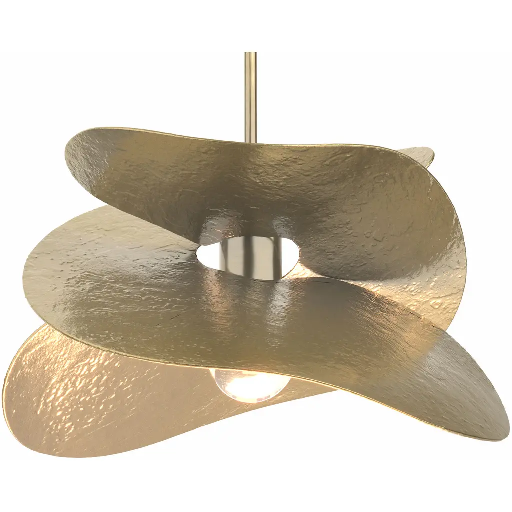 The Hibiscus Pendant puts Hubbardton Forge makers metalcrafting skills on full display. Beautifully textured metal "petals" from the heat of the forge embrace the light below. The Hibiscus Small version just over 15" in width, perfect to hang in multiples over a kitchen island or bar, and versatile enough to hang singly in other spaces. Also available in a larger size, as well as an outdoor pendant option.