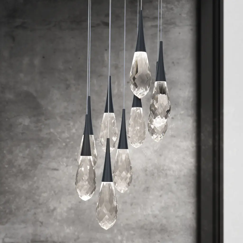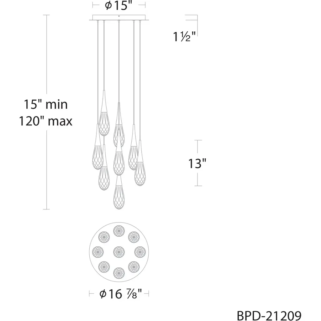 Crystal fashion comes to light in unique forms. Delicate, graceful drops of exquisite crystal embraced by tapered metal forms that glow with a charming luster. Matching crystal overlays are applied to the metal canopies for an additional touch of luxury. Two mini pendant sizes are offered. Schonbek Beyond LED luminaires feature a 3-CCT color temperature selectable switch that can be accessed at the time of installation to toggle between 3000K-3500K-4000K color temperatures. Hibiscus is offered in multi-light (3 Light, 5 Light, and 9 Light) or single light configurations. Ultra-sleek electrified cables eliminate the need for clunky power wires and the height is simple to adjust through push pin connectors on the canopy up to 10ft of length.