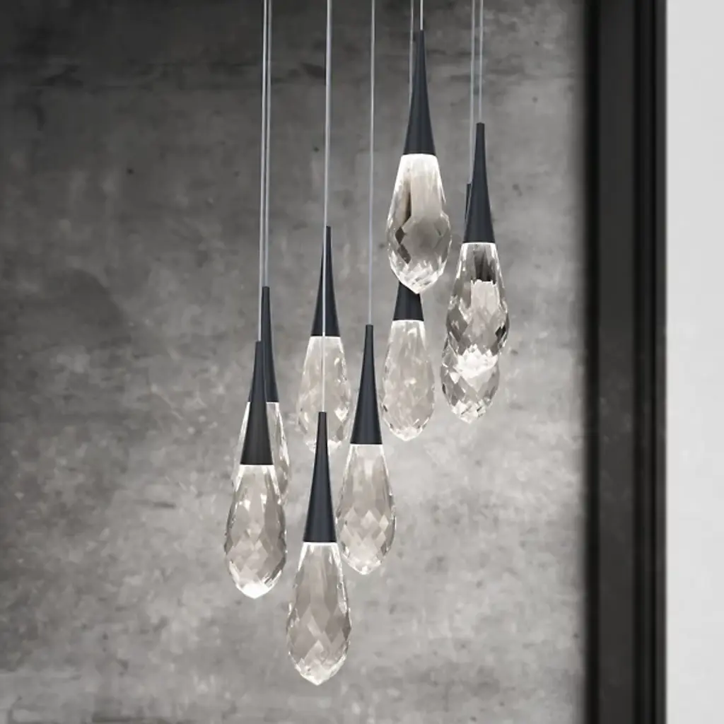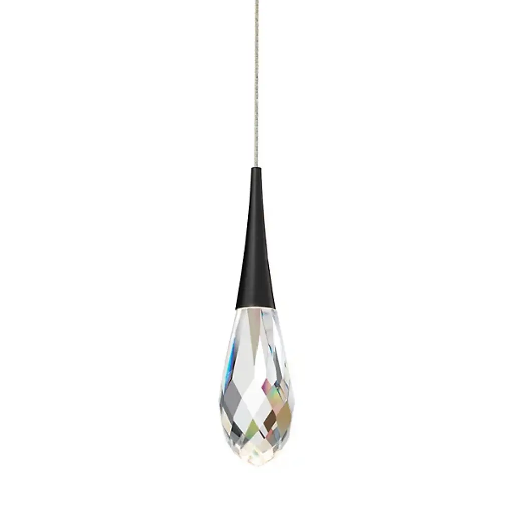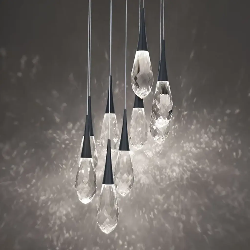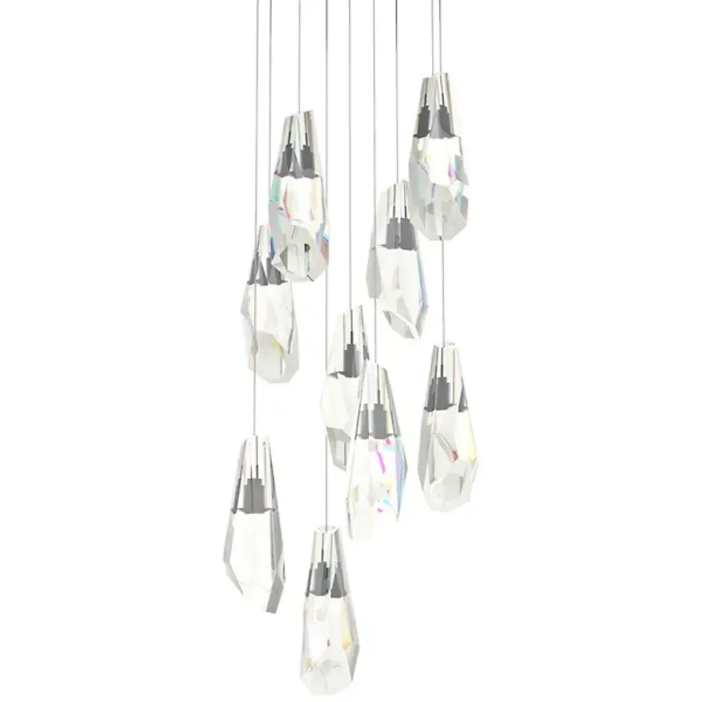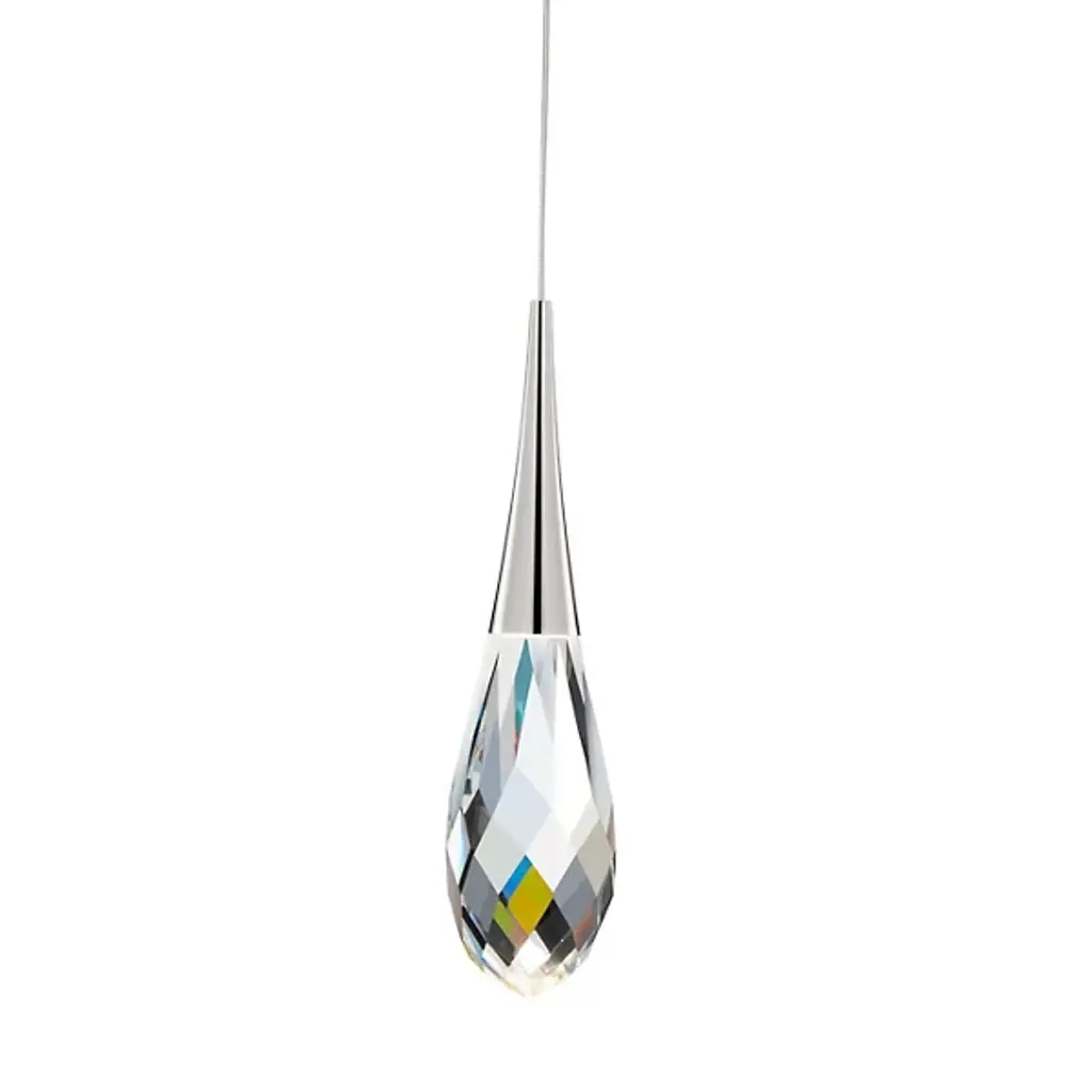 Vibrant and arresting like the flowering plant by the same name. The Hibiscus LED Multi-Light Pendant from Schonbek Beyond is an emotional silhouette, using its glass facets as a canvas for stunning reflected color and highlights. The pendant feels comfortable in the room through its familiar teardrop shapes. These shapes hang with a feather-light quality in the air using a fine cord. The metal lamp holders kick off the pendant’s graphic silhouette as a pointed form with a bold metallic finish. Rounded, faceted crystal diffusers complete the teardrop with a brilliance that comes across with only a hint of ambient light. The many cuts of the crystal pop with highlights thanks to the clean downstream illumination from the LEDs.