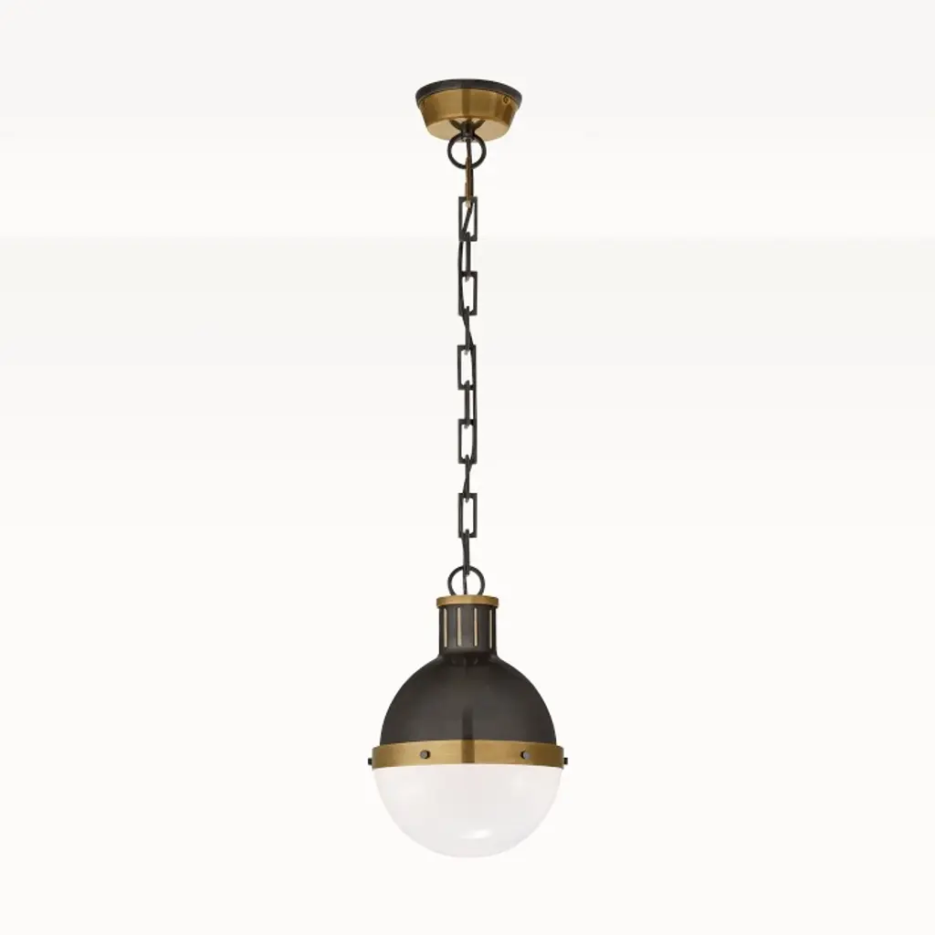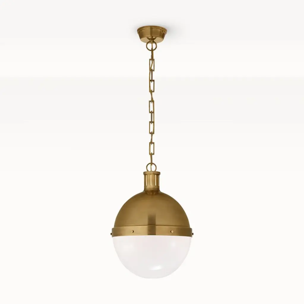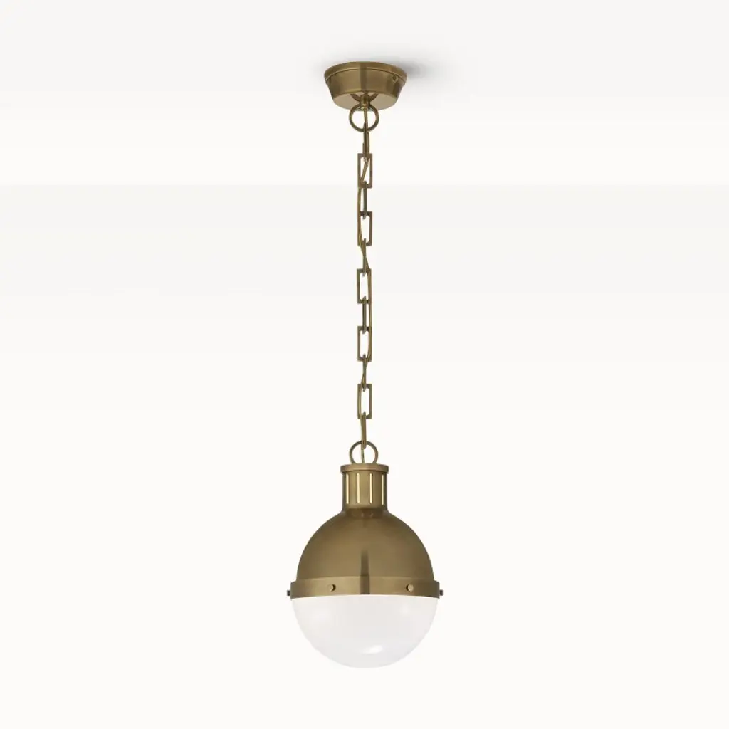 Cast warm light over a dining table or kitchen island with this pendant. Inspired by antique lamps, it pairs a riveted shade with an opaque glass globe that softens the glow.