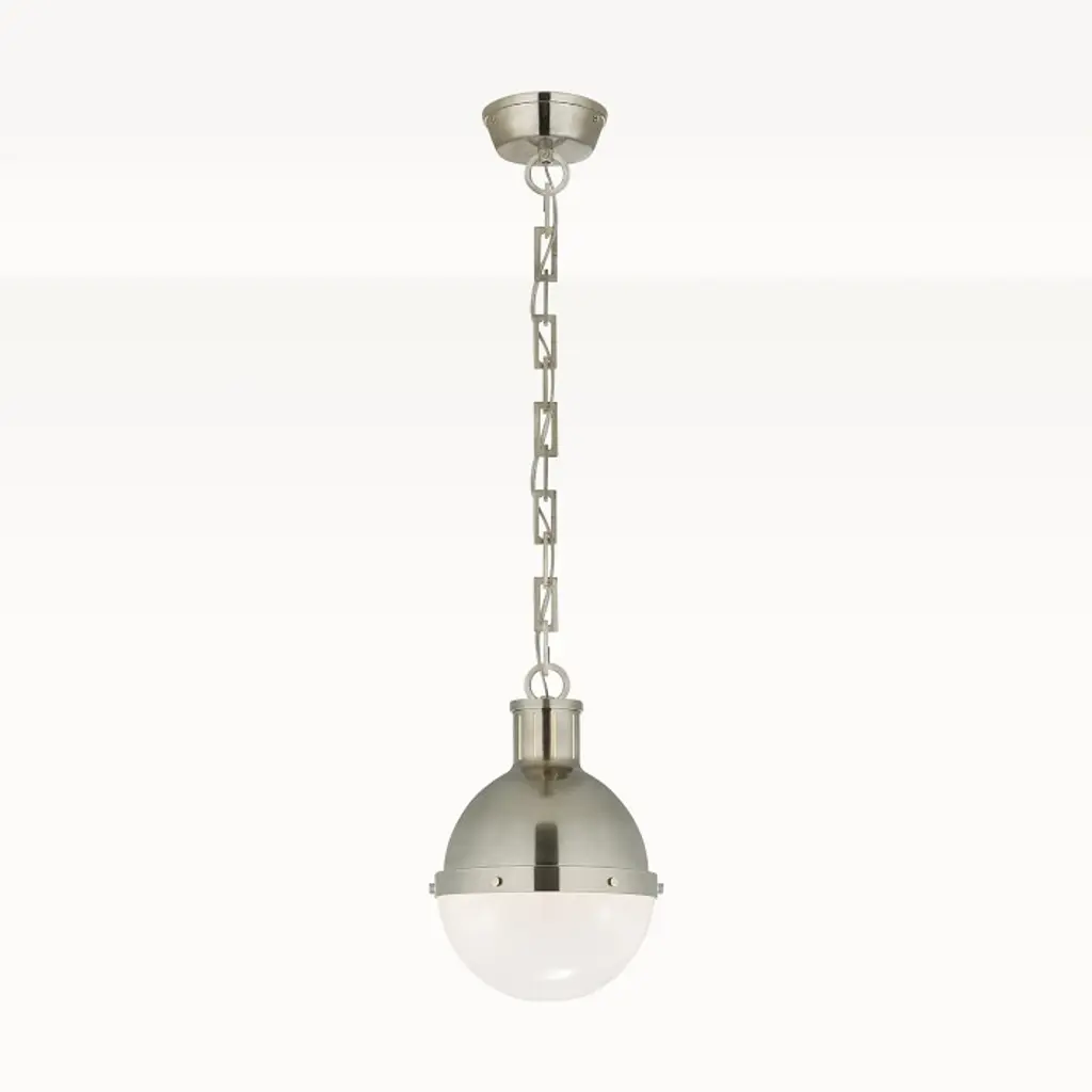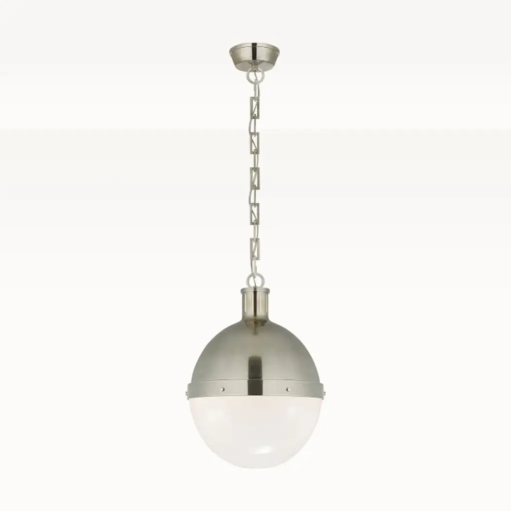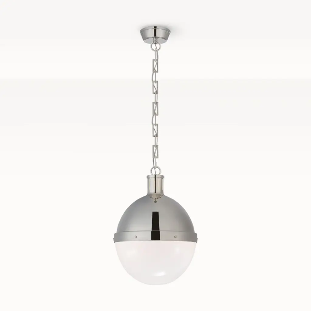 Cast warm light over a dining table or kitchen island with this pendant. Inspired by antique lamps, it pairs a riveted shade with an opaque glass globe that softens the glow.