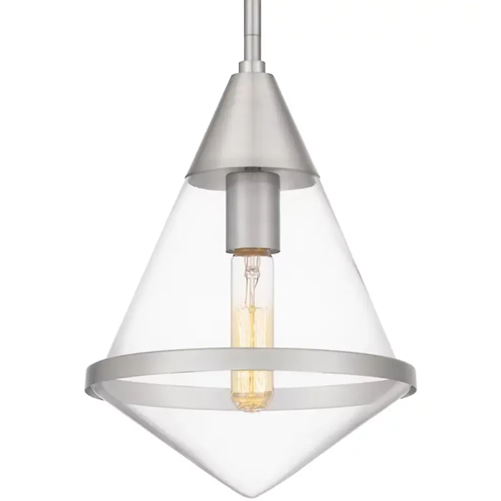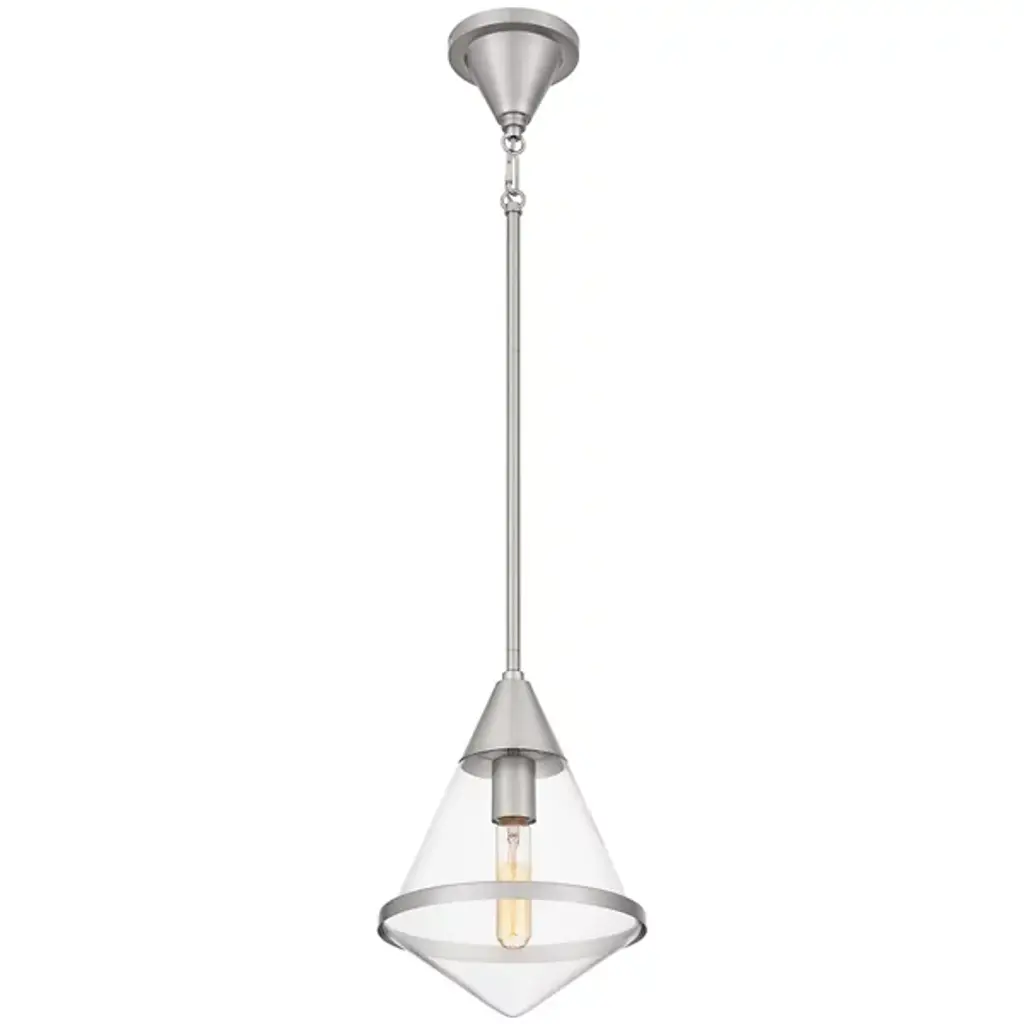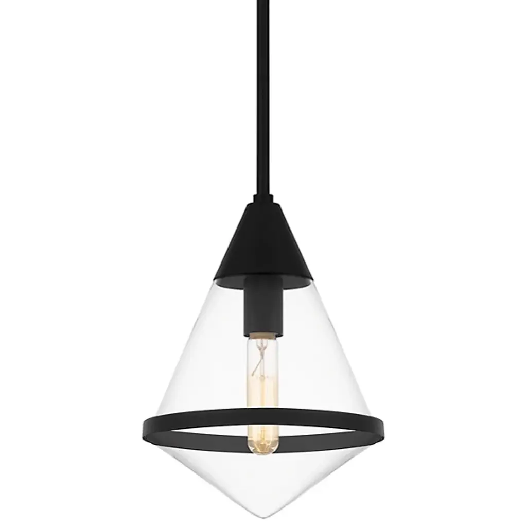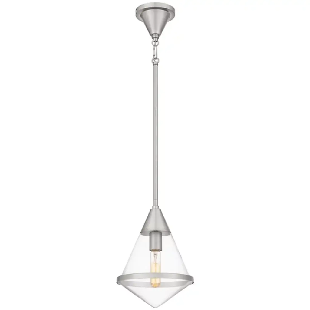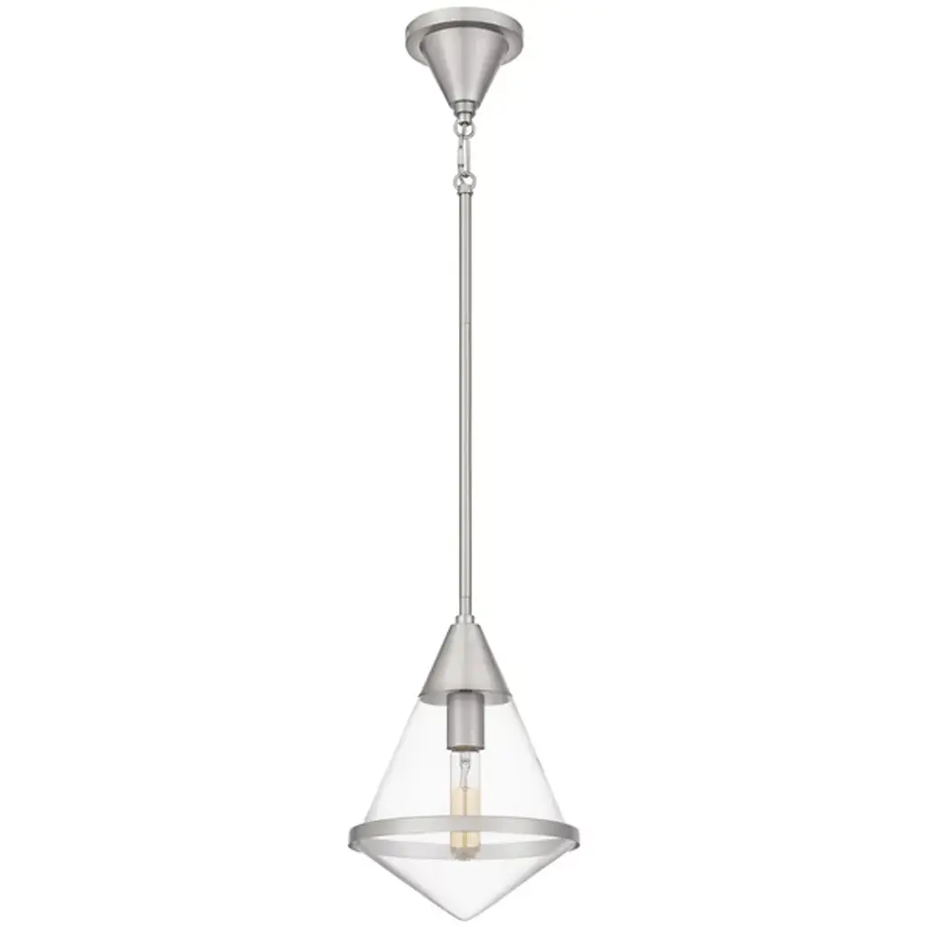 The Hidalgo Mini Pendant from Quoizel stands out with its clean lines and bold geometric shape, making it a focal point in any living space. The clear glass accentuates its unique and transitional silhouette. Whether hung alone or grouped over a kitchen island, bar area, or table, Hidalgo mini pendants add a touch of modern elegance and illuminate the area with style. Enhance your home decor with this striking piece that combines form and function effortlessly.