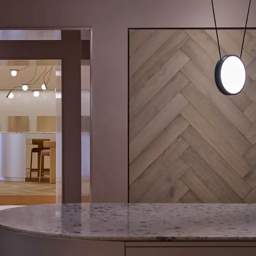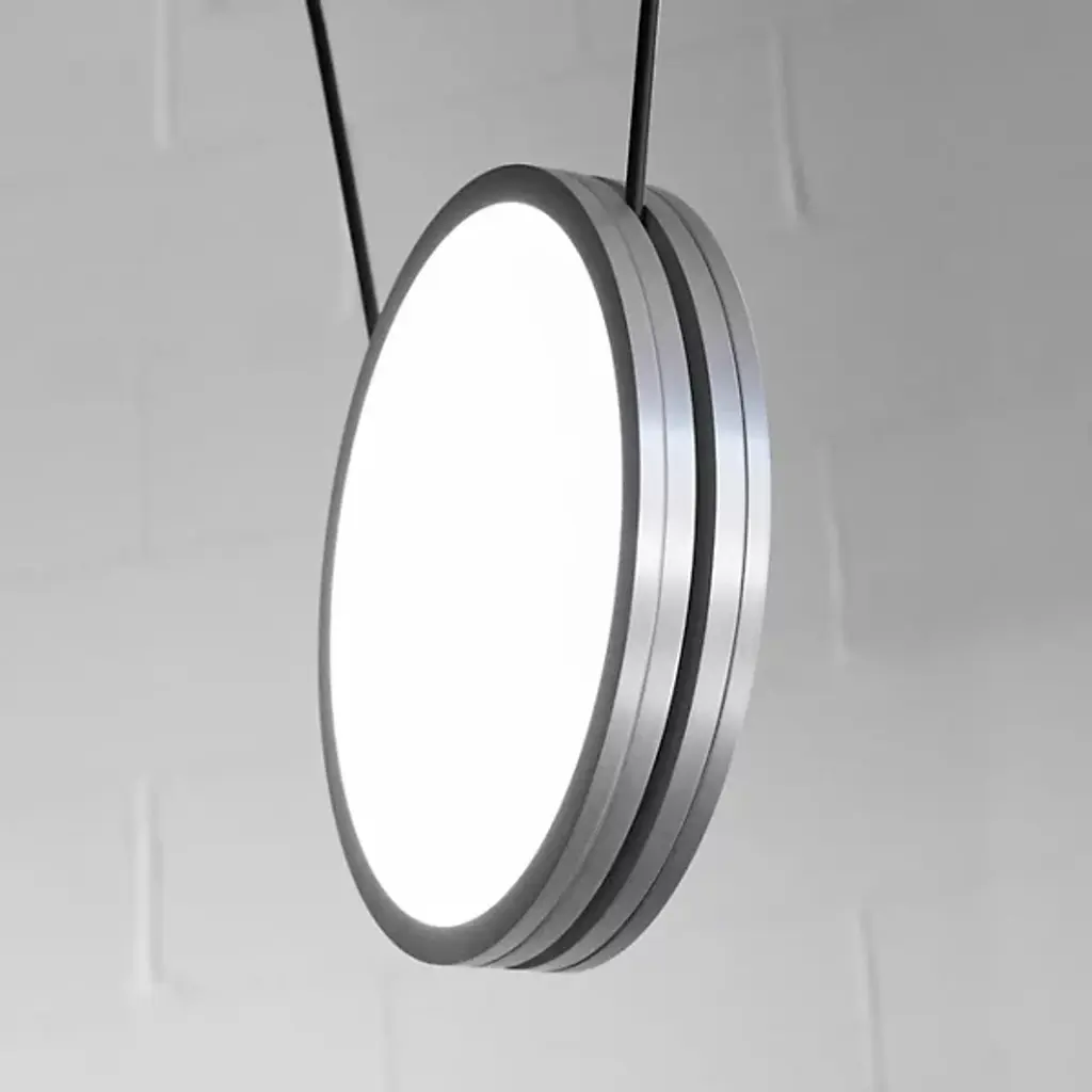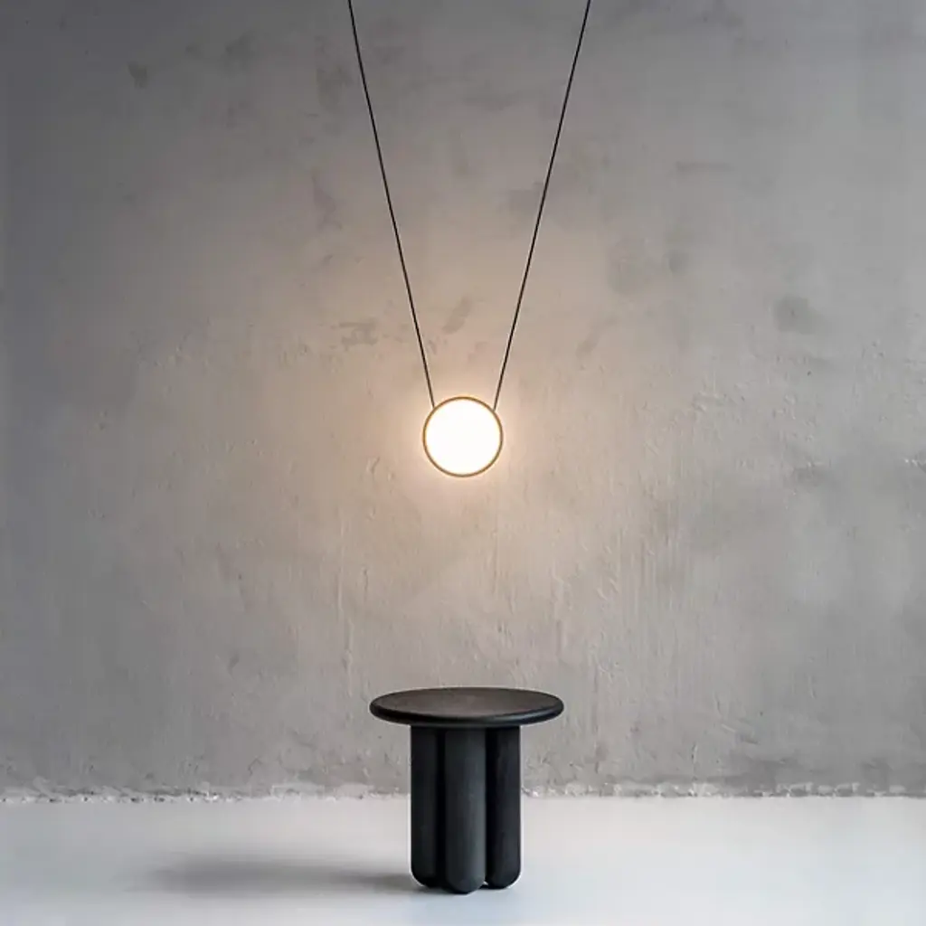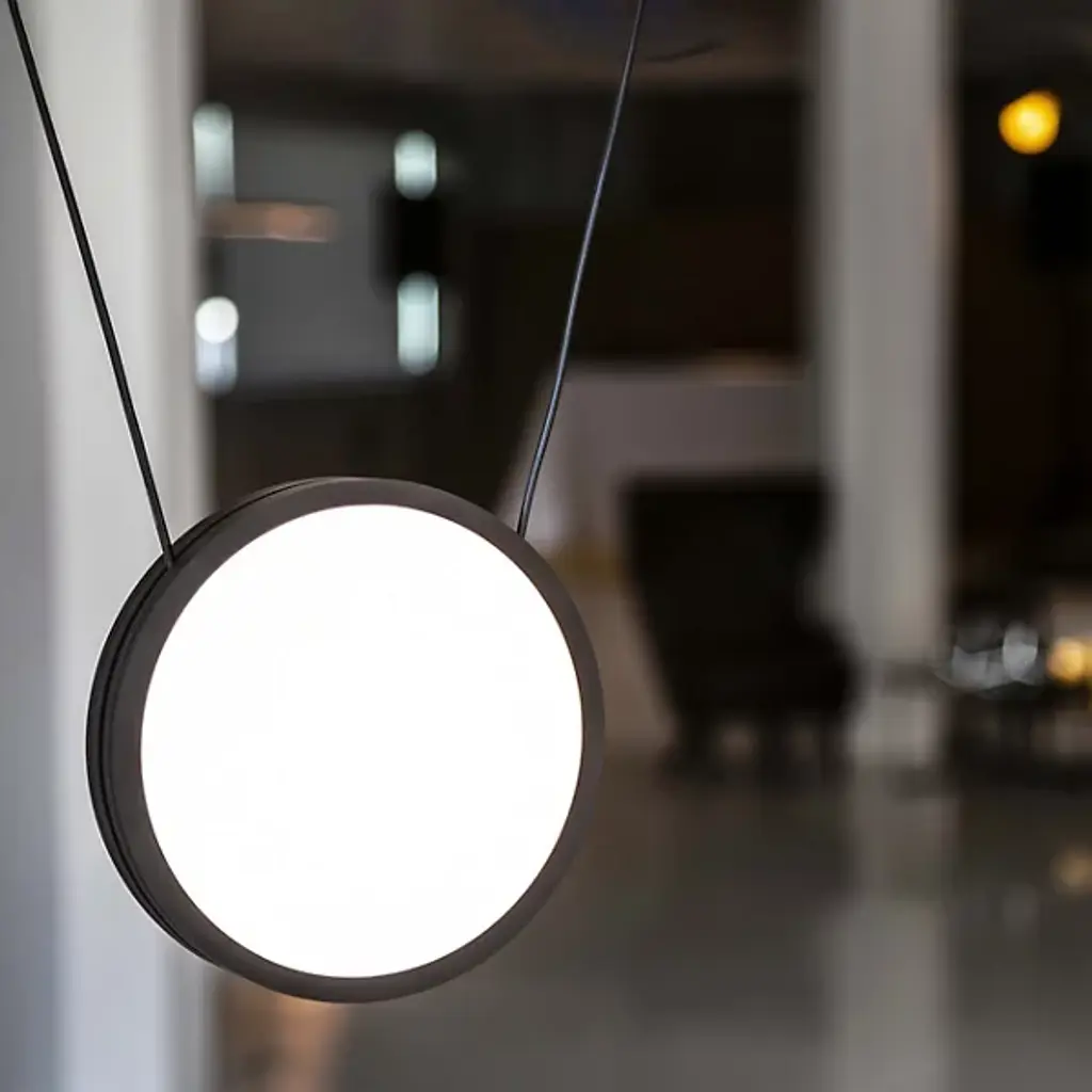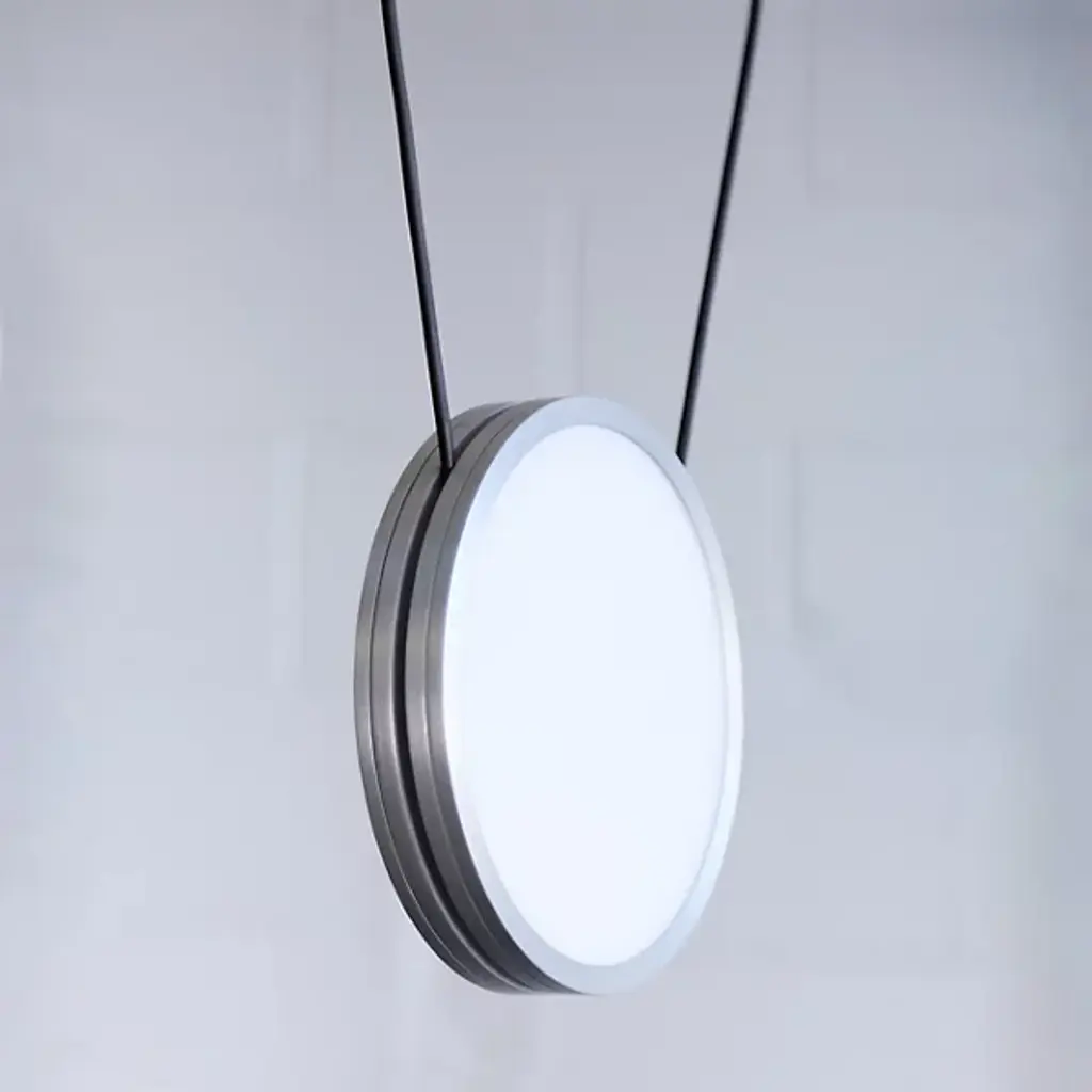 The Highwire LED Pendant from ANONY is a gravity-defying display of balance and tension. Suspended by custom matte-finished electrical cables, individually weighted disks hover effortlessly in space, forming a dynamic composition. Designed with flexibility in mind, this modular fixture adapts to different room layouts while diffused light radiates from both sides of each disk, casting a soft, even glow. Made from aluminum, steel, and polycarbonate, this damp-listed pendant blends thoughtful engineering with a refined contemporary aesthetic.