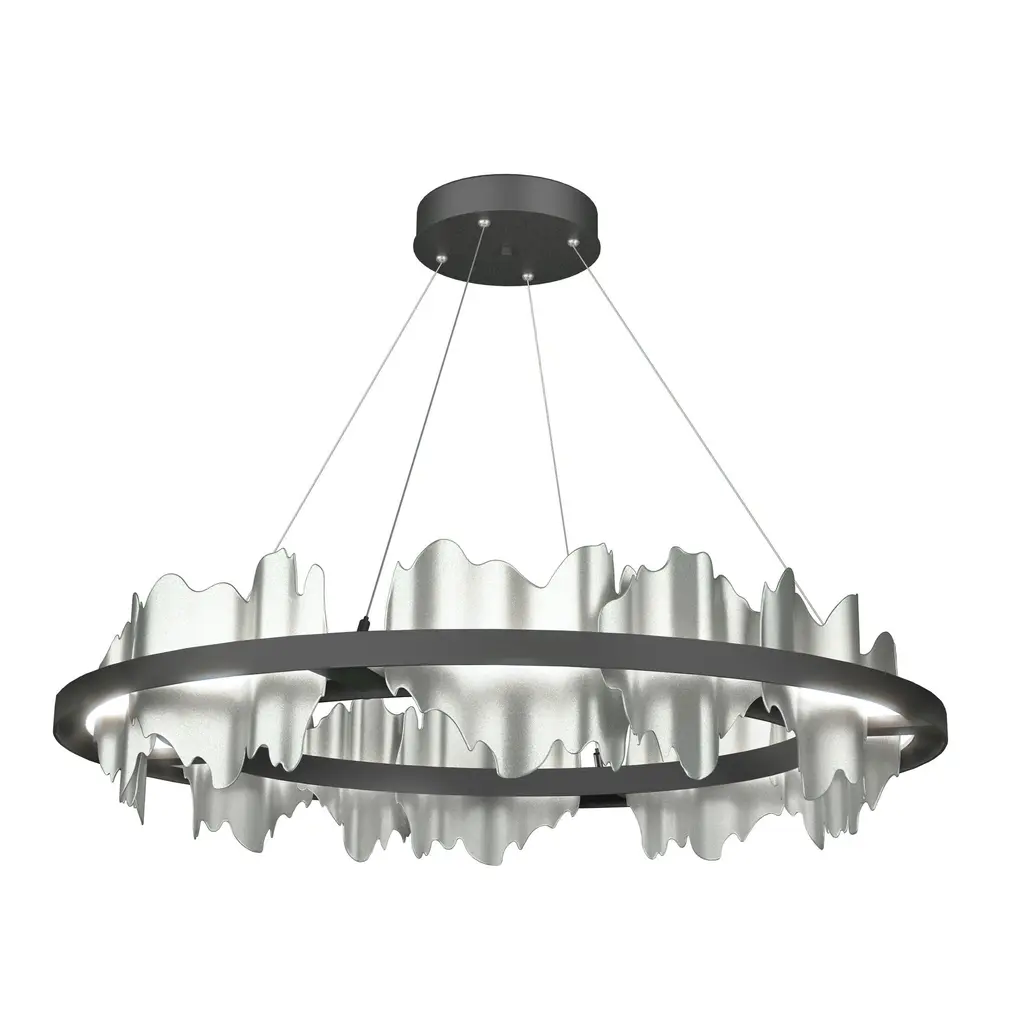 This magnificent and dramatic Hildene Circular pendant, with its crafted hills and valleys creating shadow and light, is a focal piece in any space. Part of the Hildene Collection, this large pendant's curved metal plates are awash in up-and-down light emanating from the LED lightguide encased in its circular frame. The Hildene is offered with a two-toned finish option, with the canopy and frame in one finish, and the metal plates in a choice of accent colors. Also available as a linear cable-hung pendant, a large linear rod-hung pendant, and a wall sconce.